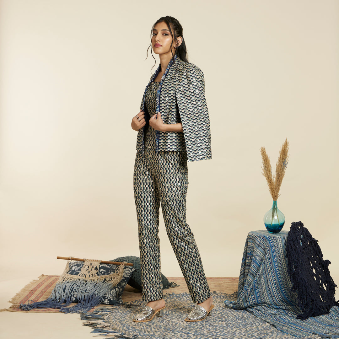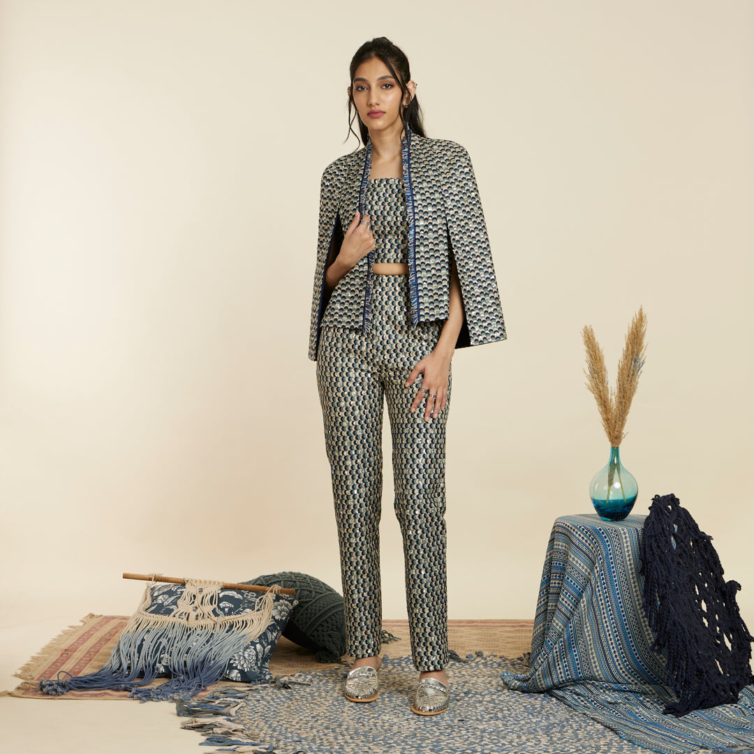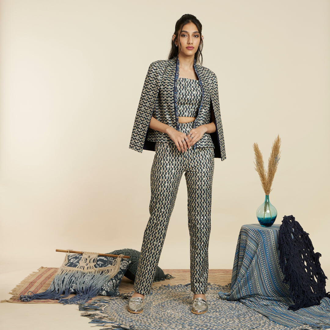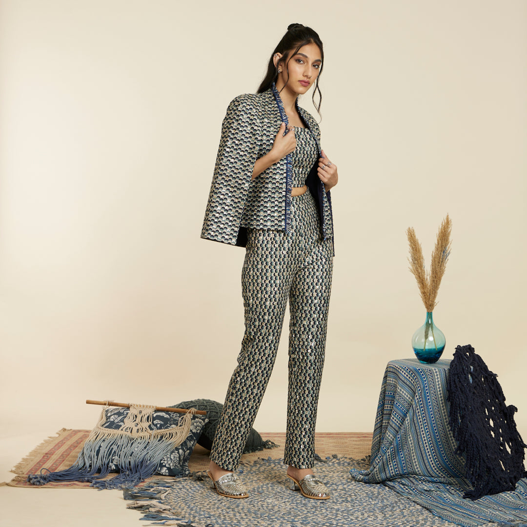 Featuring a blue scallop embroidered noor jacket paired with bustier and pants