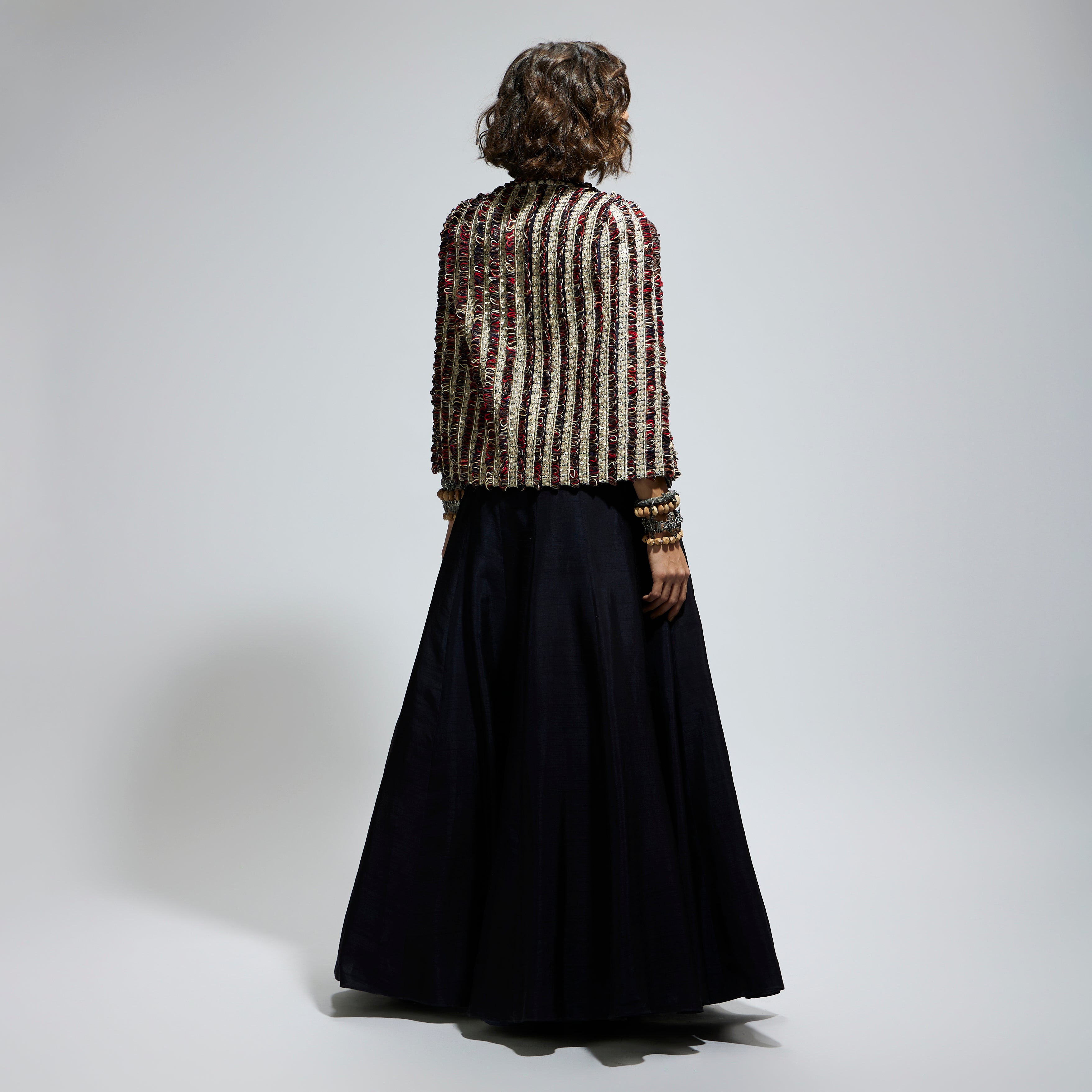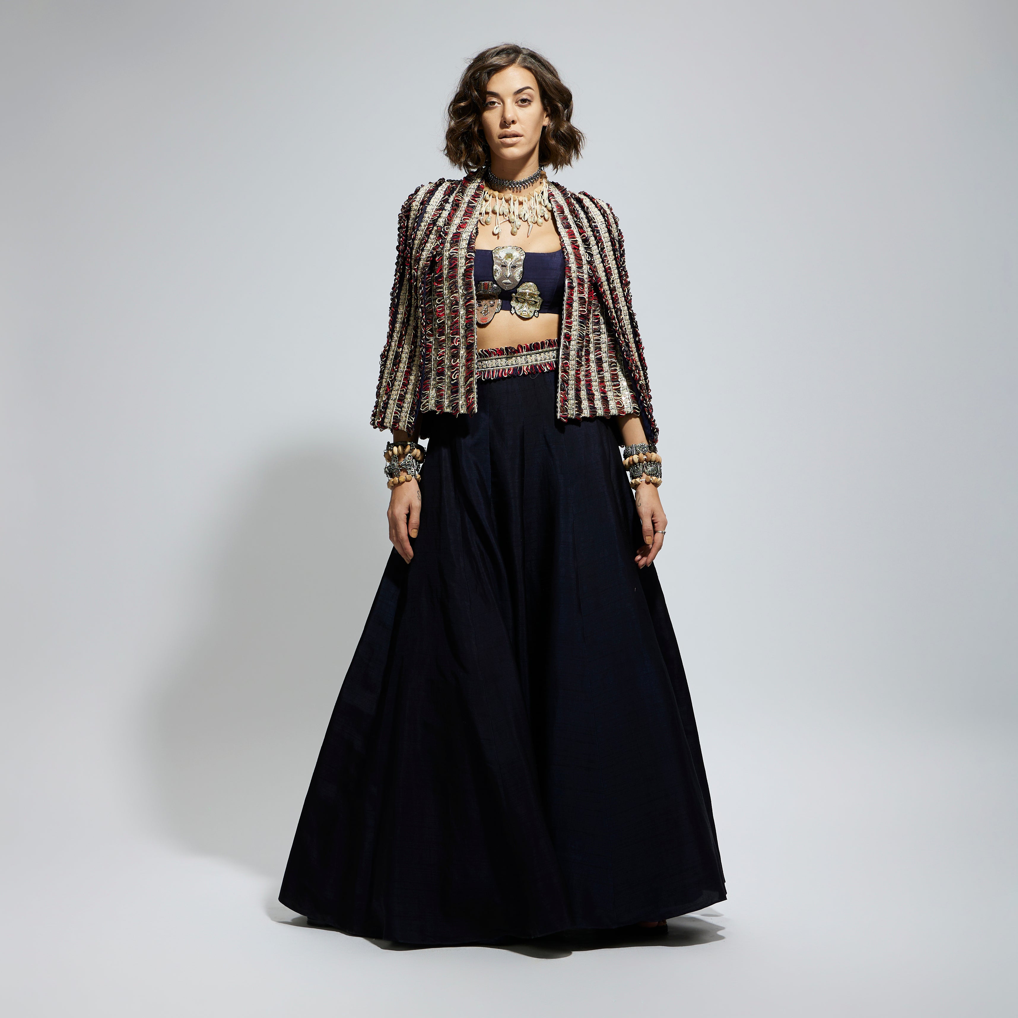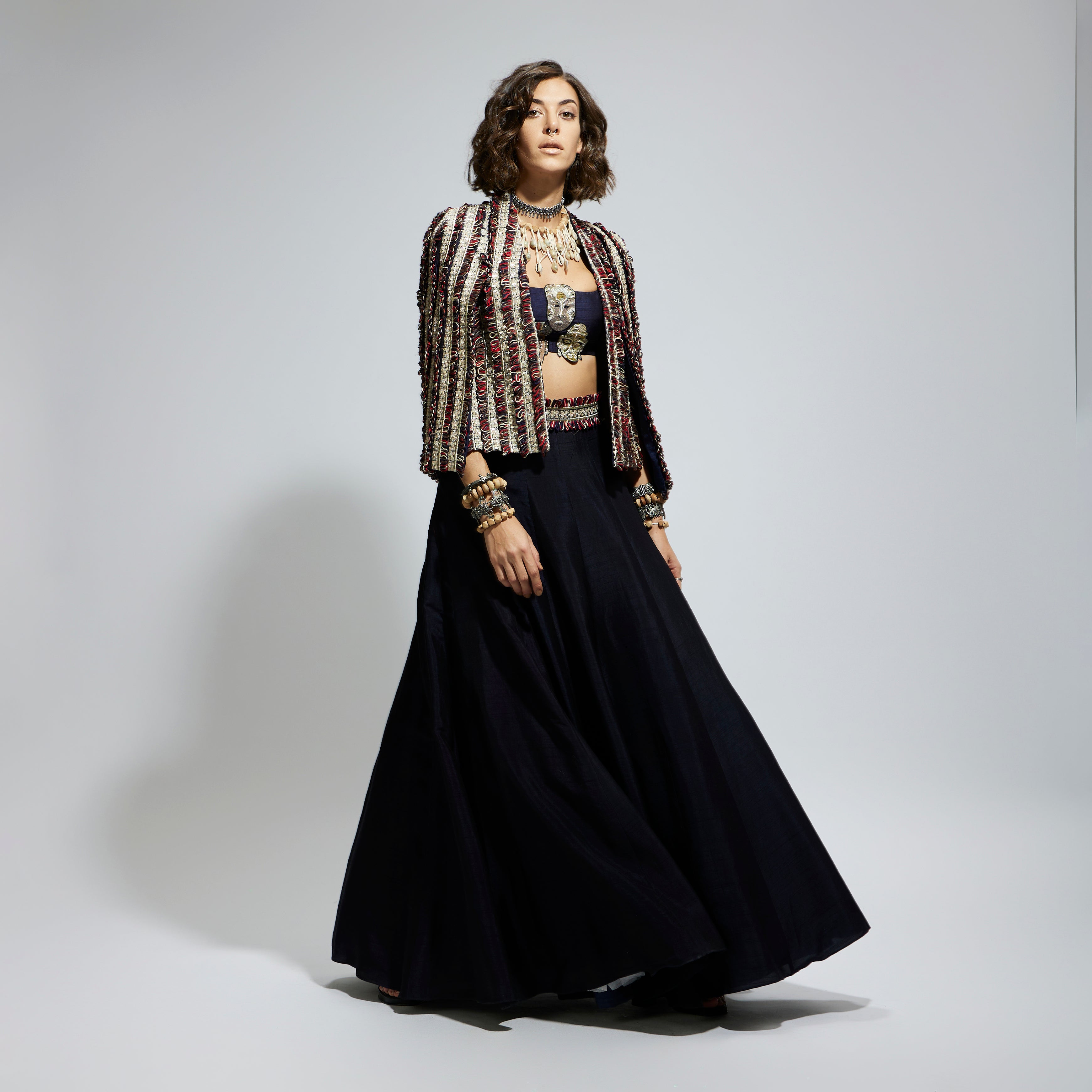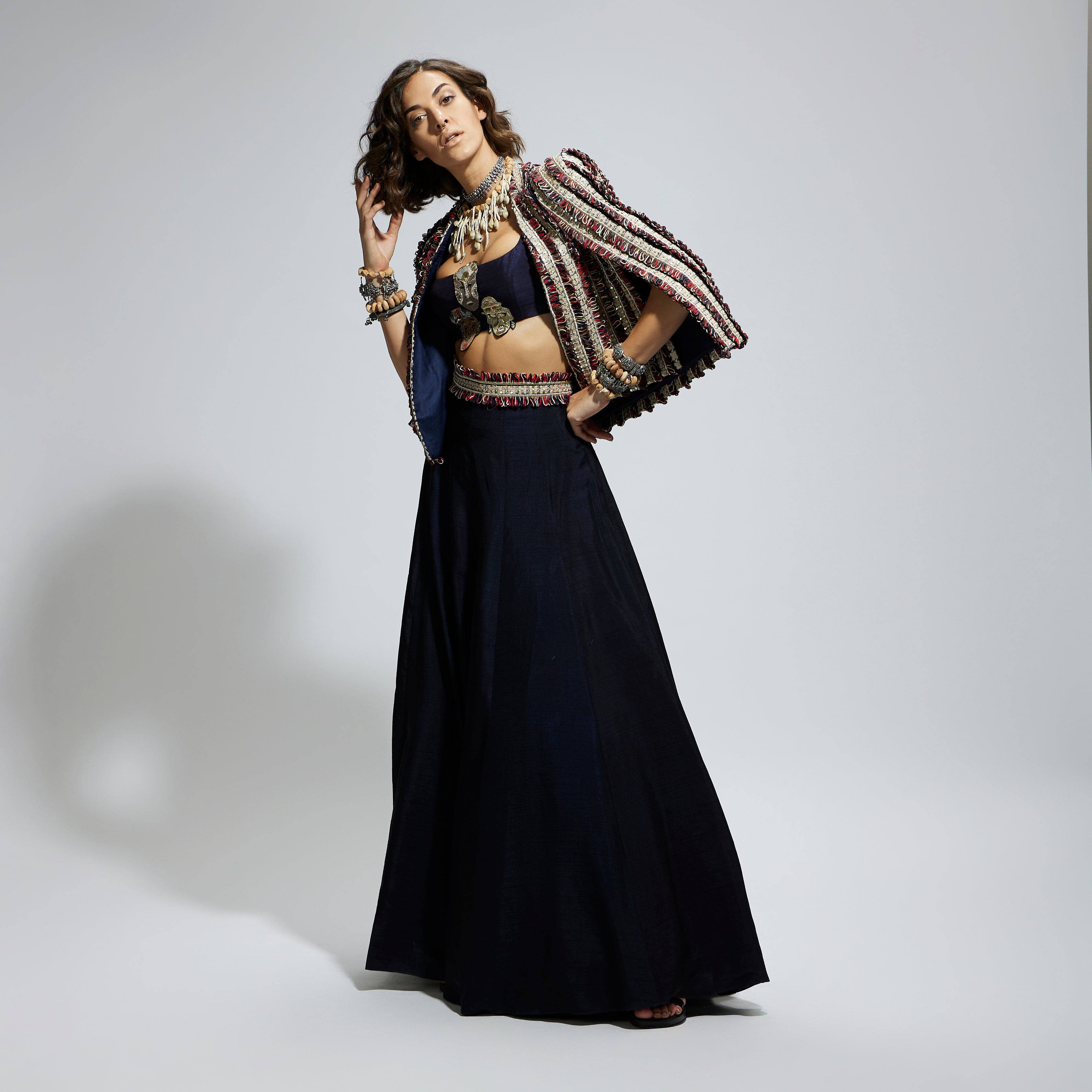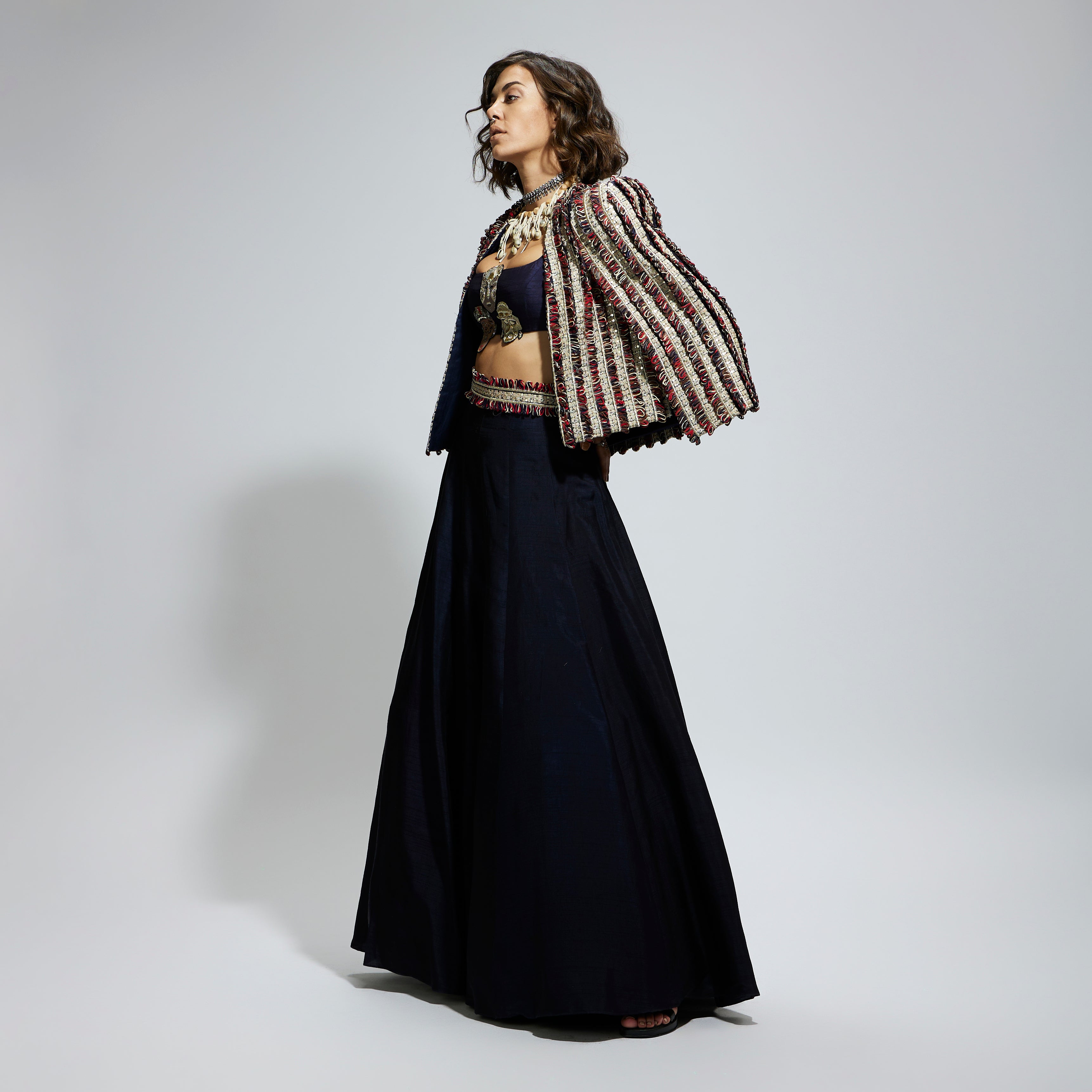 BLUE TEXTURED EMBELLISHED CAPE JACKET PAIRED WITH MASK APPLIQUE BUSTIER AND LEHENGA