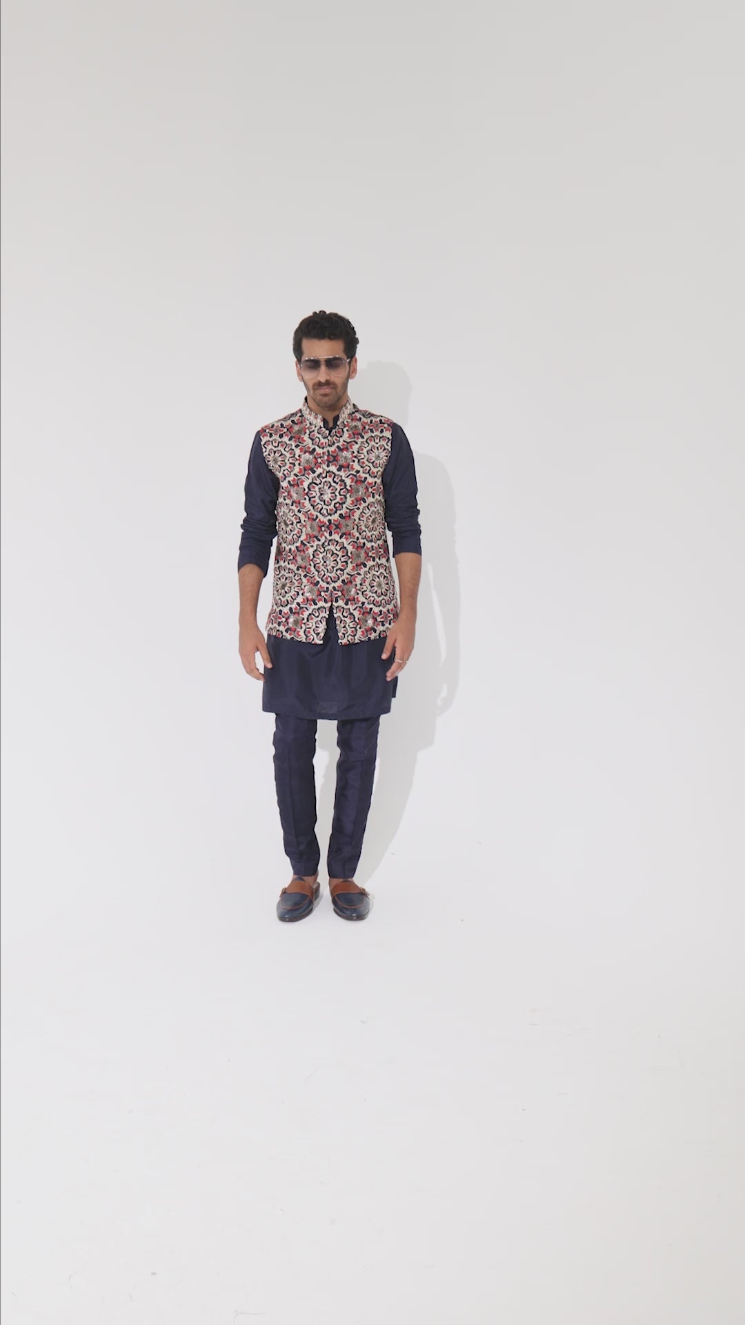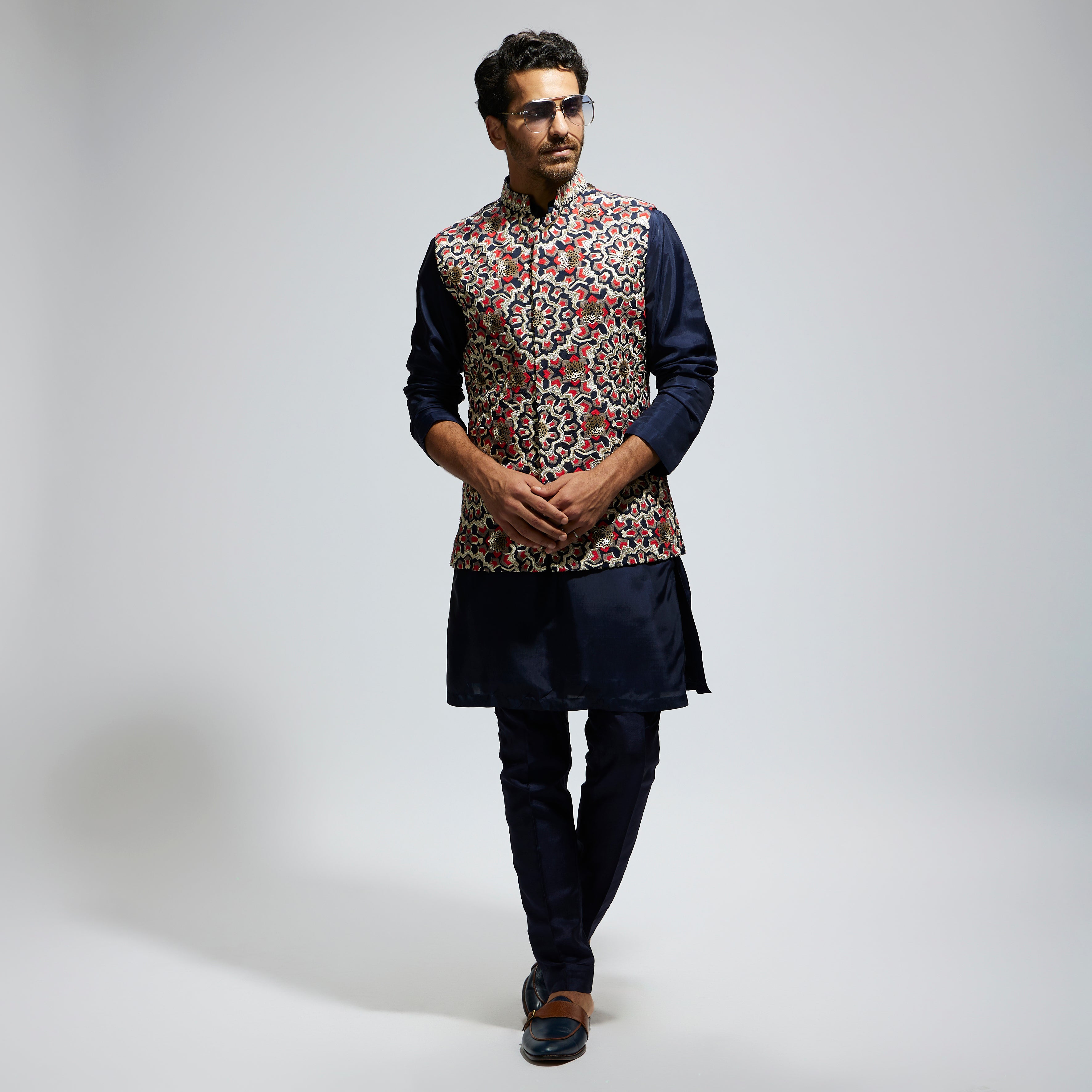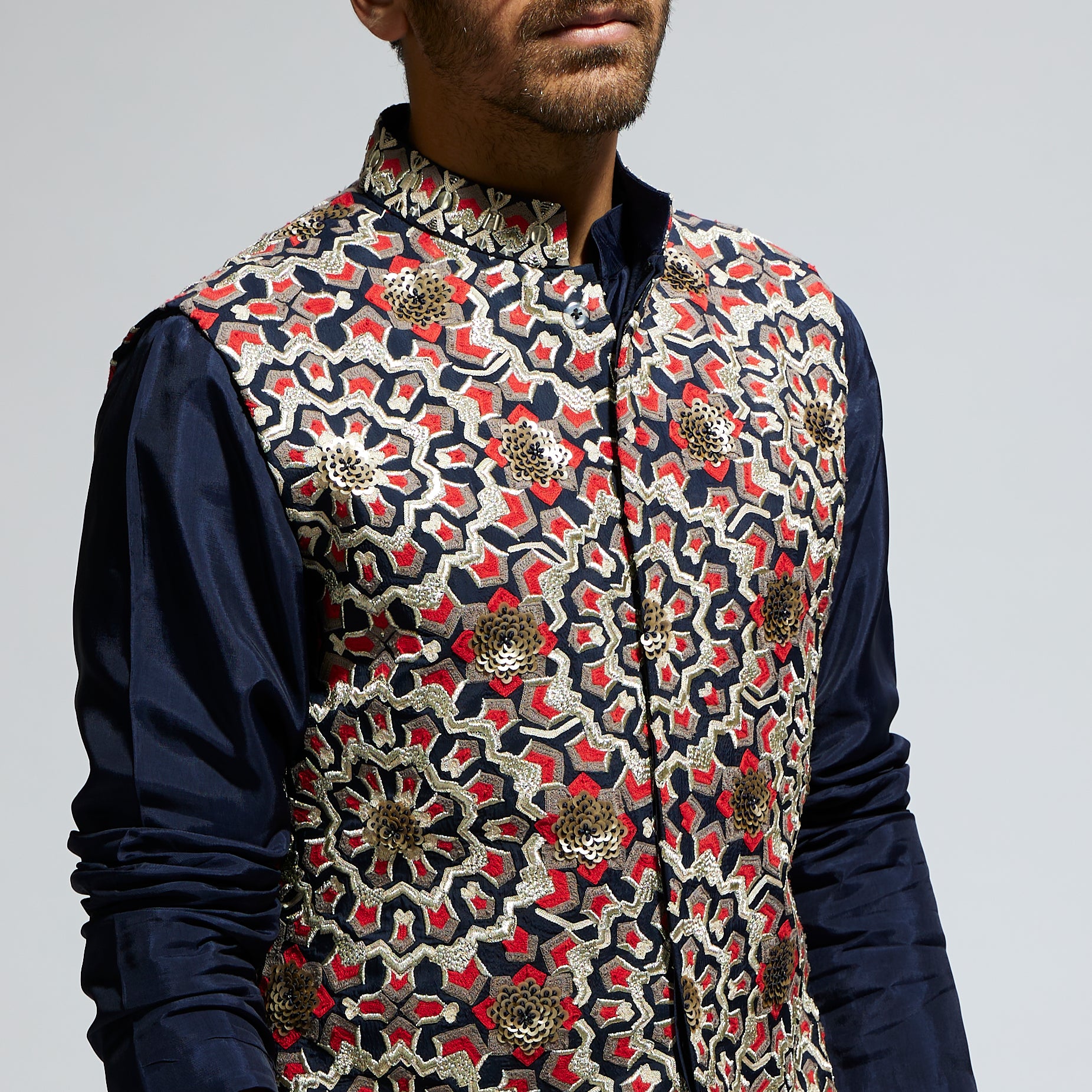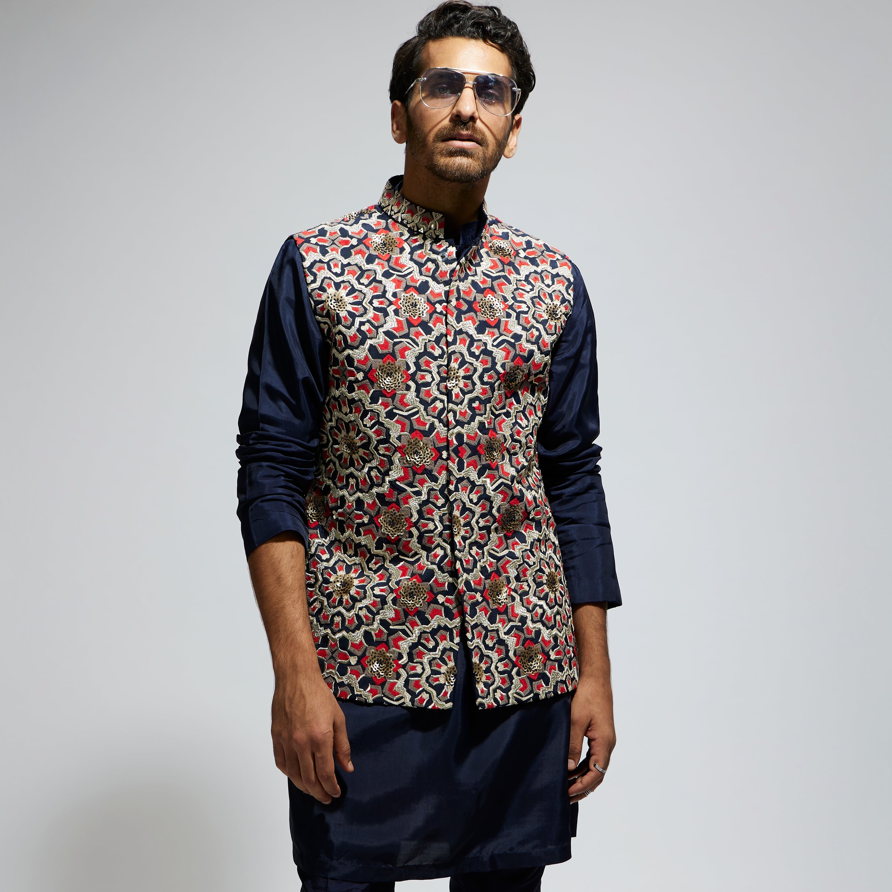 Featuring a blue thread embroidered bundi, fabric crepe, and Component 1.