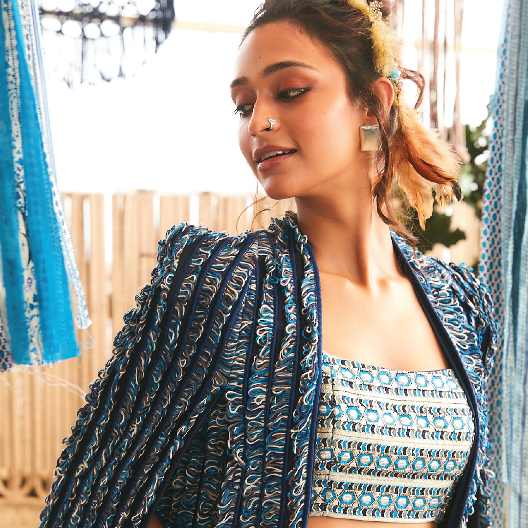 Featuring a blue textured noor jacket set paired with an embellished bustier and nushrat skirt