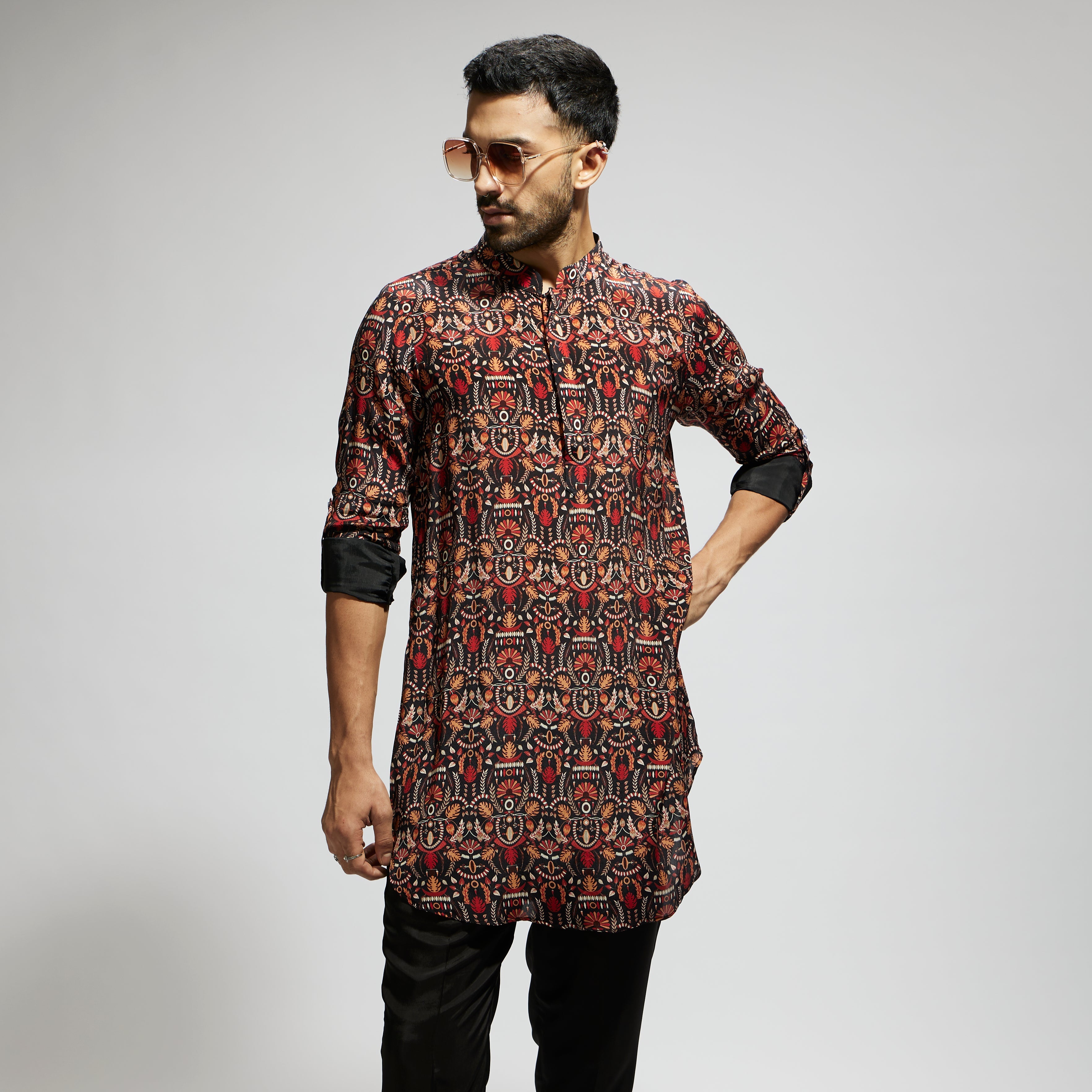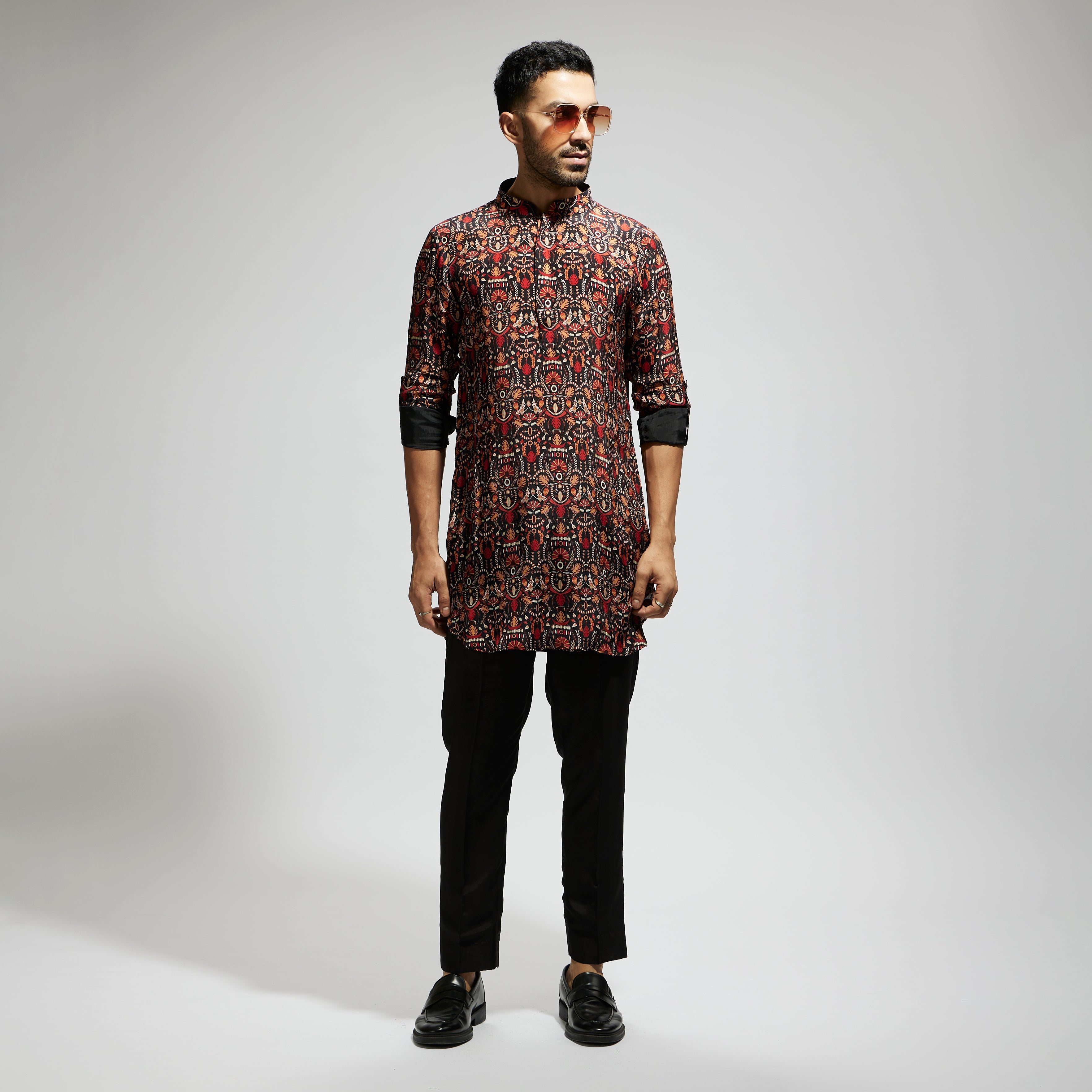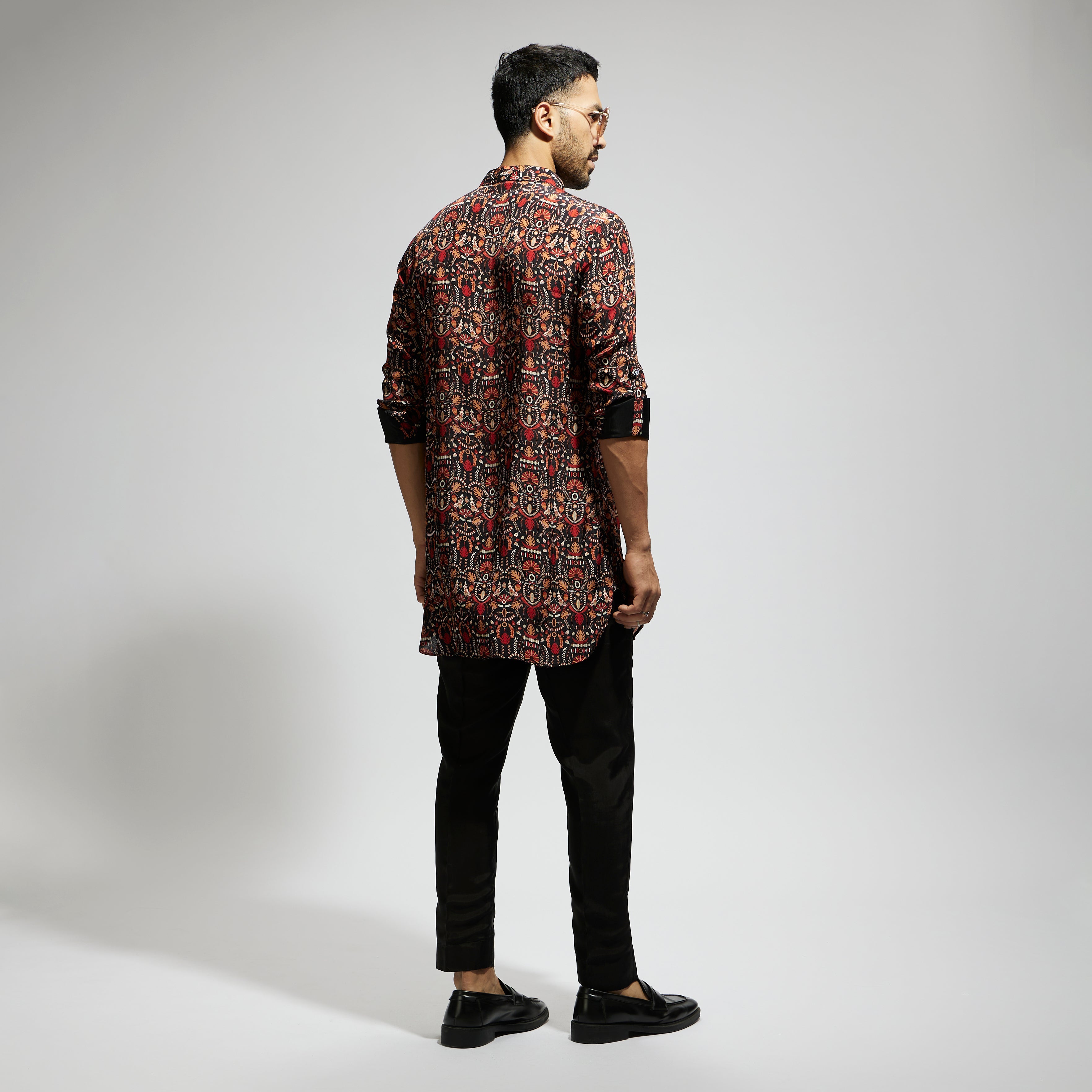 Featuring a black leaf jaal print rolled up sleeves kurta, fabric crepe, and Component 1.