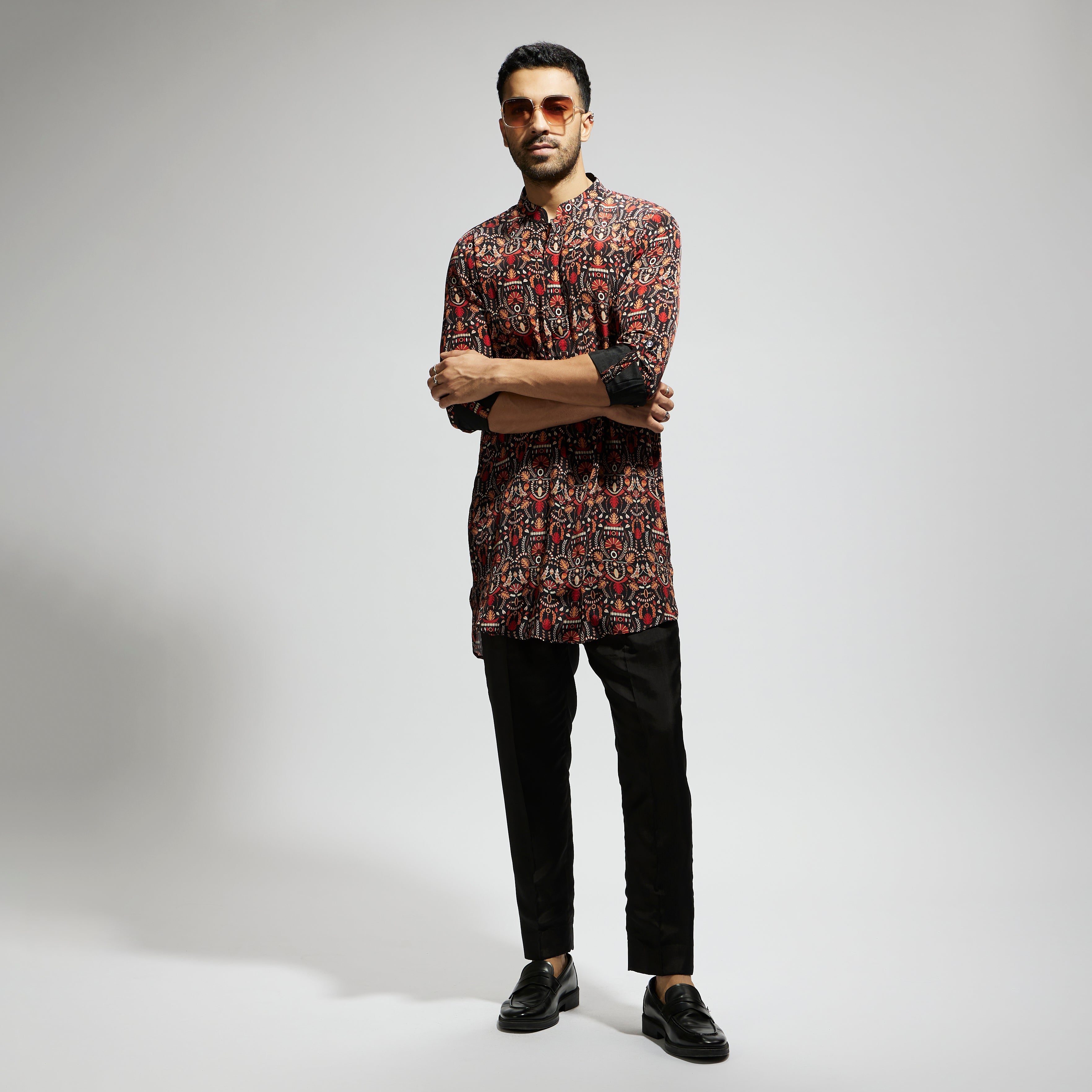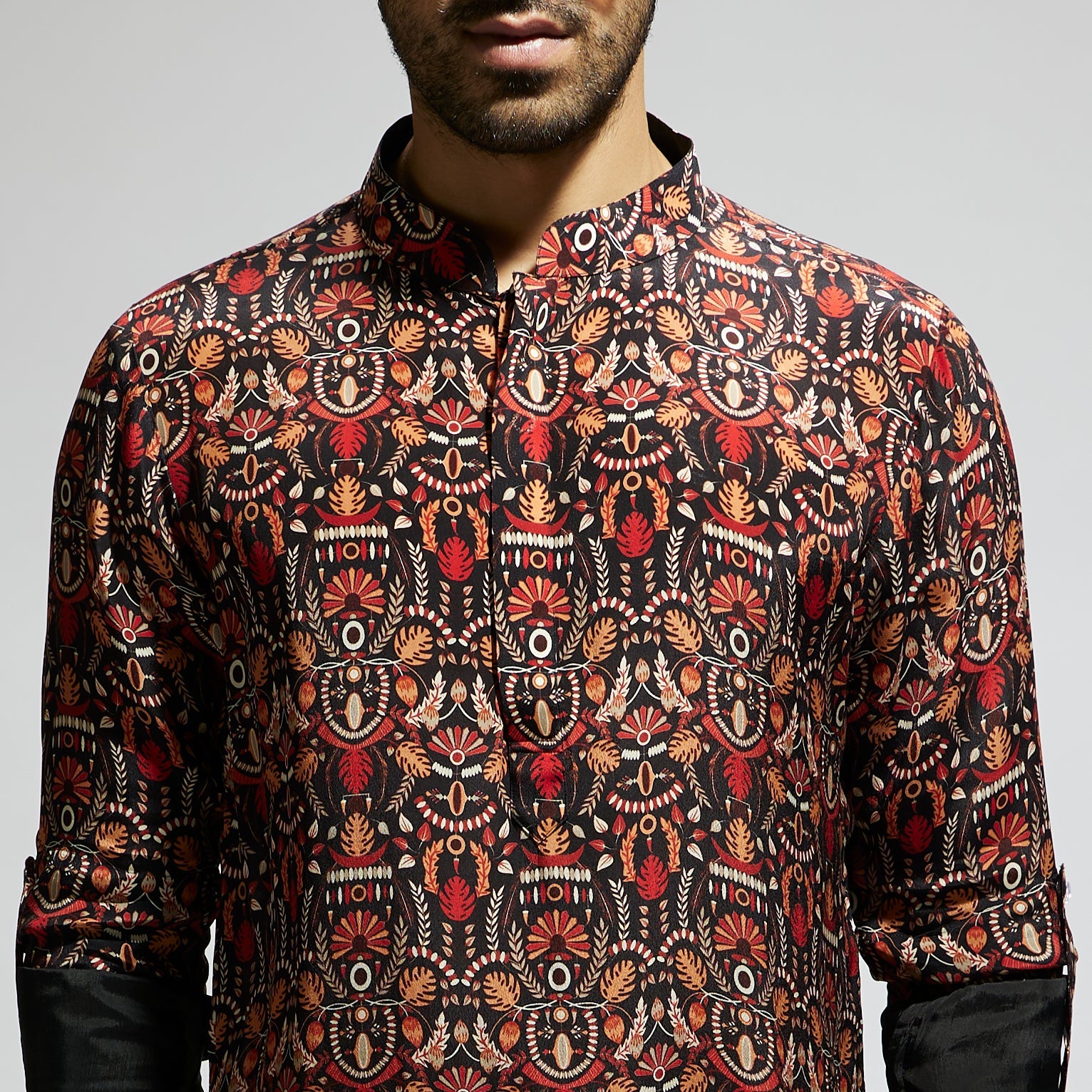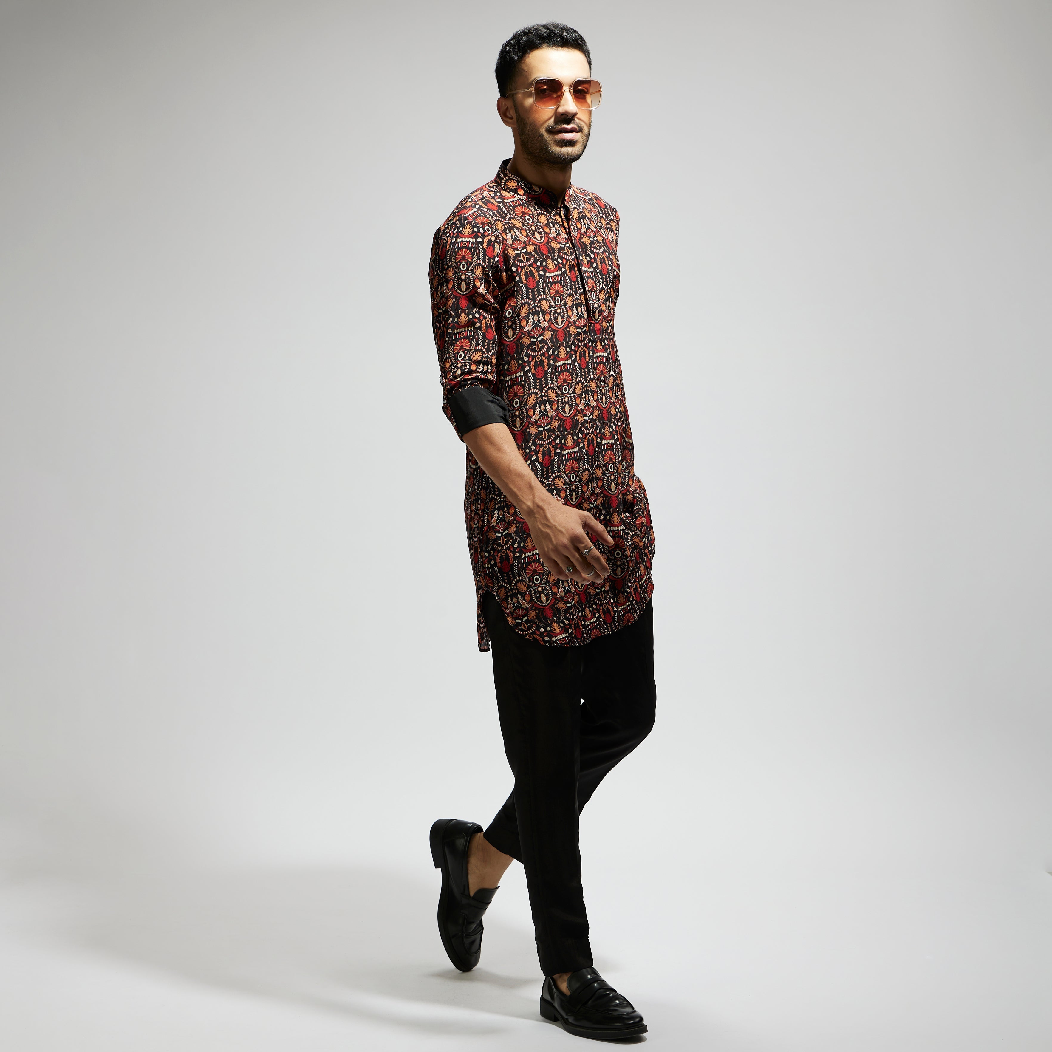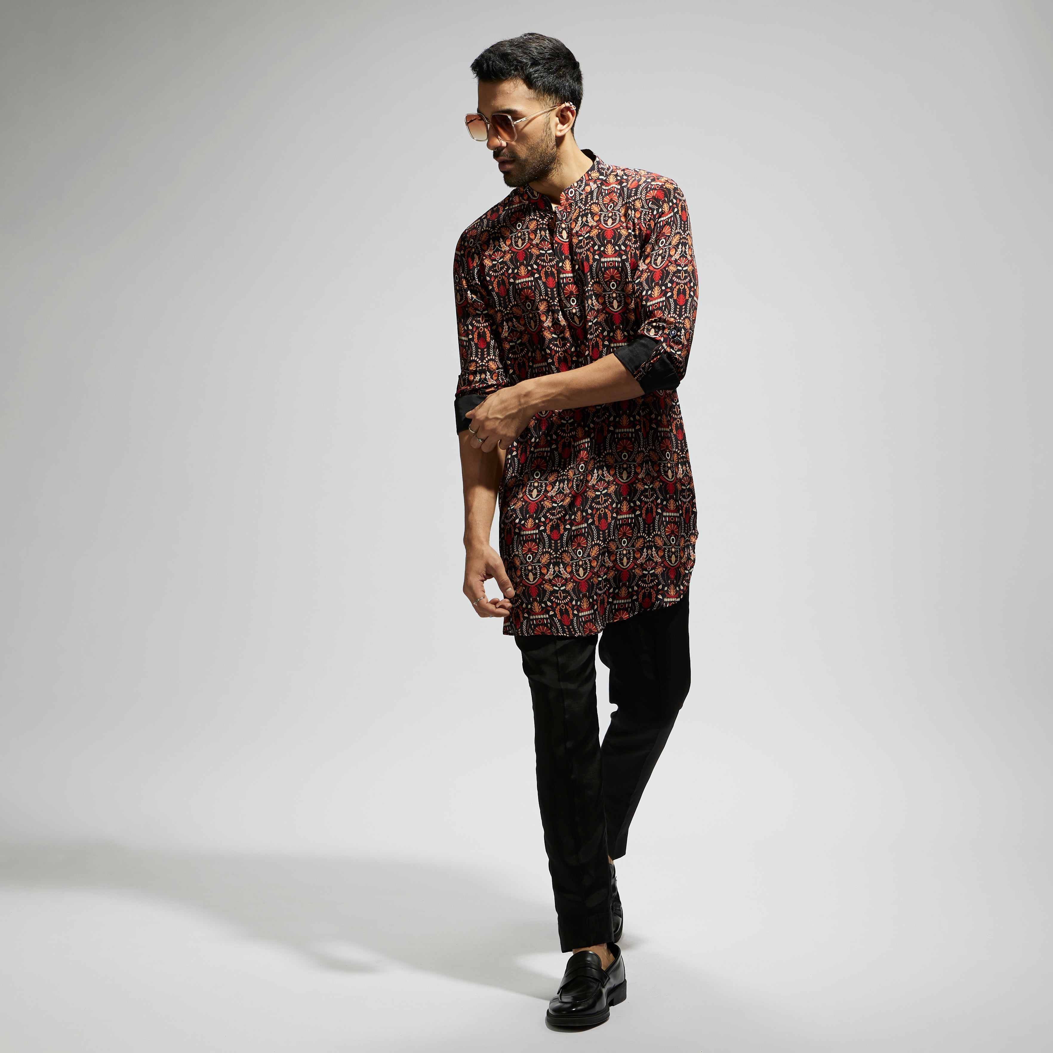 Featuring a black leaf jaal print rolled up sleeves kurta, fabric crepe, and Component 1.