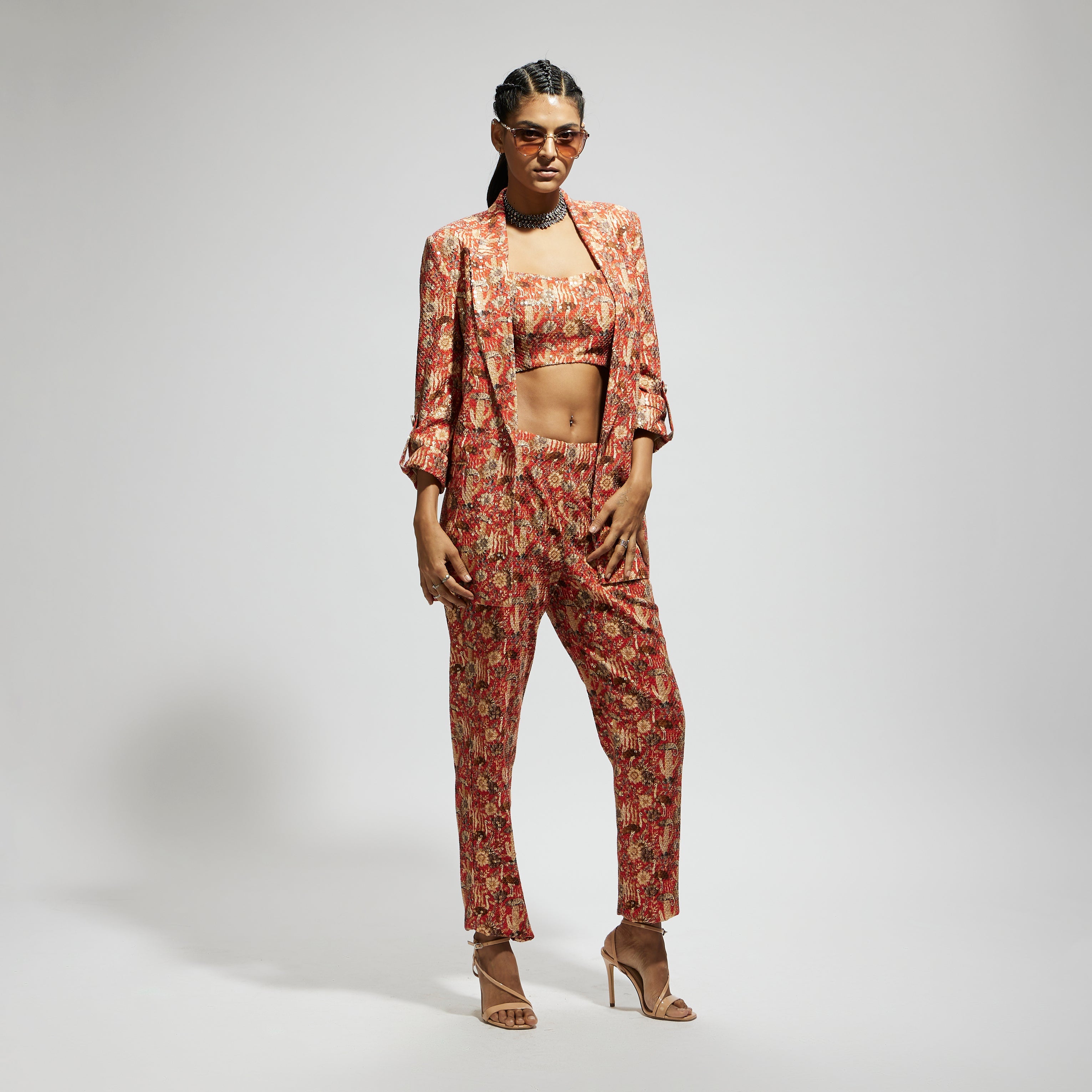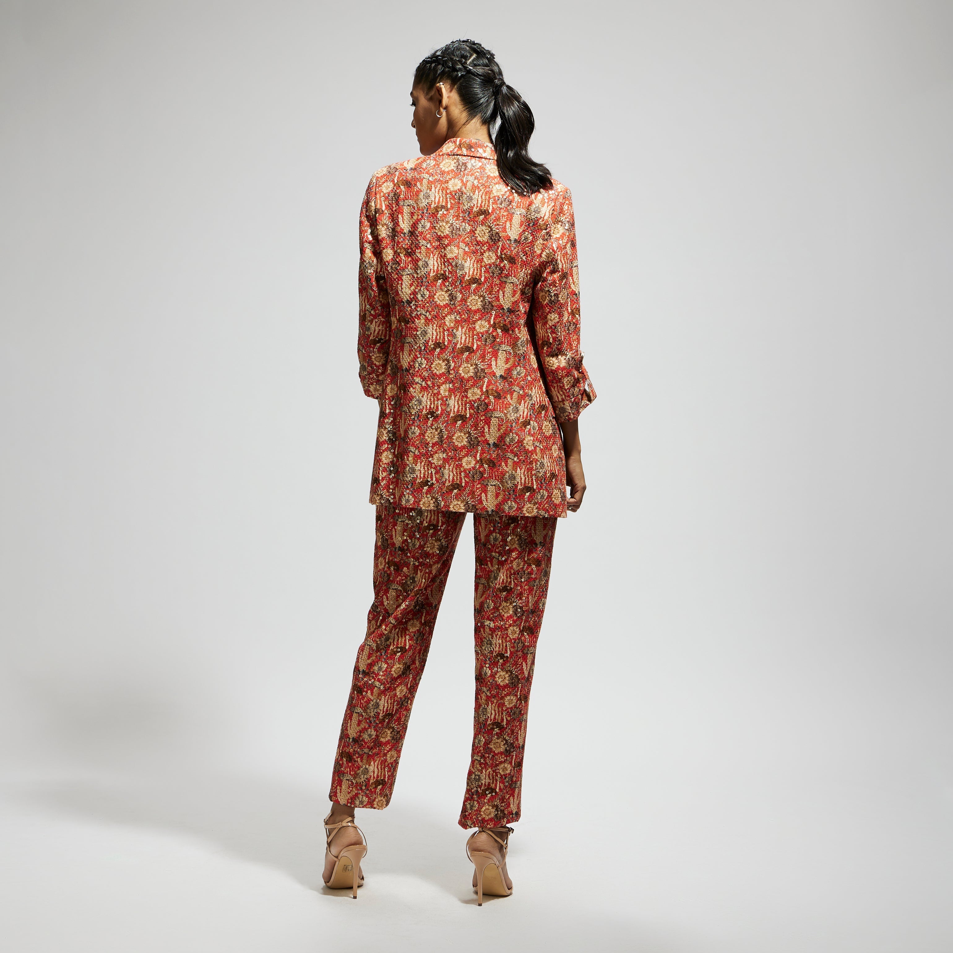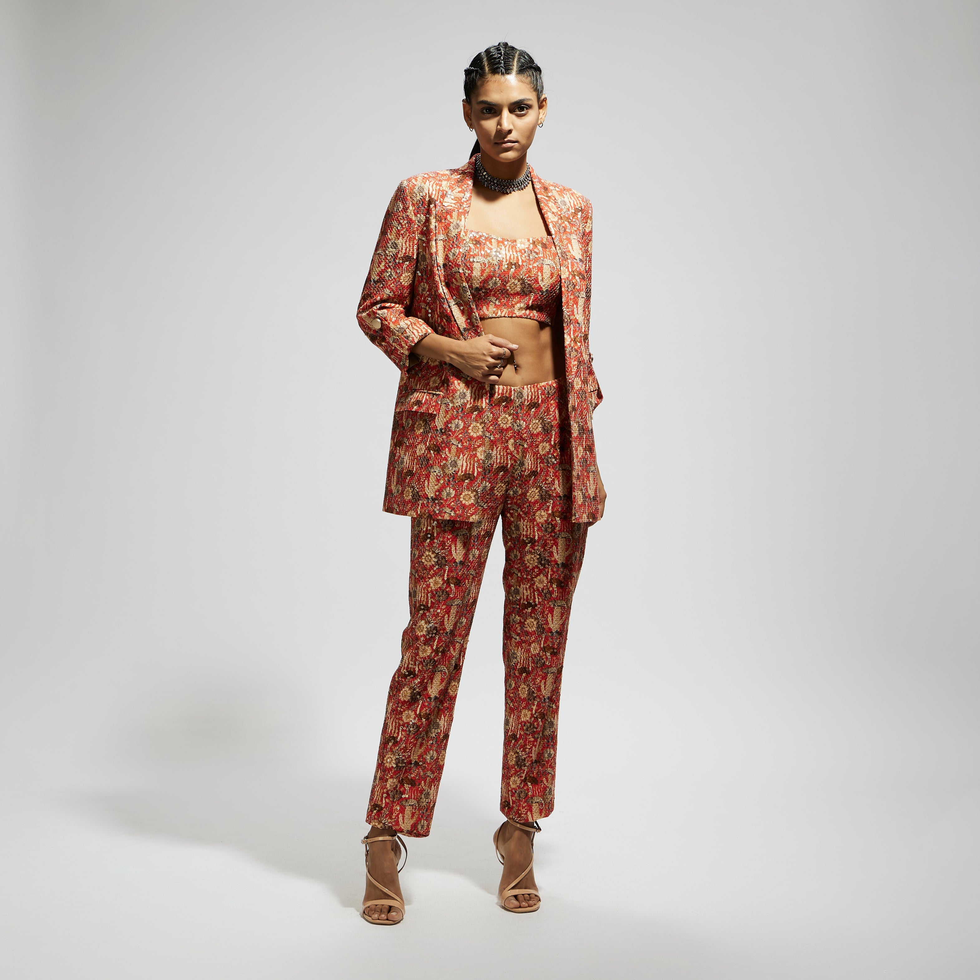 Featuring an orange jaal embellished blazer set, Fabric Sequins Component 3.