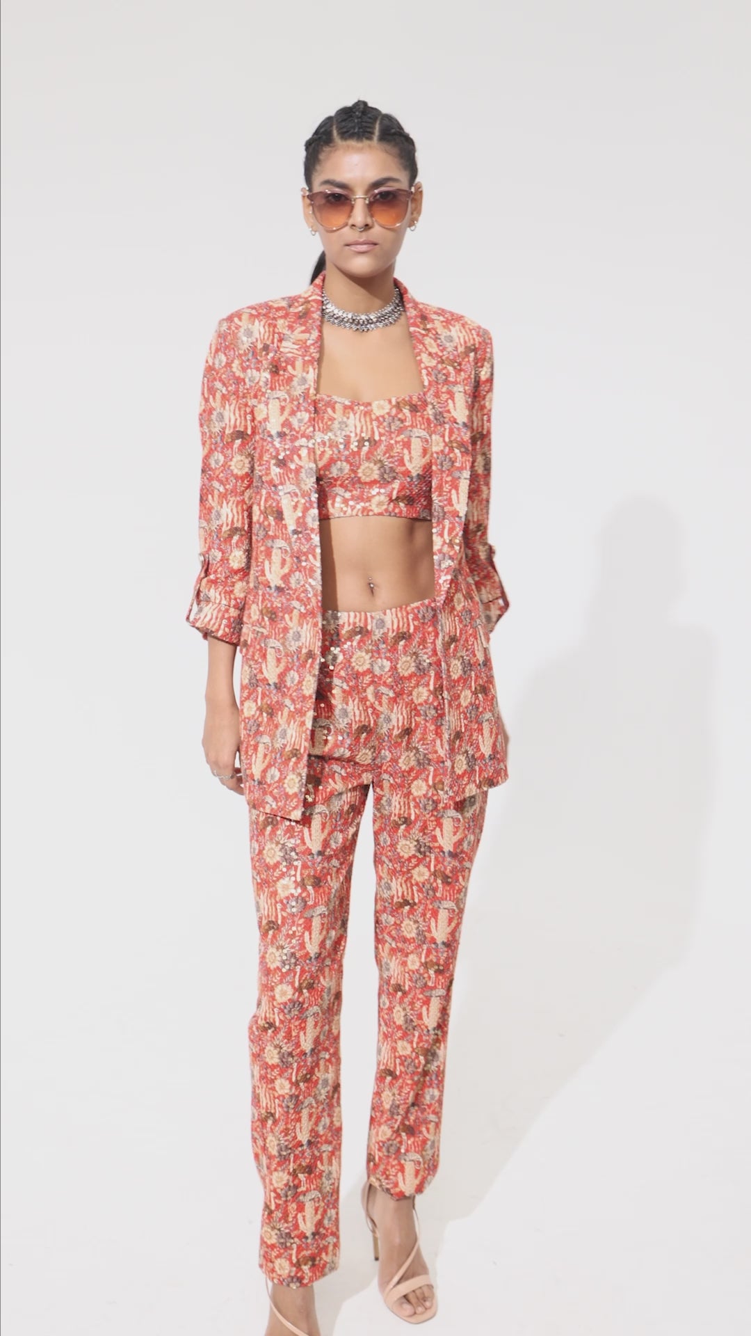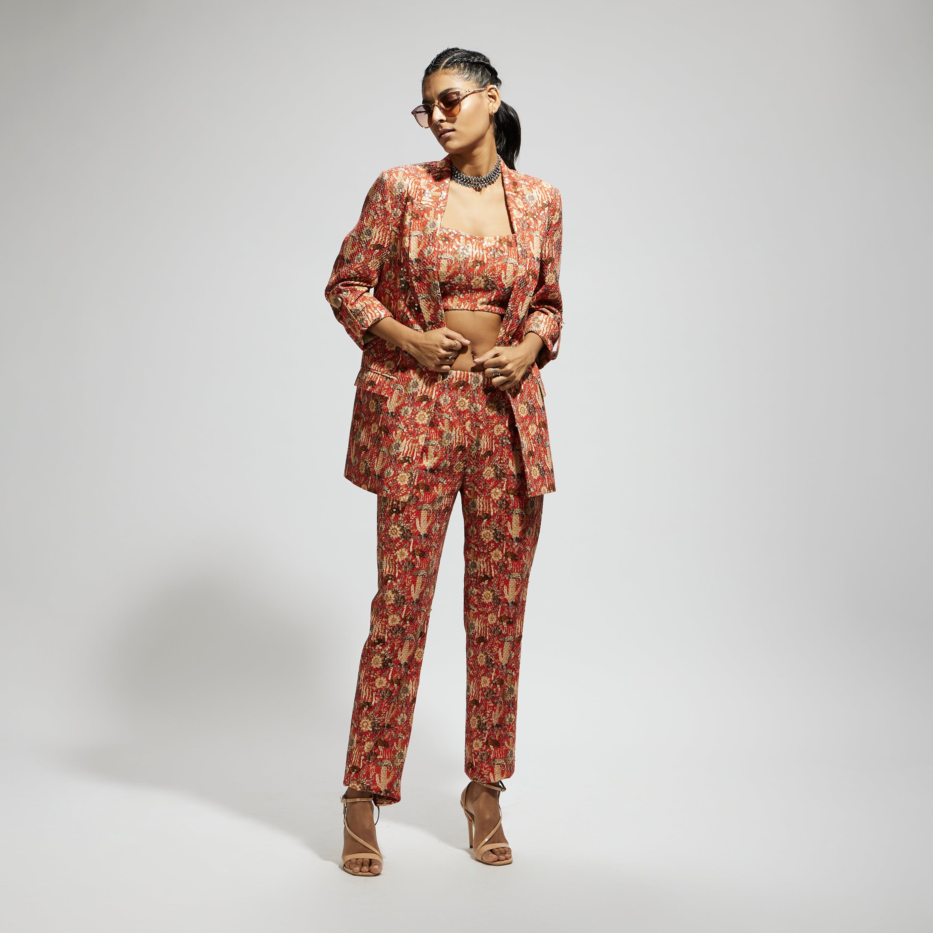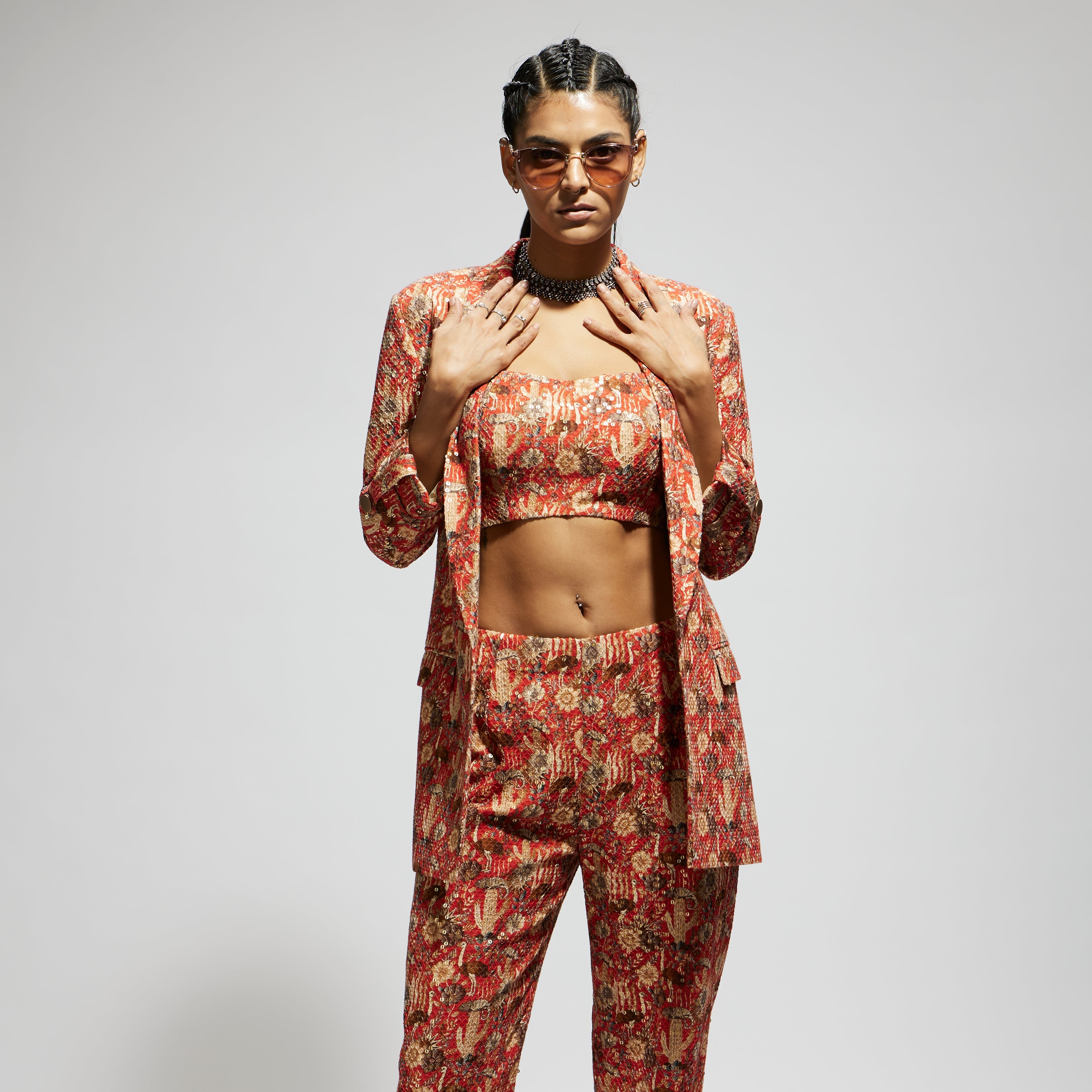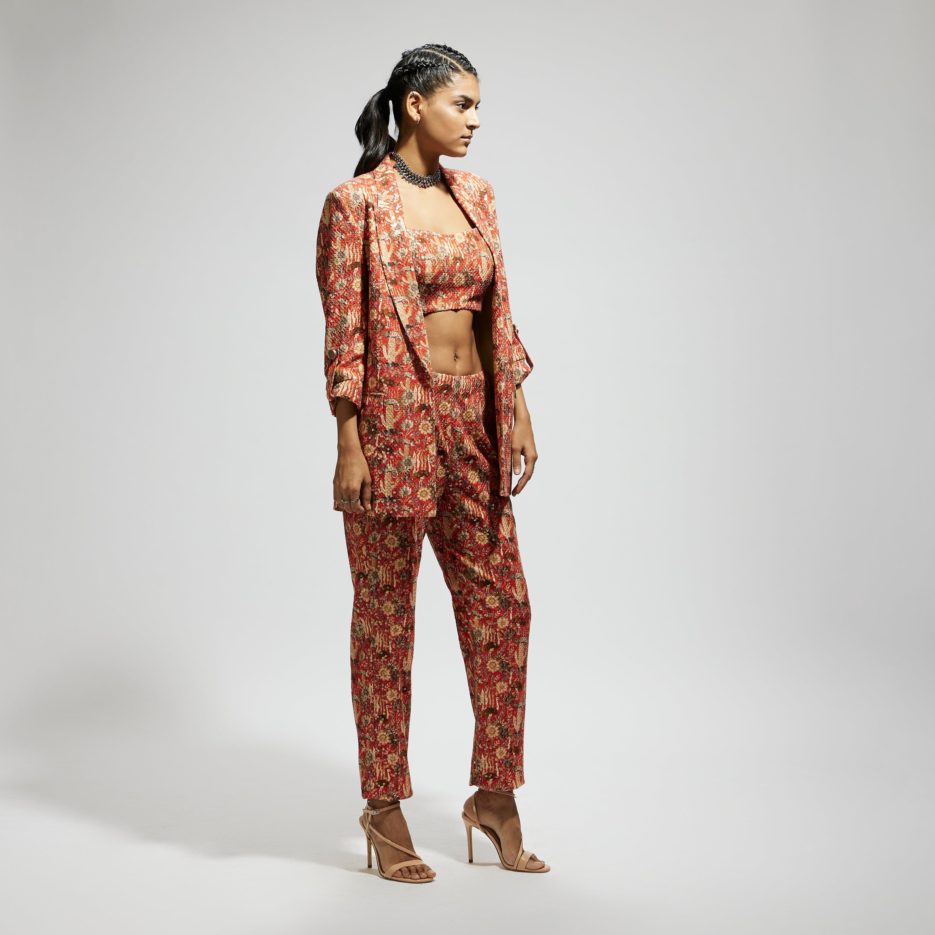 Featuring an orange jaal embellished blazer set, Fabric Sequins Component 3.