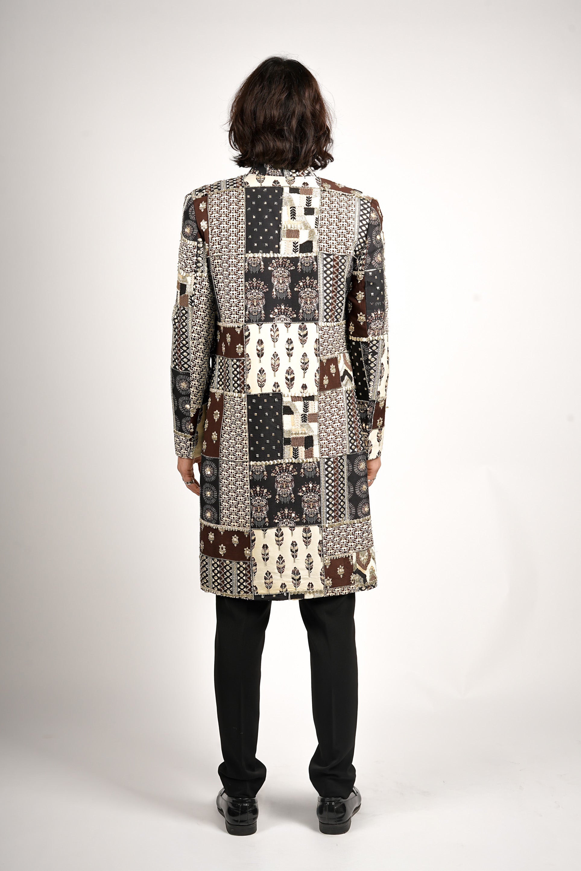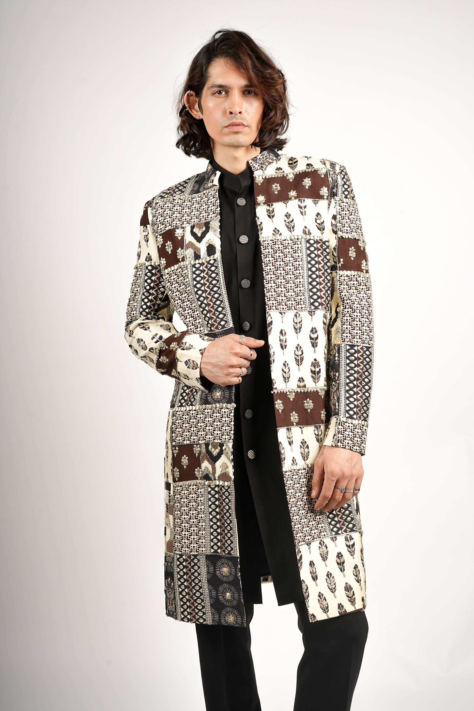 A statement sherwani featuring a striking patchwork of traditional motifs in ivory, brown, and black. Styled with black kurta set, crafted for the modern look with an artistic edge.