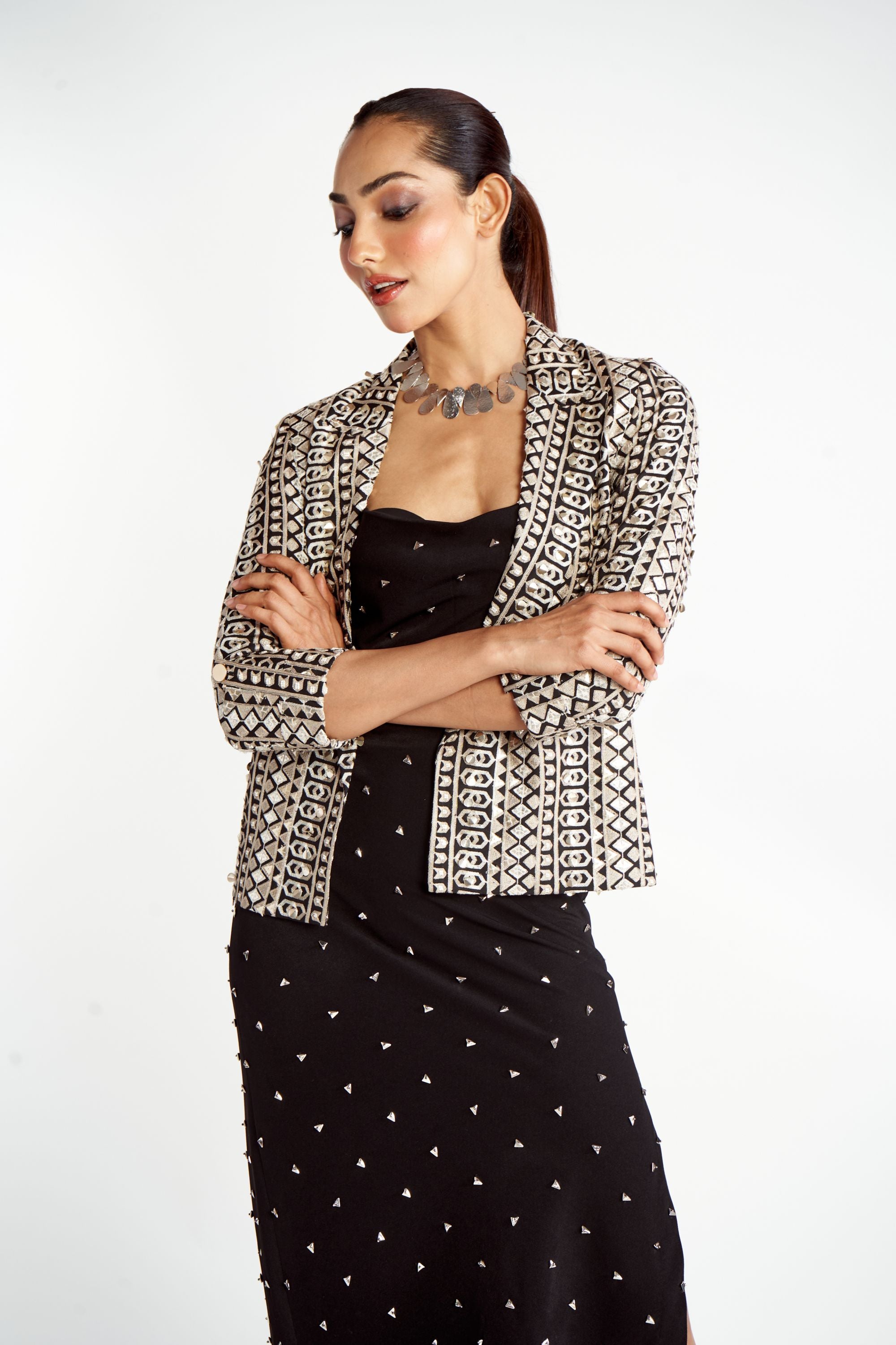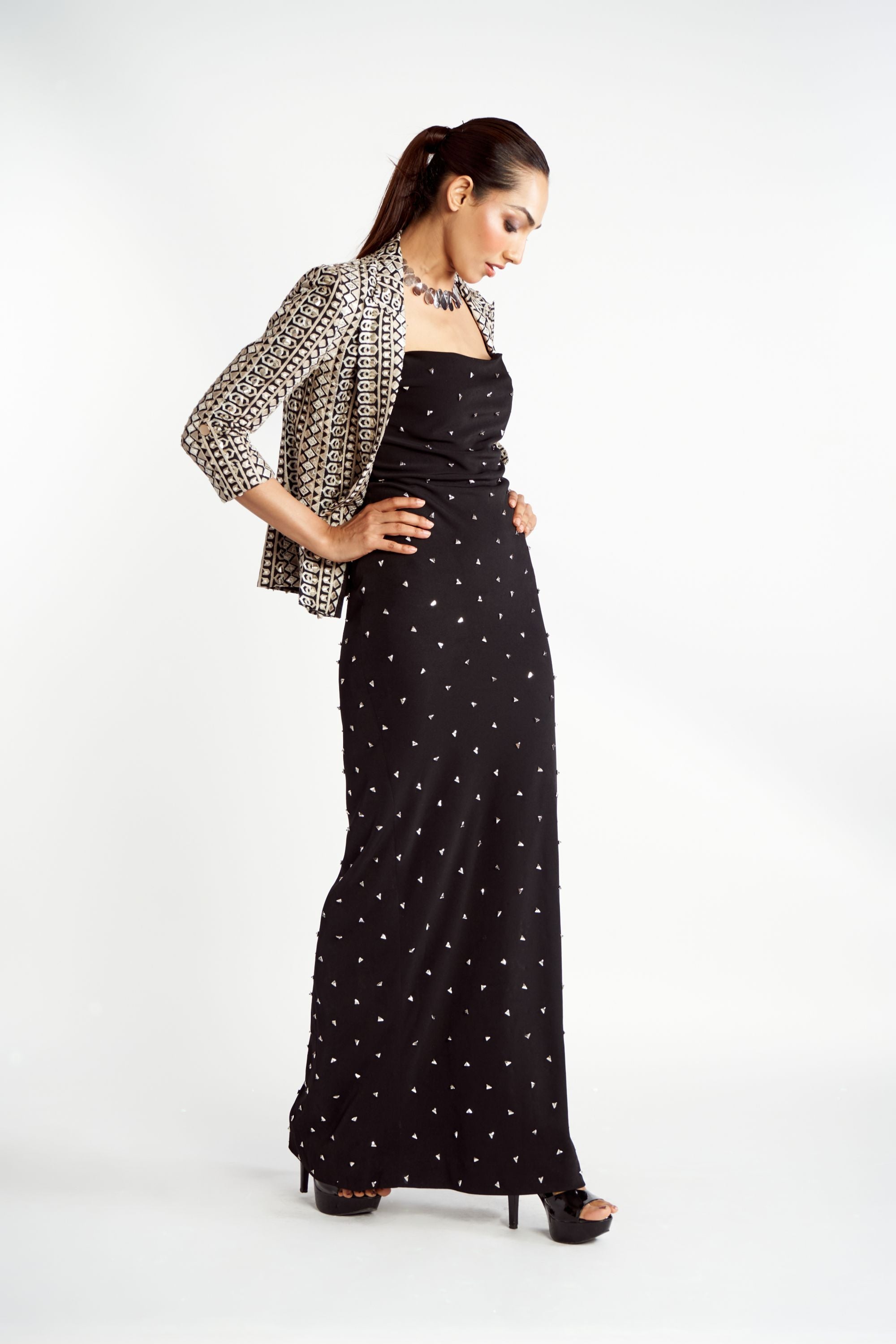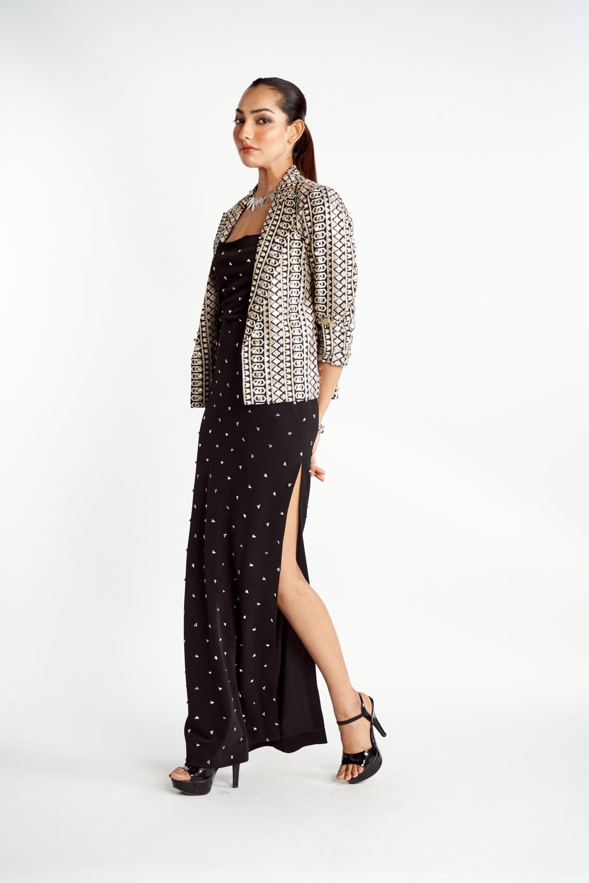 Elevate your style with this stunning Cowl Neck Dress Set, a perfect blend of elegance and glamour. The dress features a flattering cowl neckline and is embellished all over with intricate detailing. Paired with a fully embroidered Jaal Jacket, this ensemble exudes opulence and sophistication.