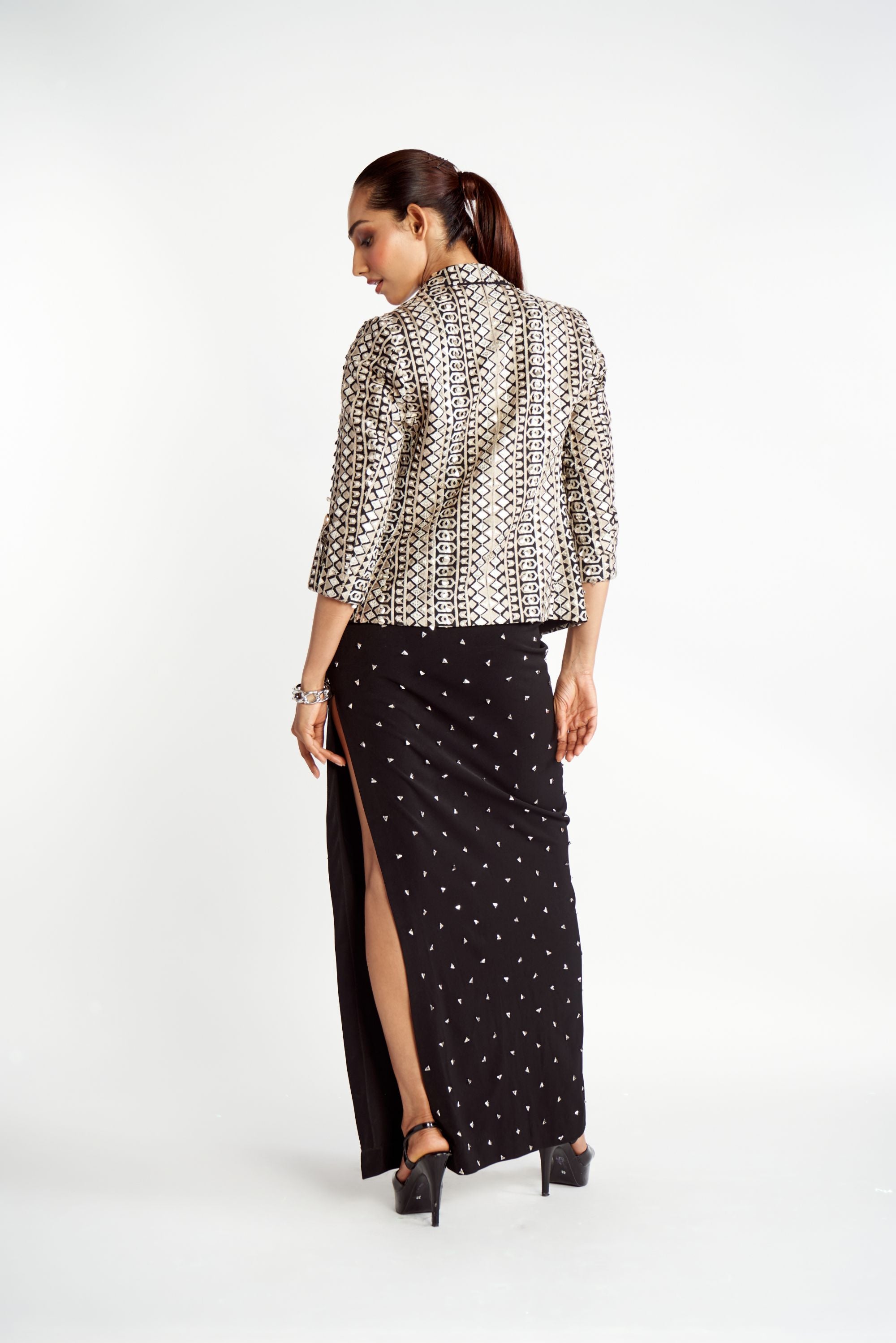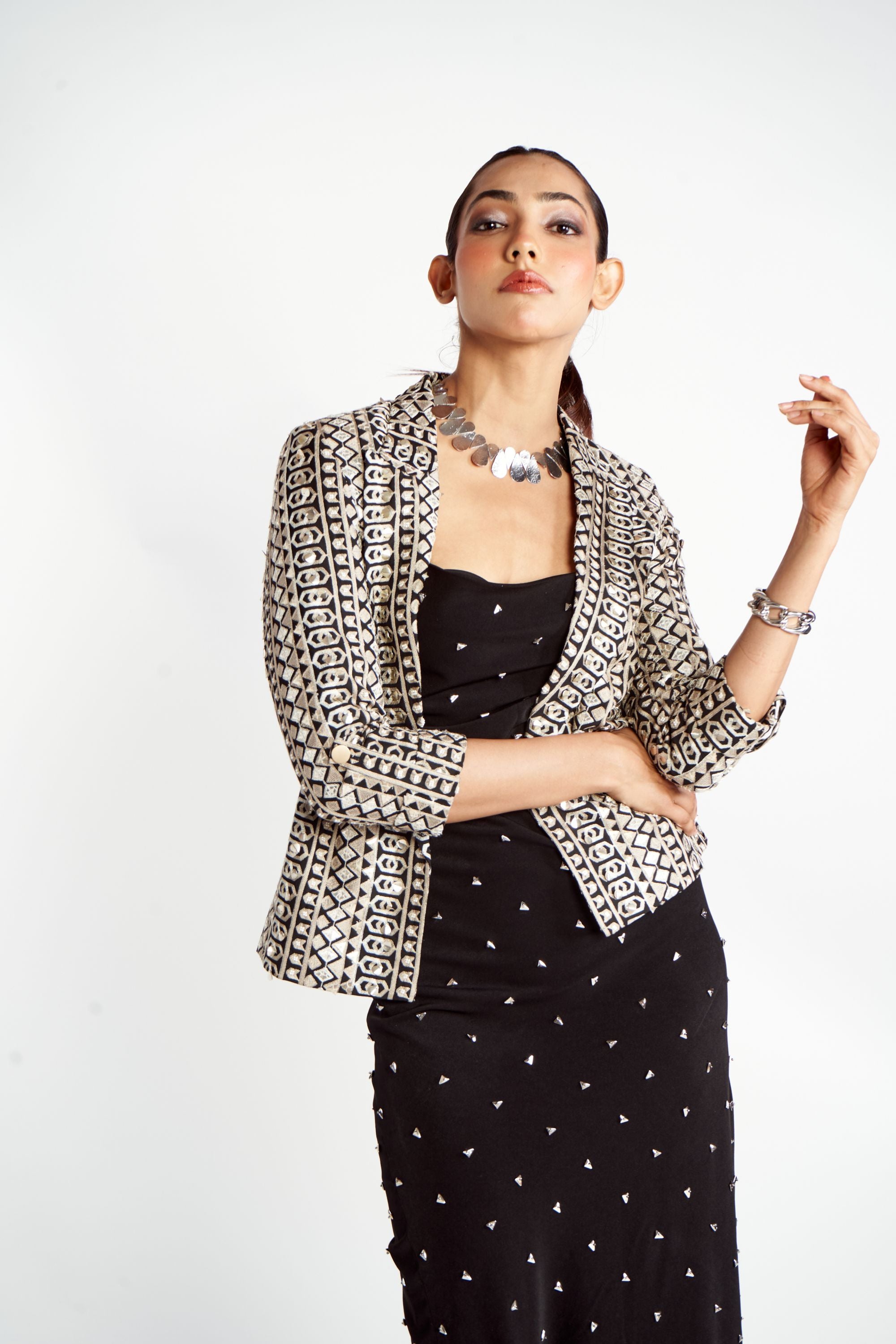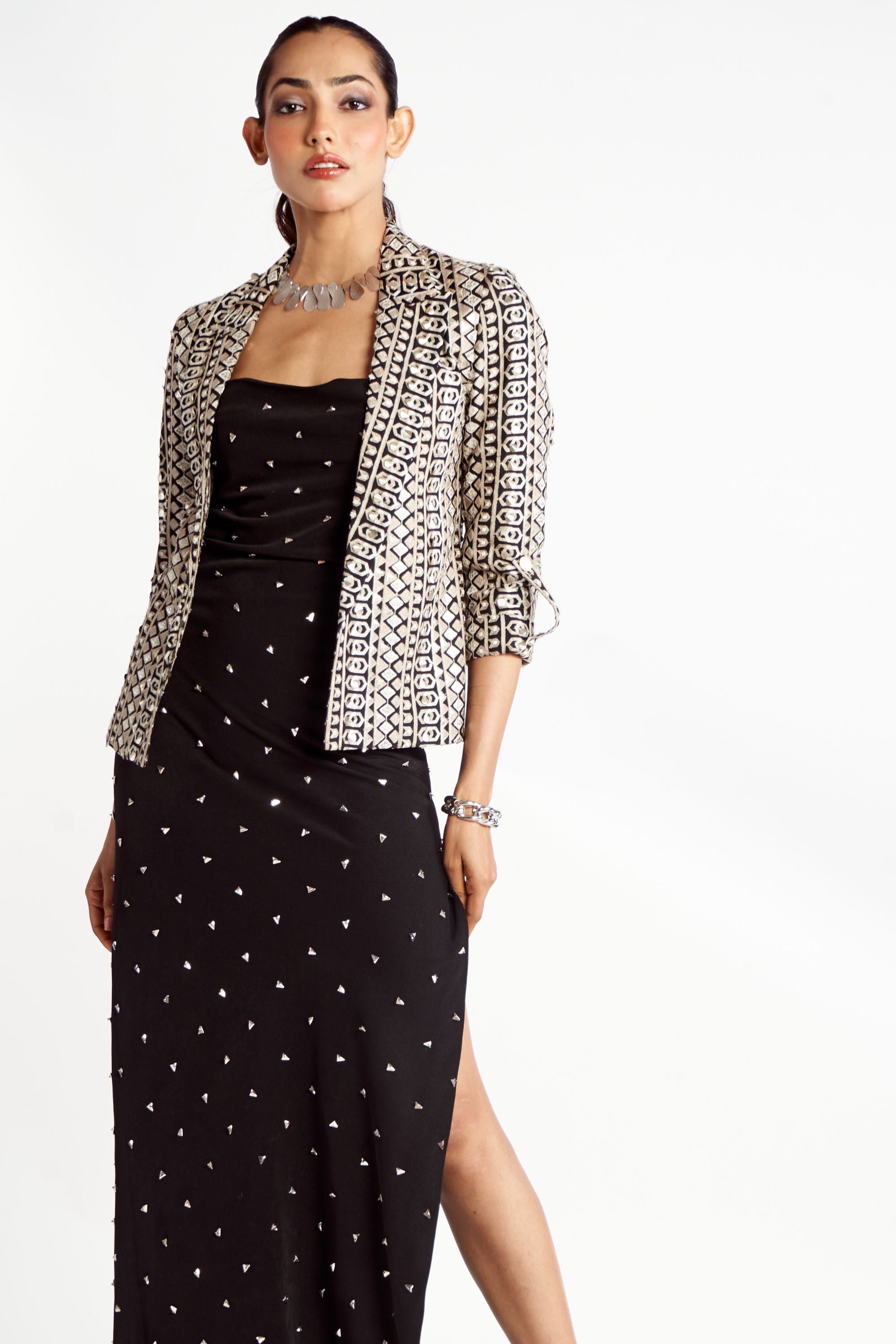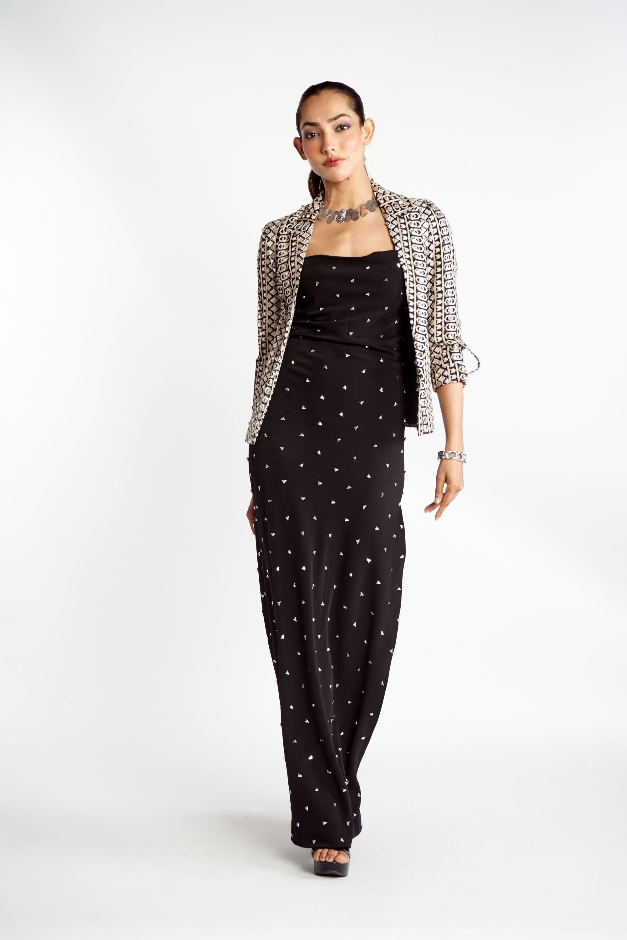 Elevate your style with this stunning Cowl Neck Dress Set, a perfect blend of elegance and glamour. The dress features a flattering cowl neckline and is embellished all over with intricate detailing. Paired with a fully embroidered Jaal Jacket, this ensemble exudes opulence and sophistication.