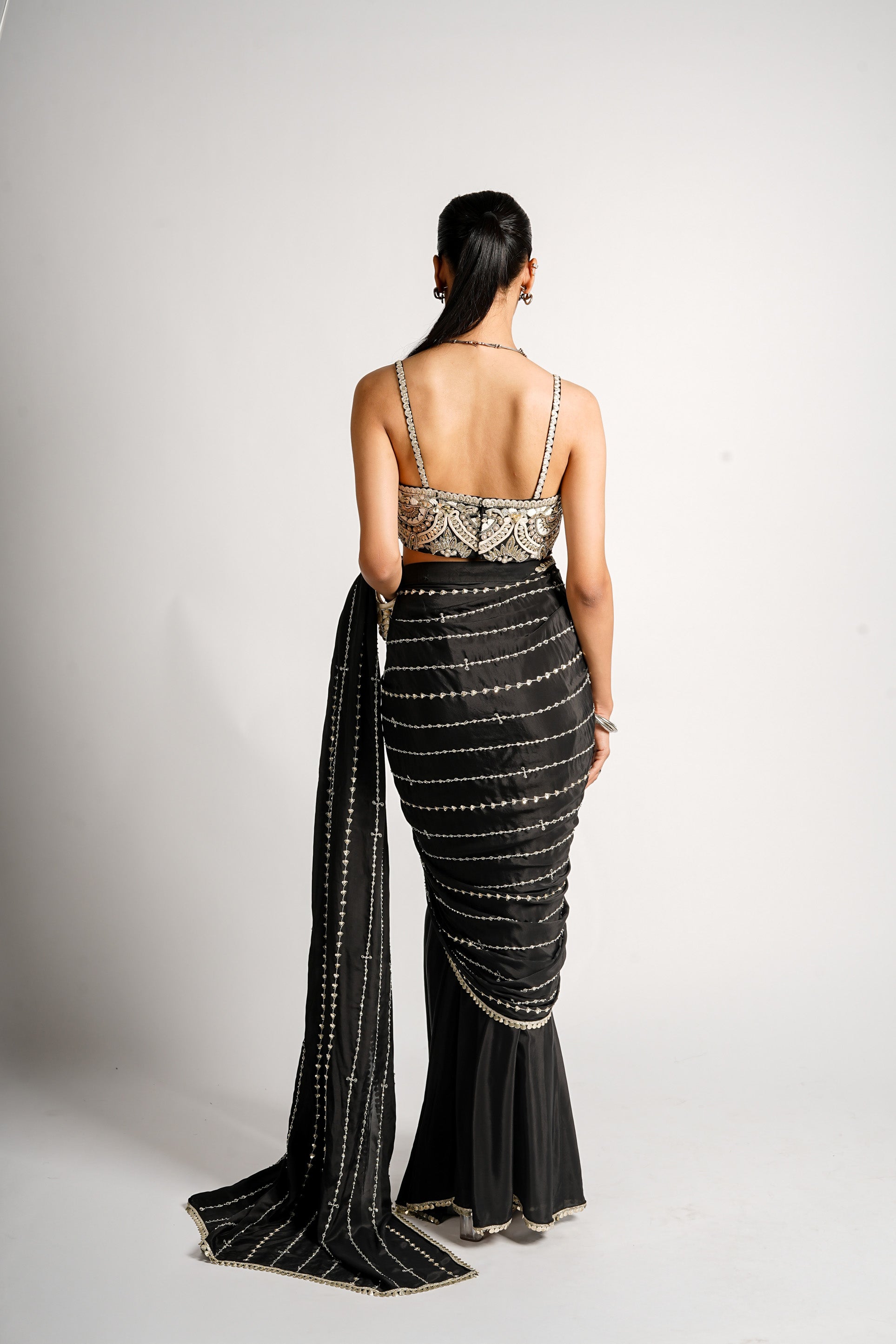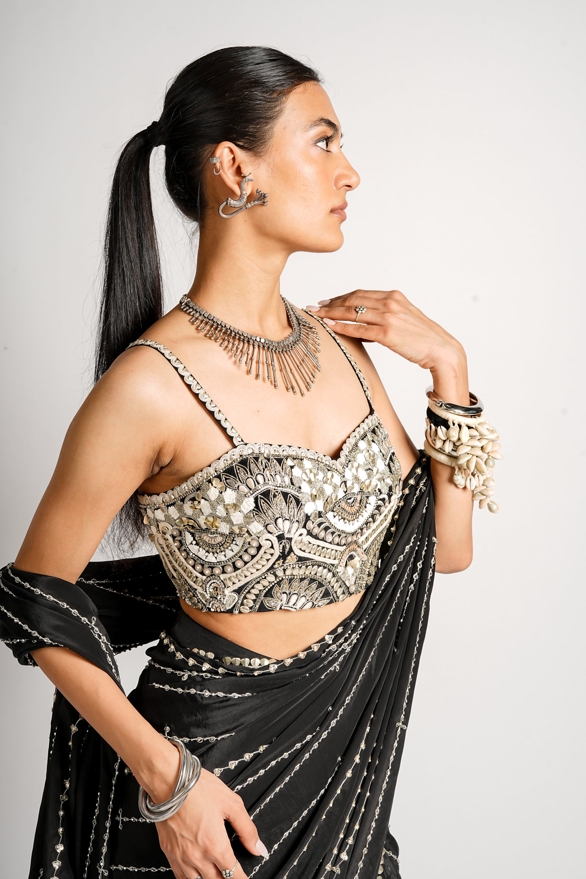 Embellished abstract embroidered bustier and a draped studded black saree, accessorized with statement earrings, bangles for an elegant yet contemporary look.