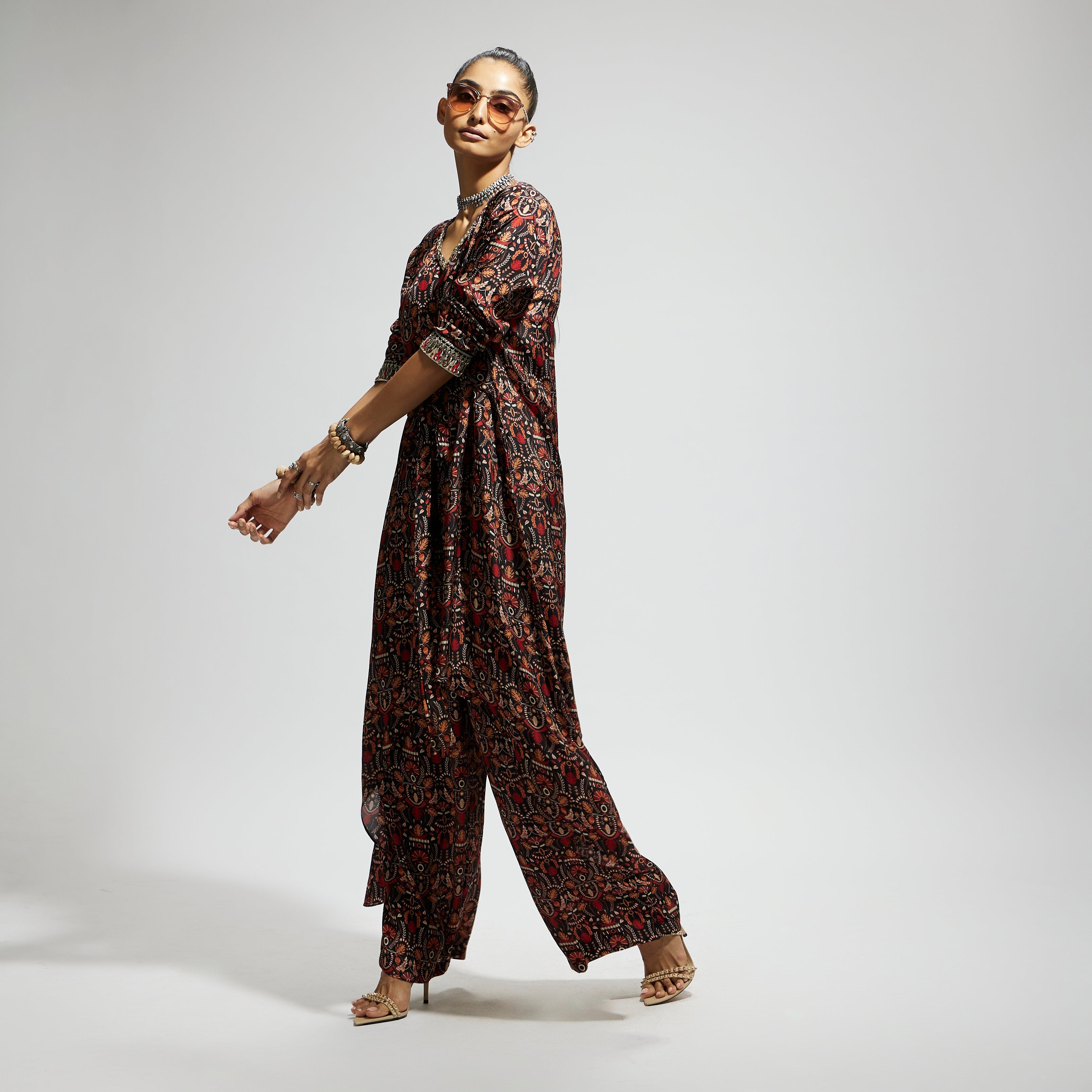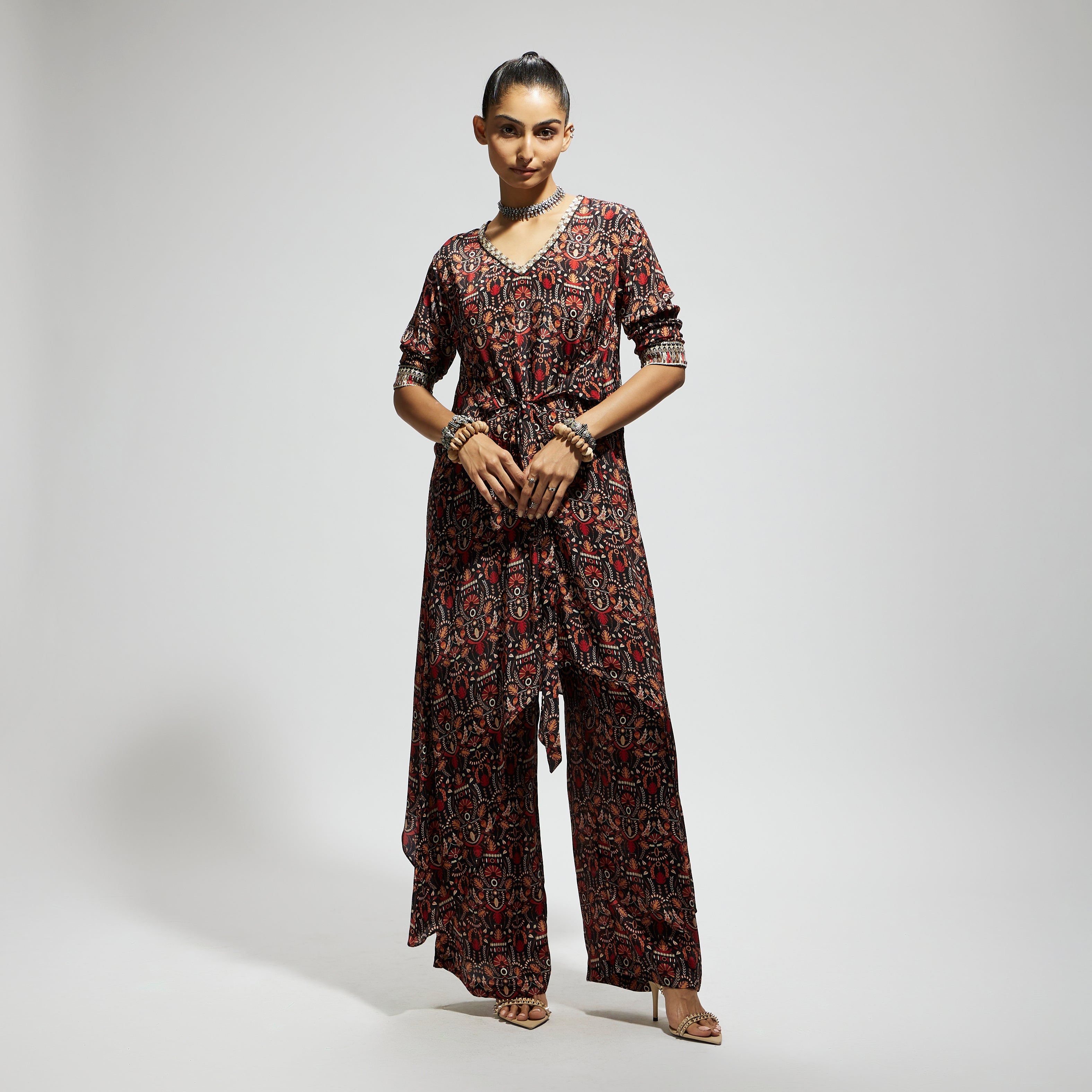 The grey jaal print front tie up tunic comes with pants made of fabric Airjet Crepe component 2.