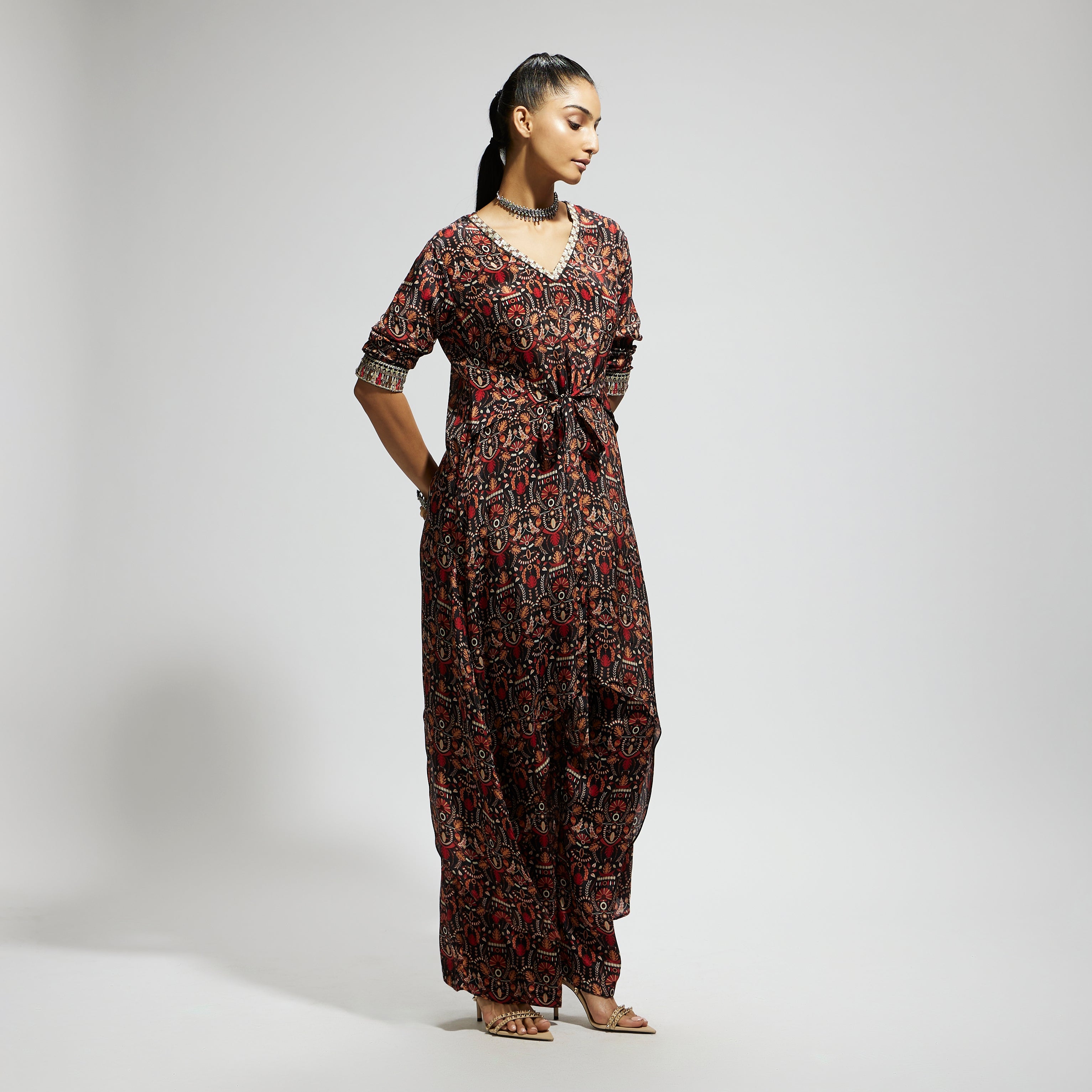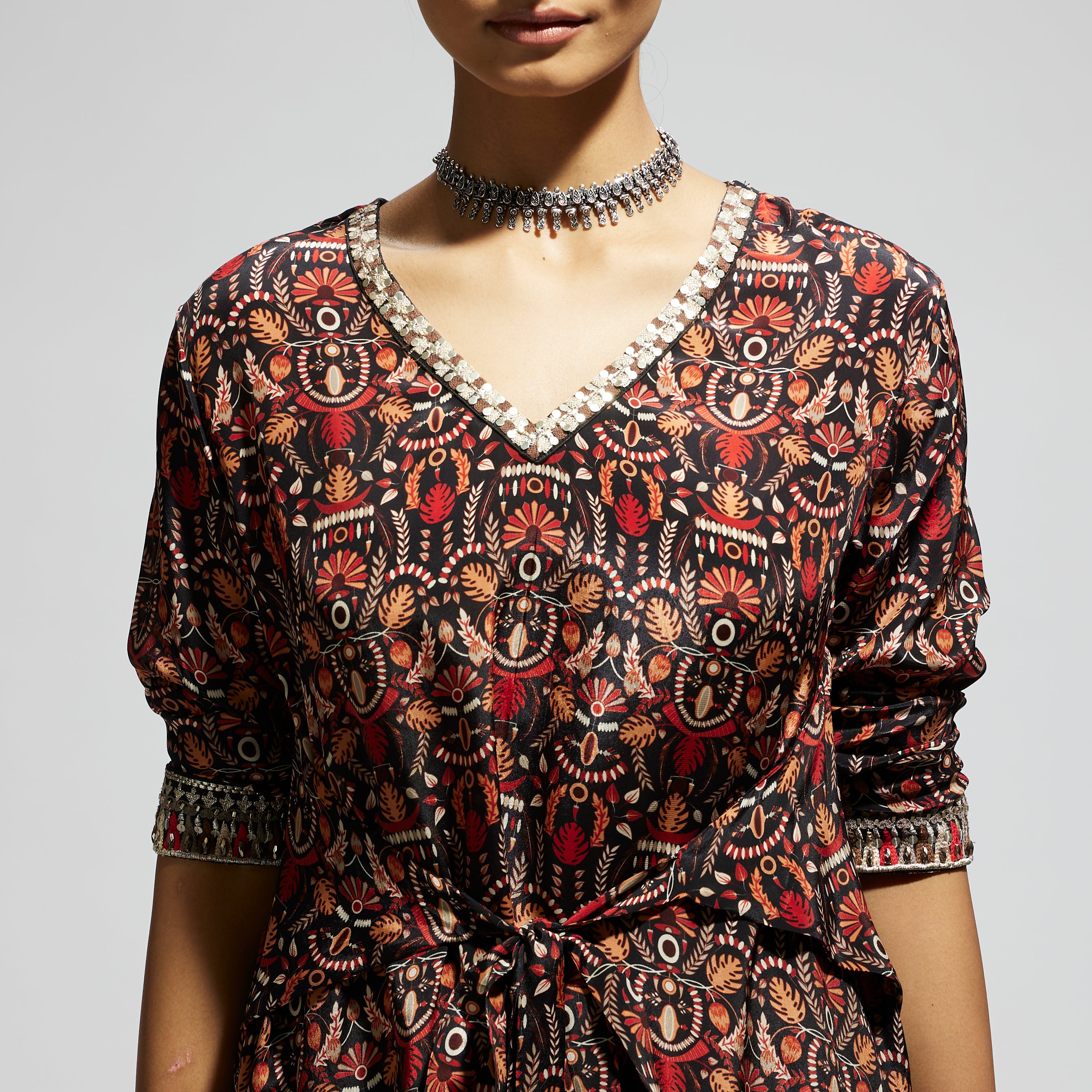 GREY JAAL PRINT FRONT TIE UP TUNIC