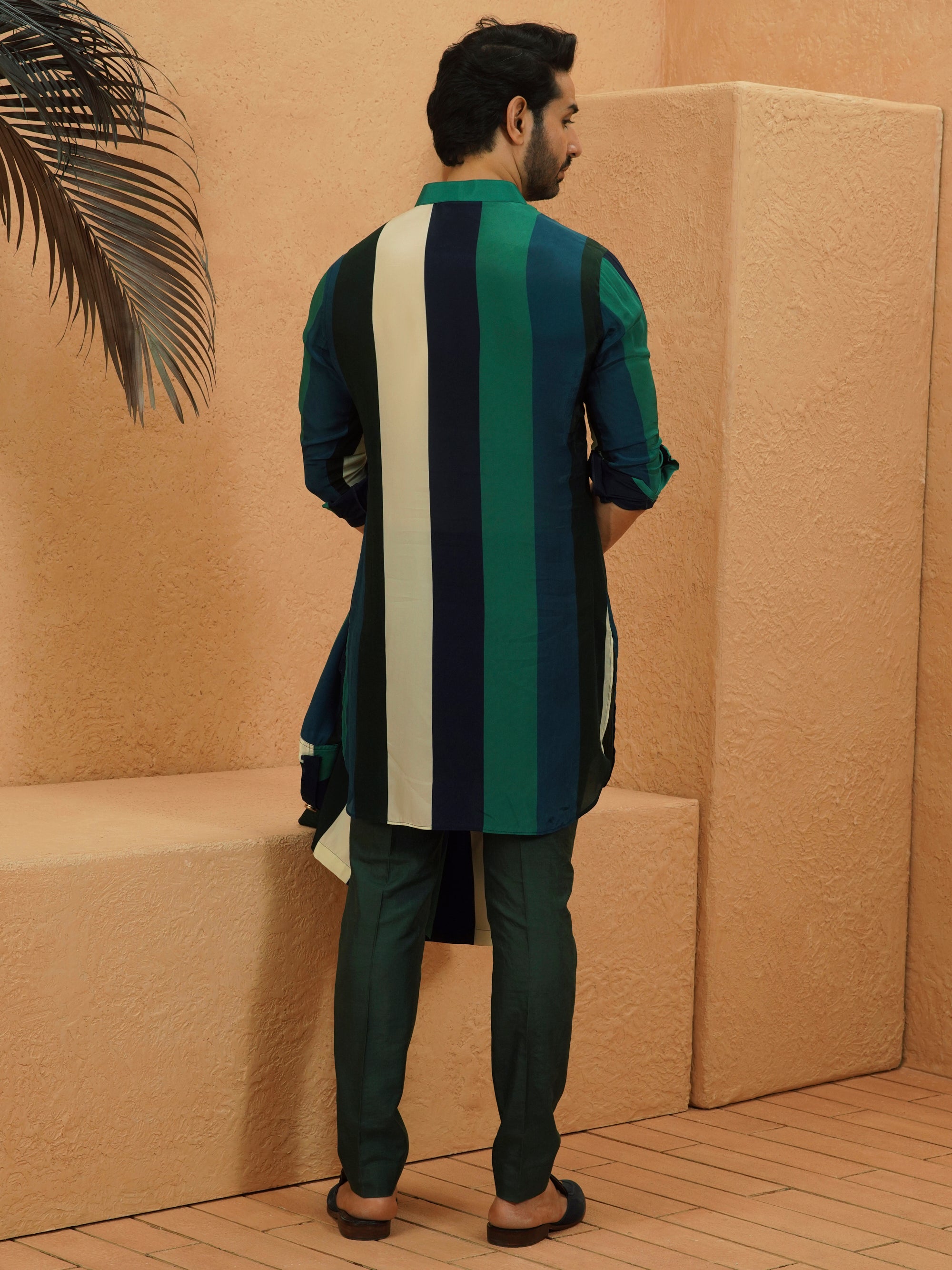 This modern kurta features bold vertical stripes in deep green, navy, and ivory, creating a striking visual appeal. The sleek silhouette is complemented by a mandarin collar and rolled-up sleeves for a relaxed yet sophisticated look. Paired with tailored trousers this ensemble is perfect for contemporary festive wear. Perfect for a destination wedding, Indian resort wear, pool party, or an evening soirée.