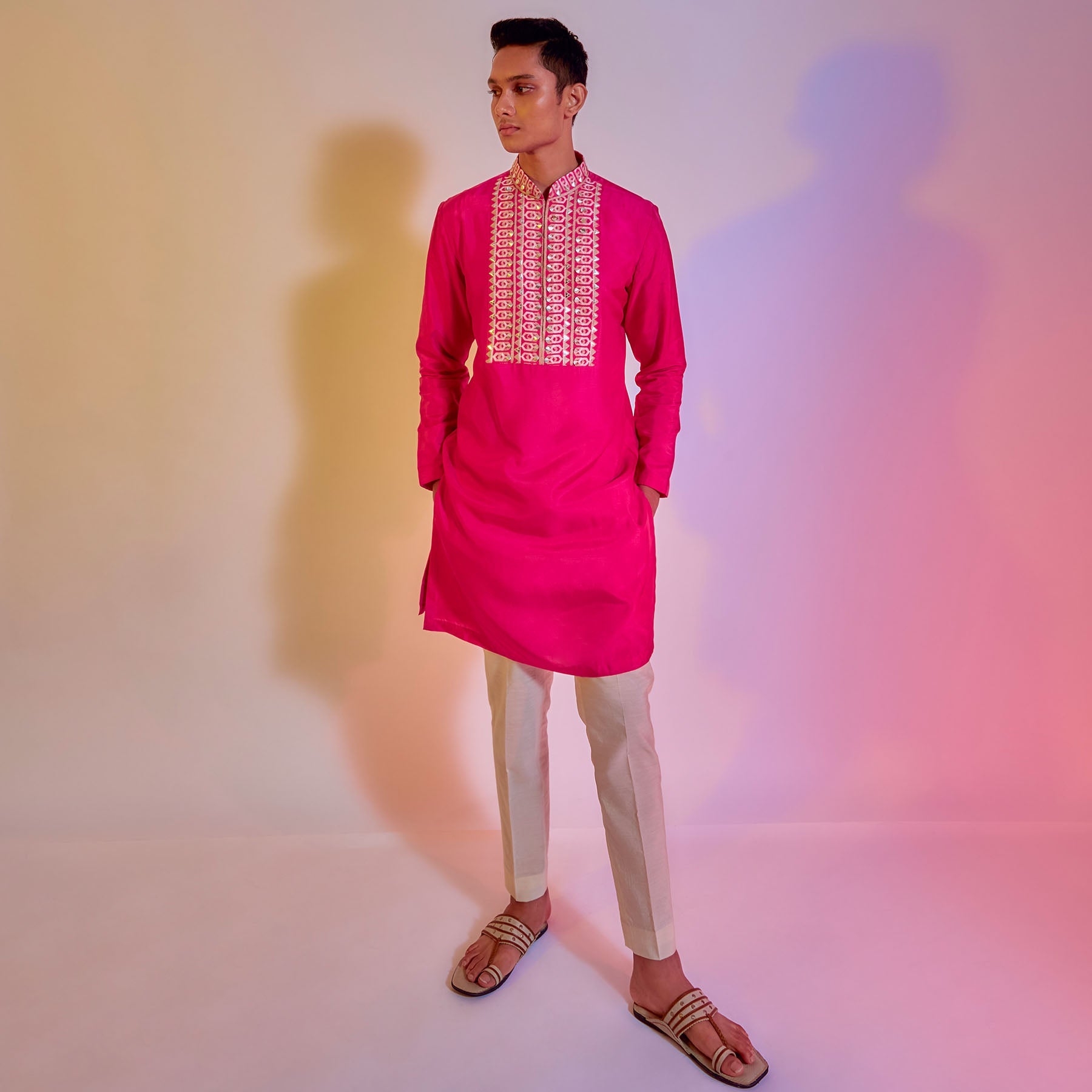 HOT PINK KURTA WITH EMBROIDERED YOKE TEAMED WITH IVORY PLEATED PANTS