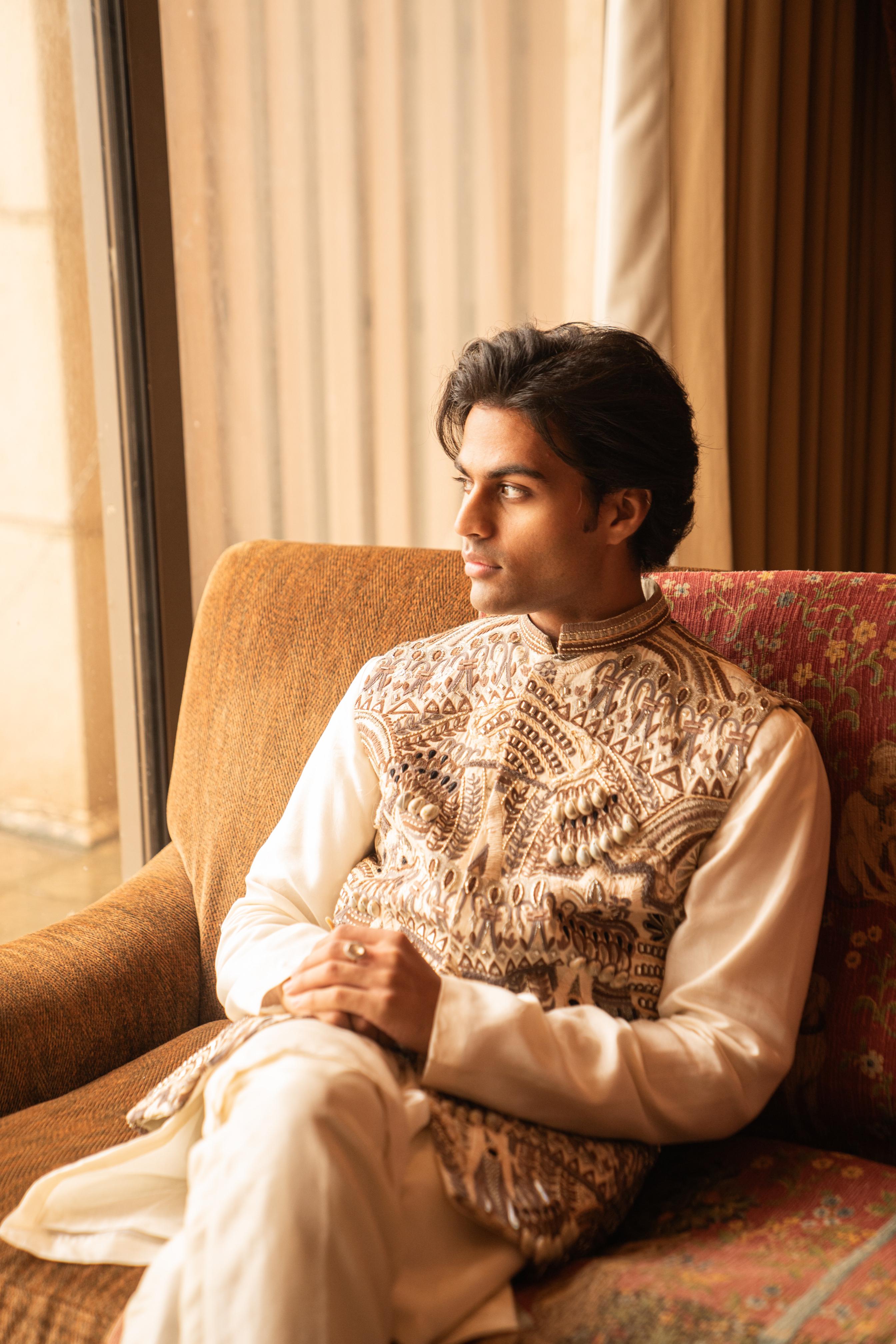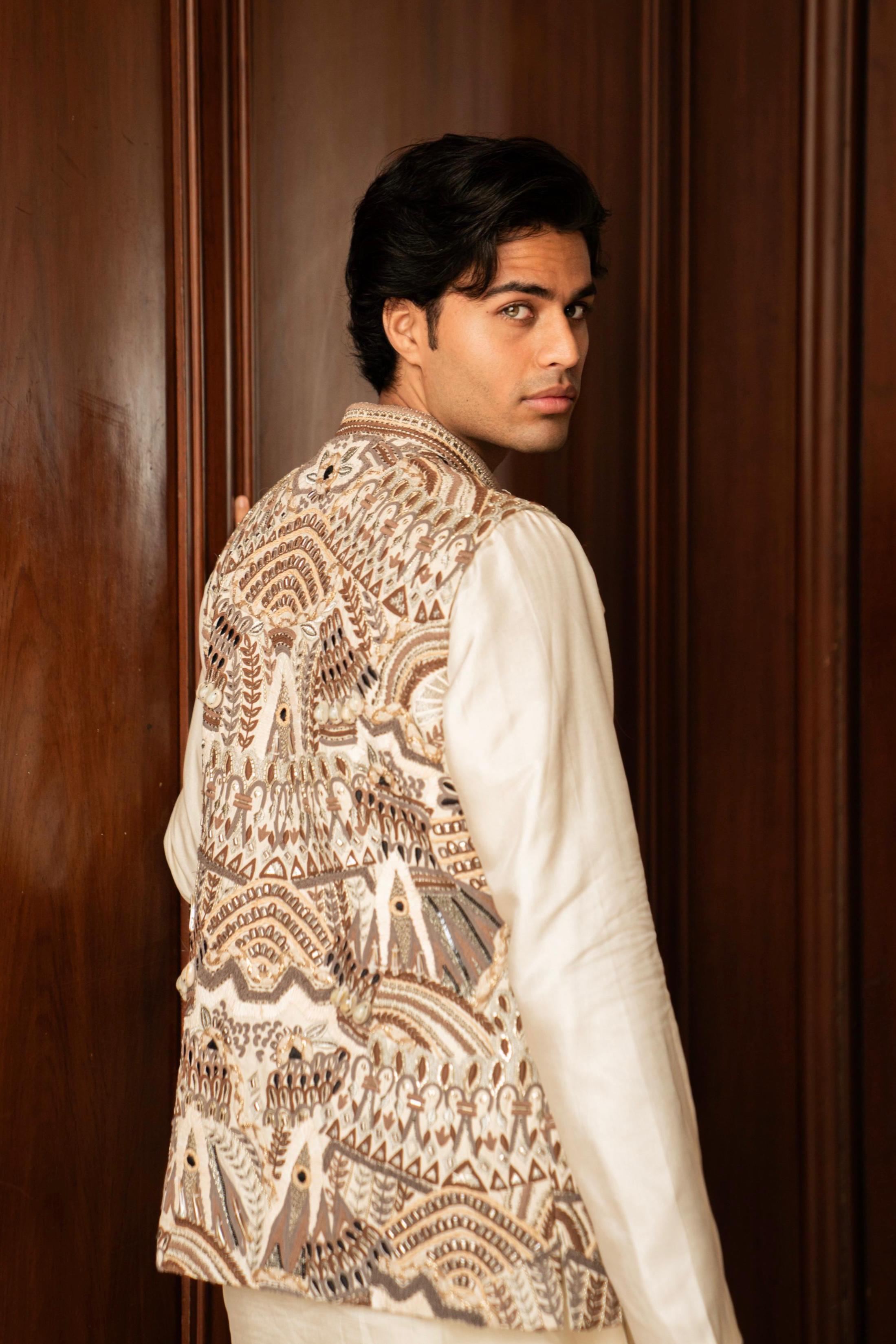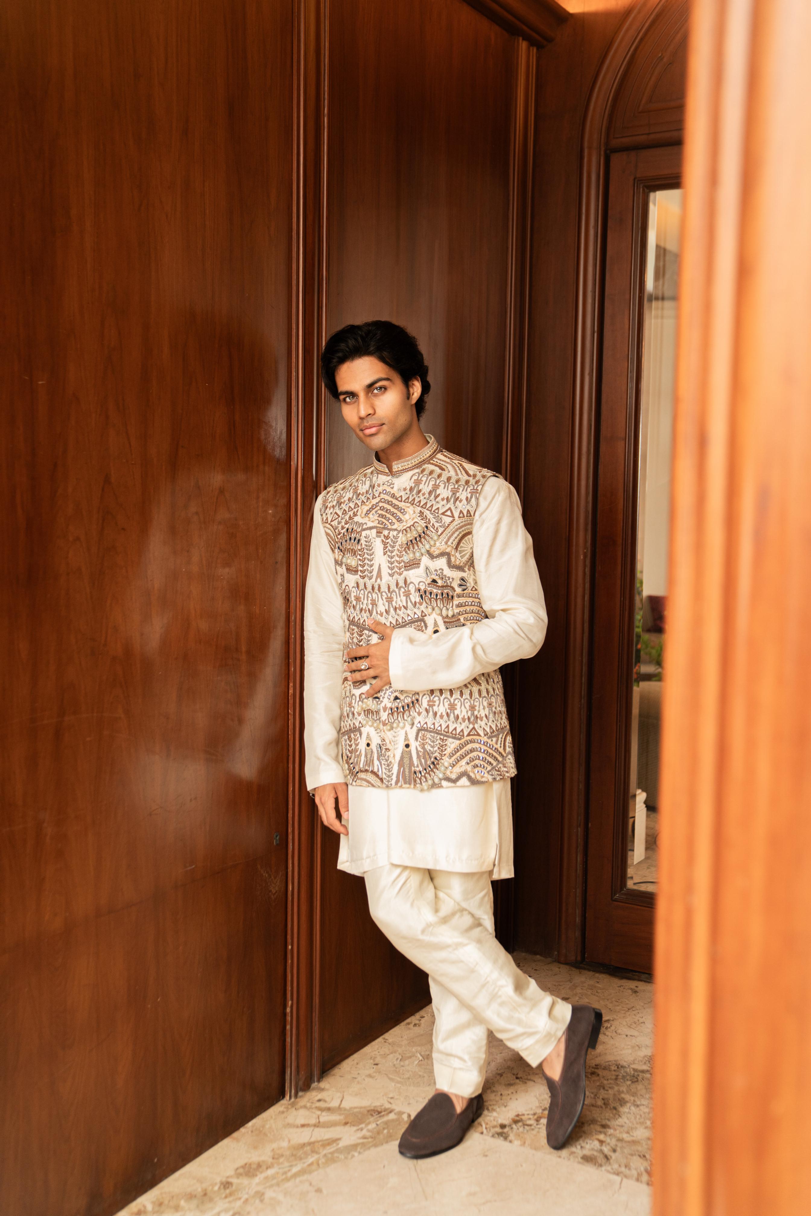 IVORY ABSTRACT EMBROIDERED BUNDI WITH KURTA AND PANTS