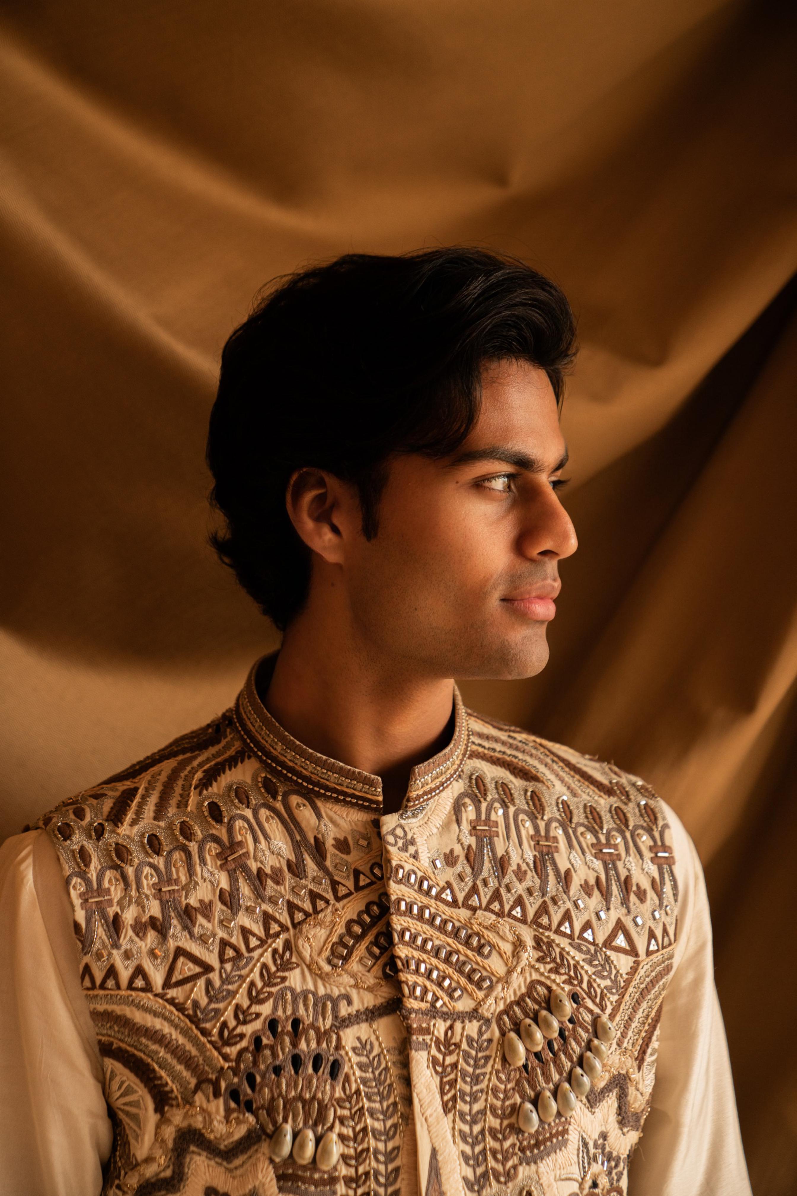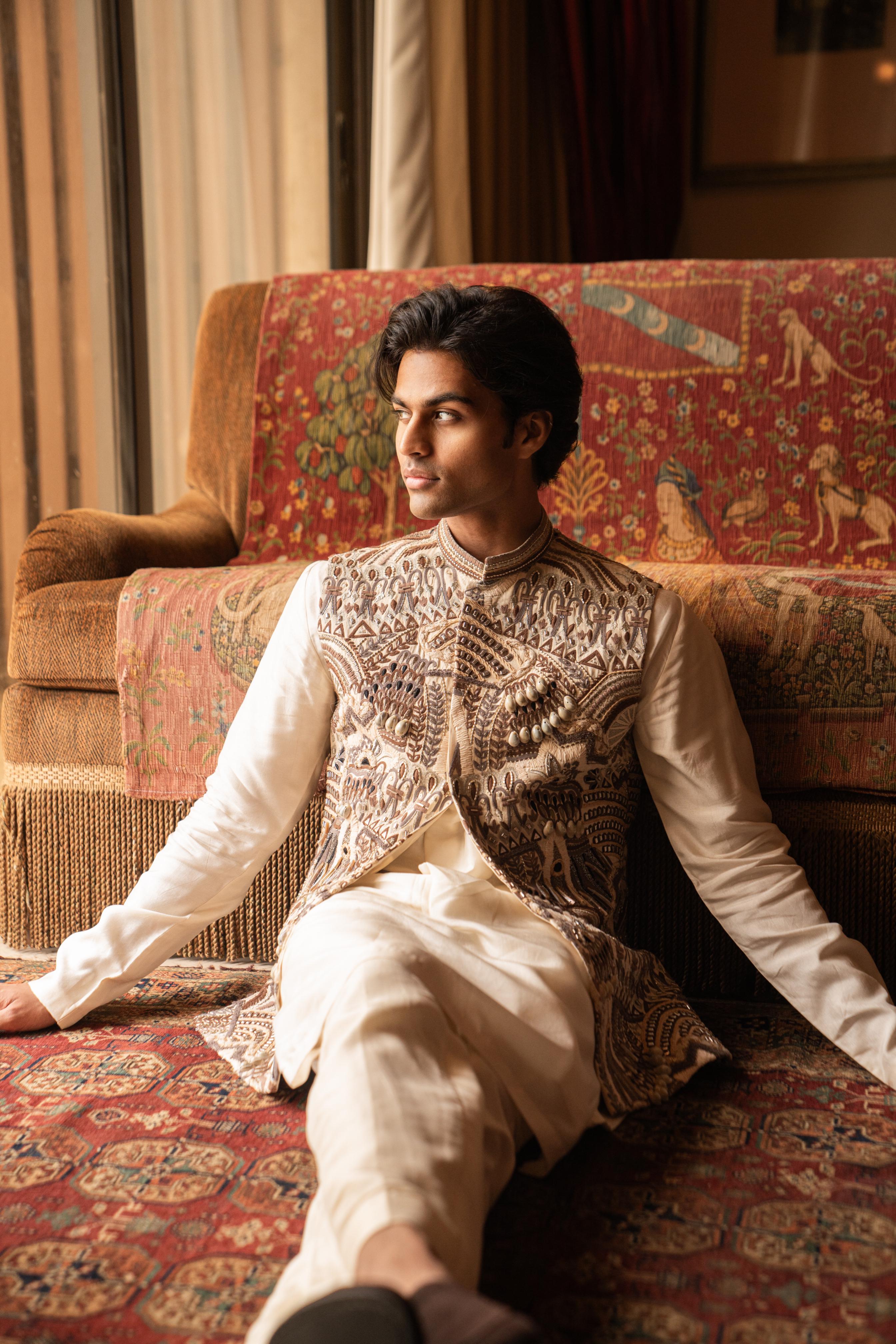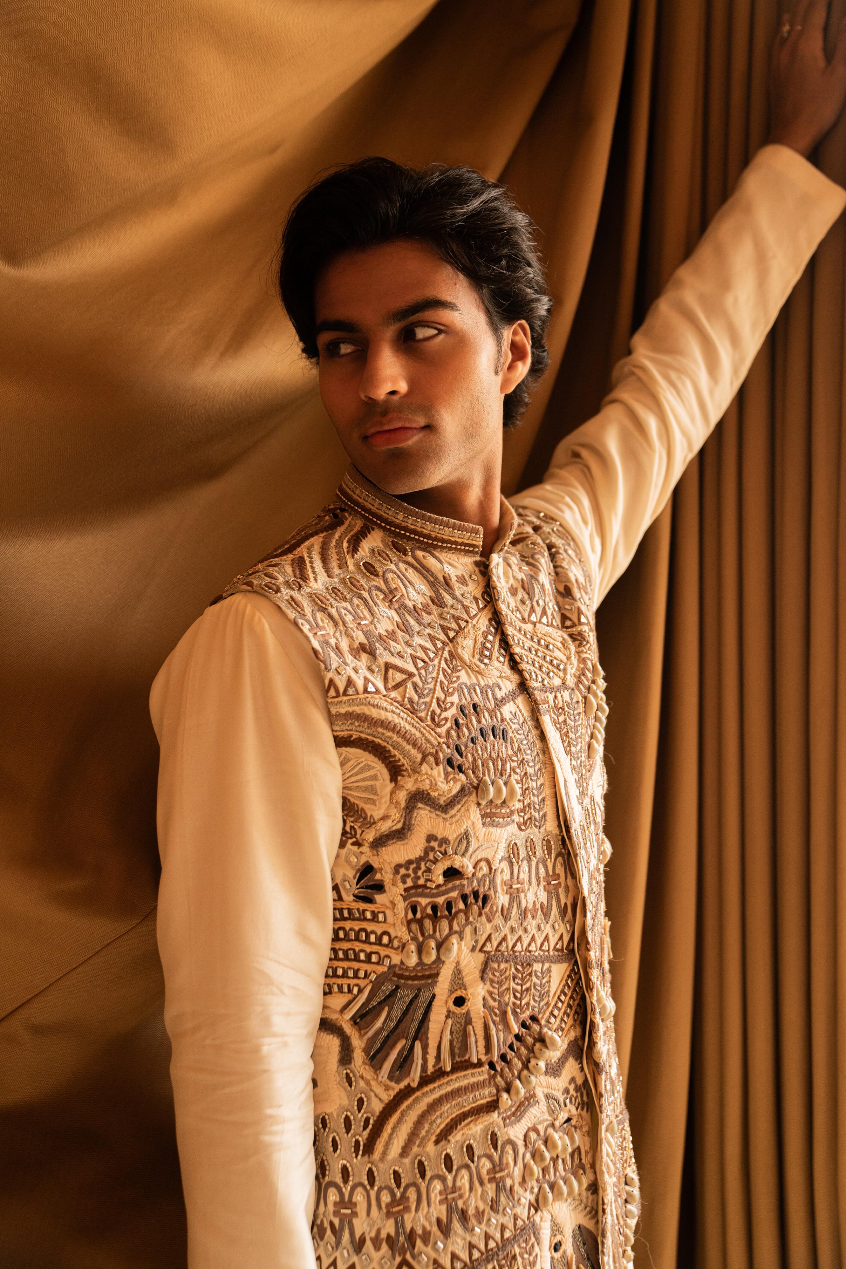 IVORY ABSTRACT EMBROIDERED BUNDI WITH KURTA AND PANTS