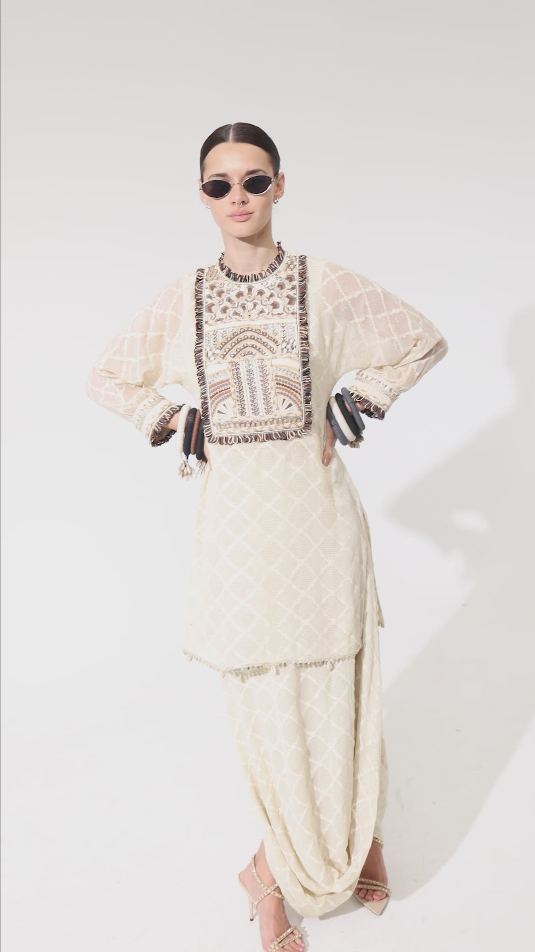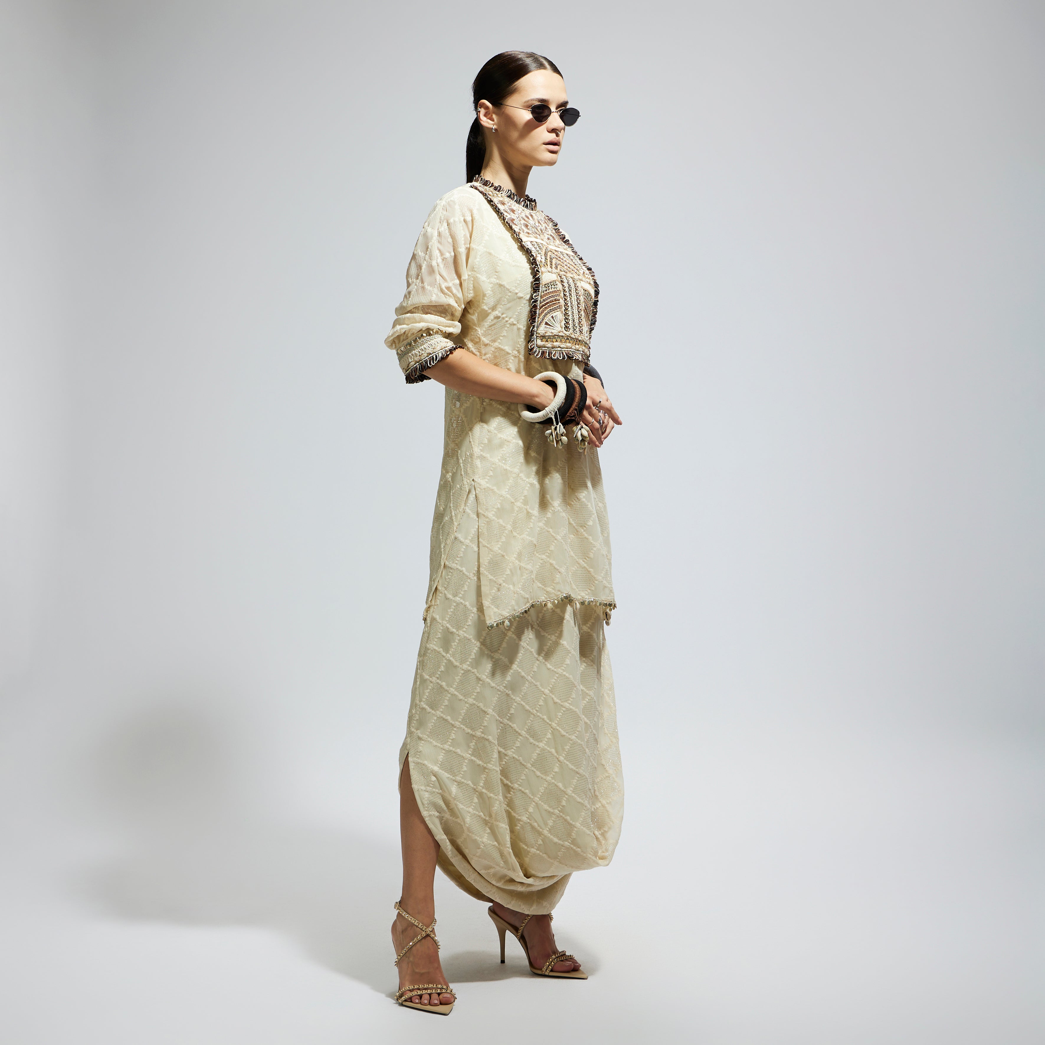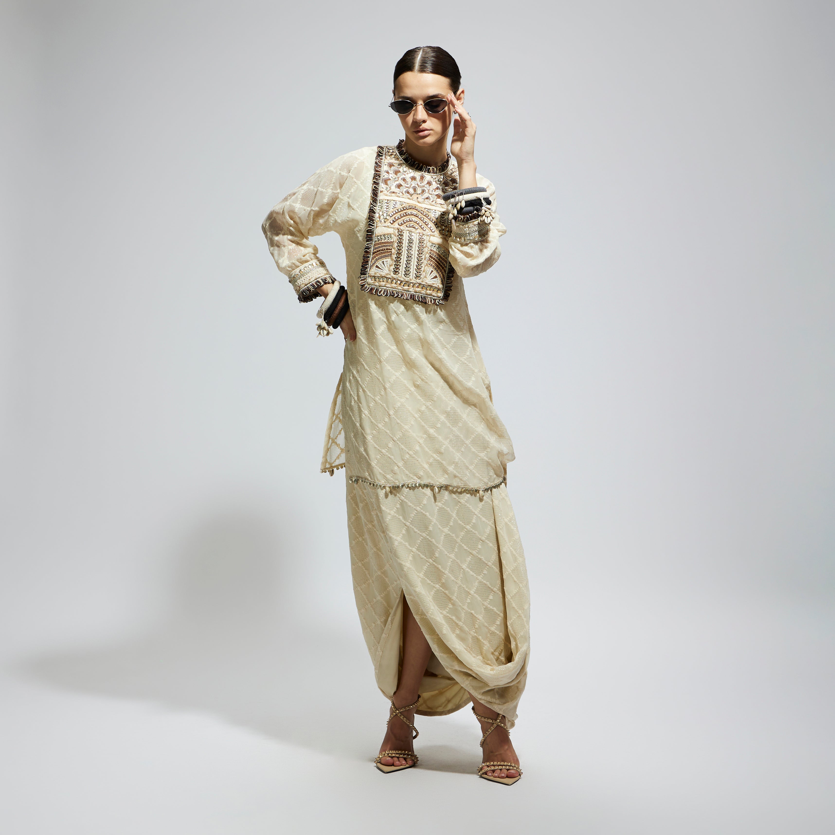 IVORY AZTEC YOKE EMBROIDERED TUNIC PAIRED WITH DRAPE SKIRT