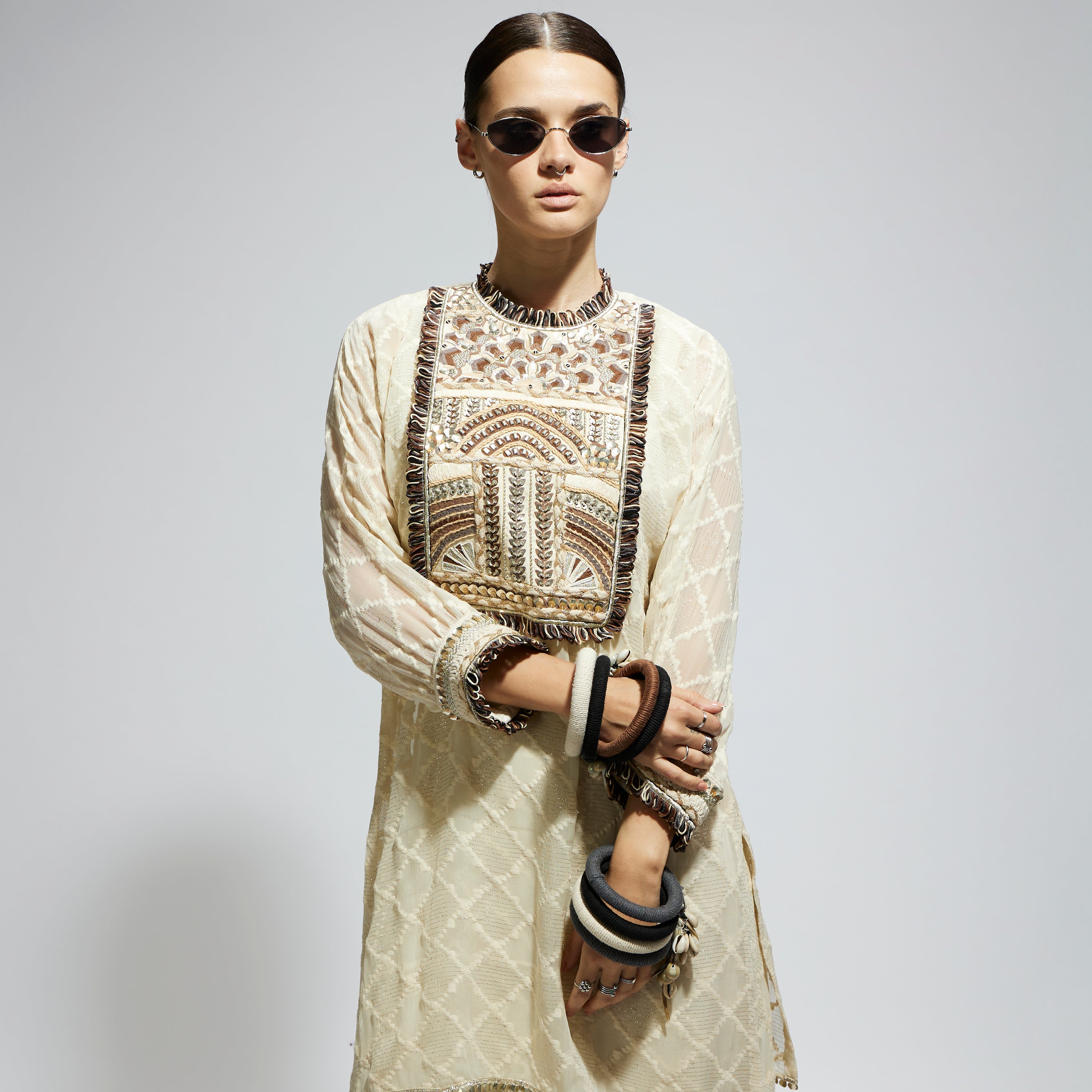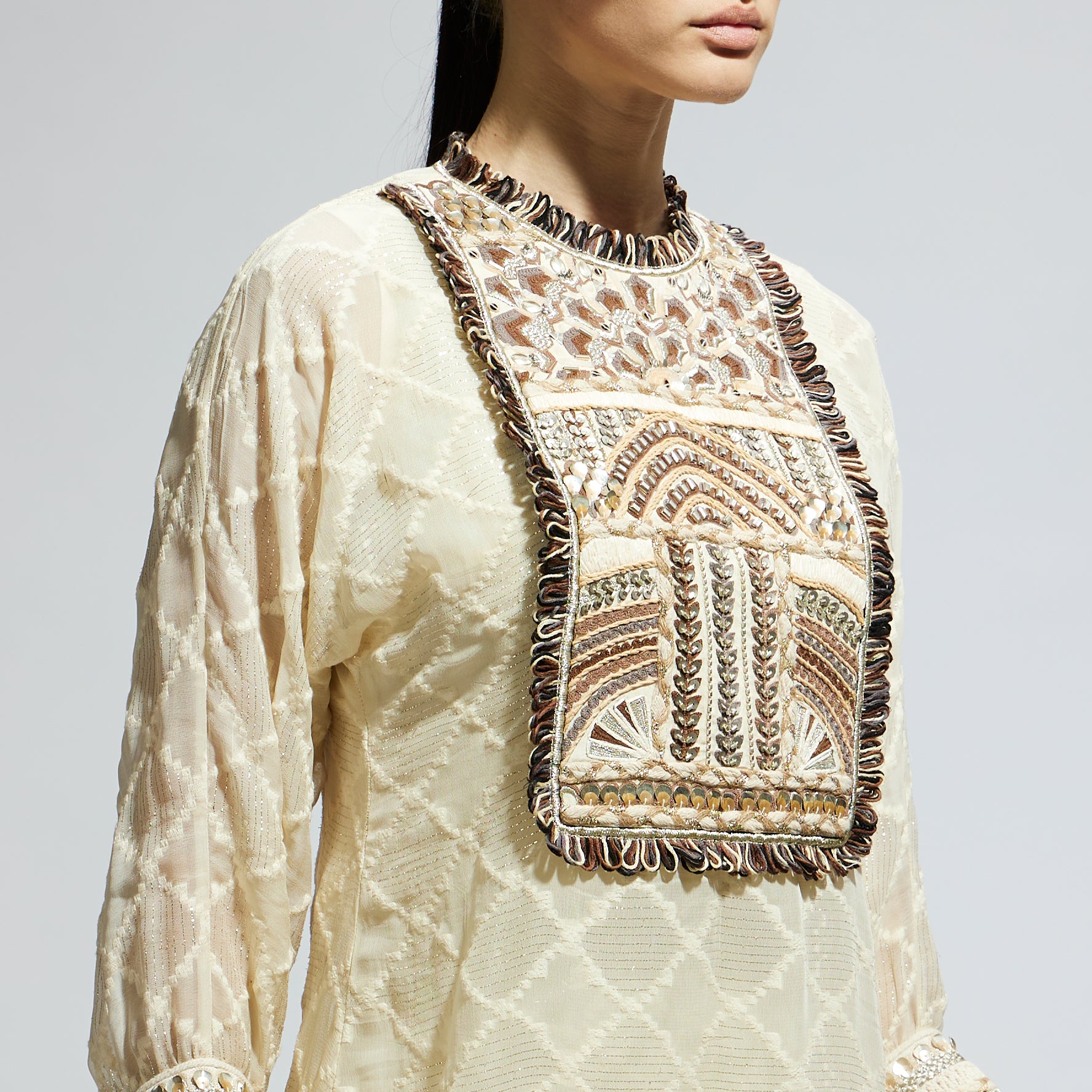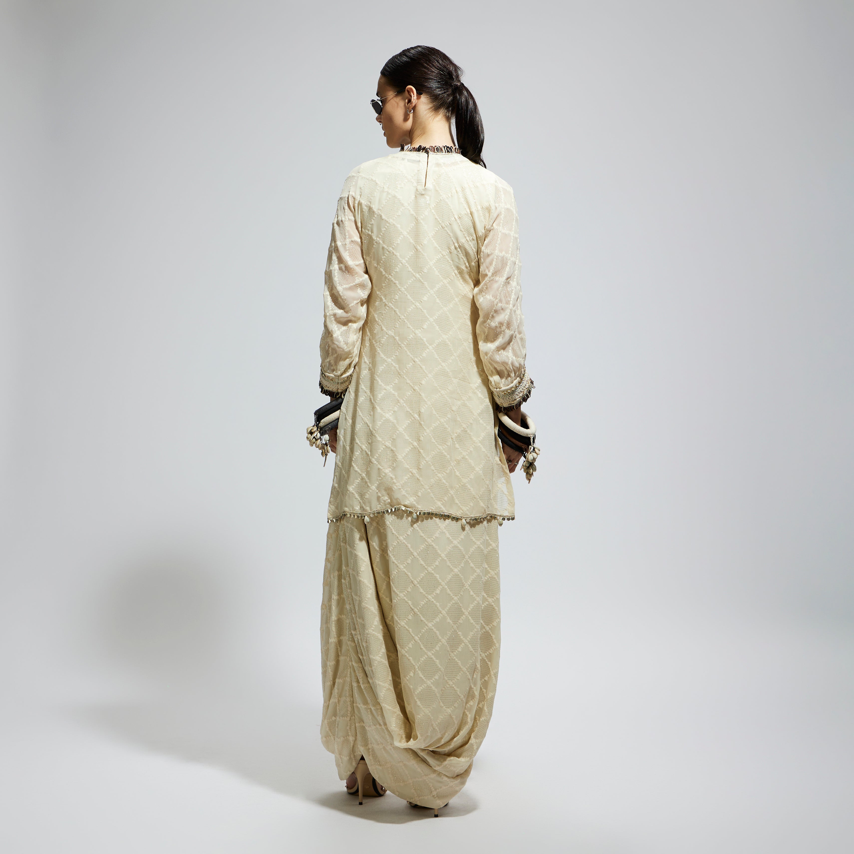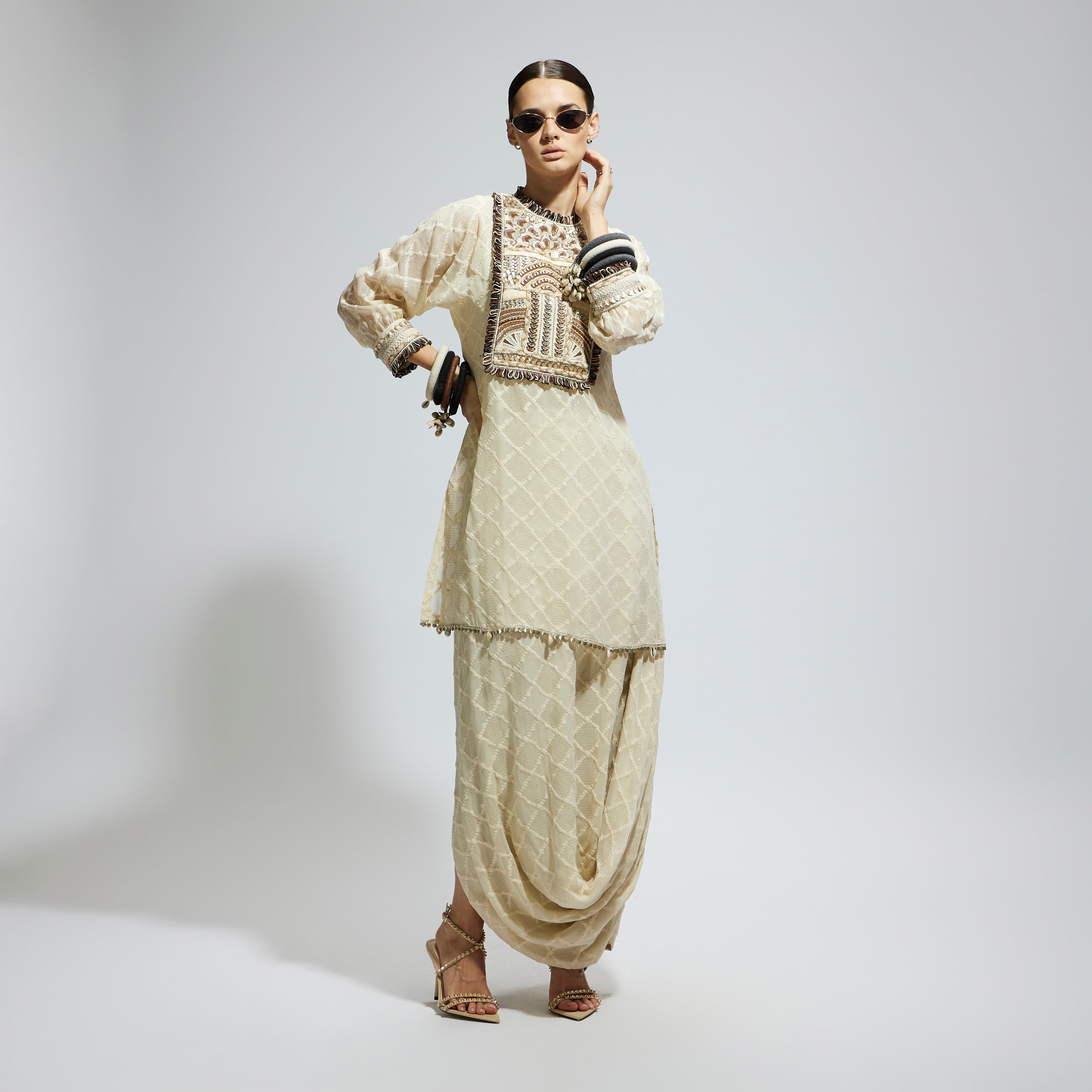 IVORY AZTEC YOKE EMBROIDERED TUNIC PAIRED WITH DRAPE SKIRT