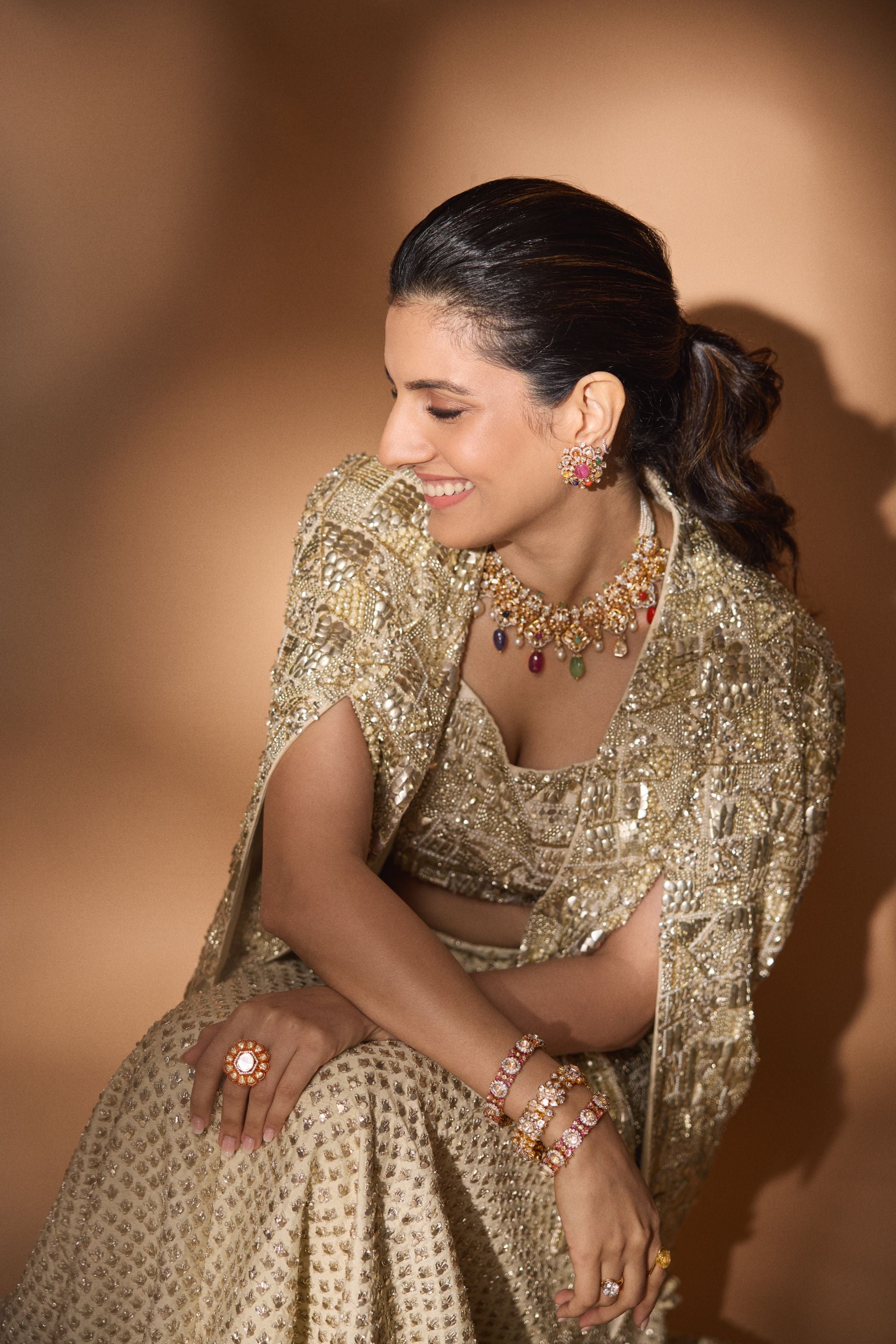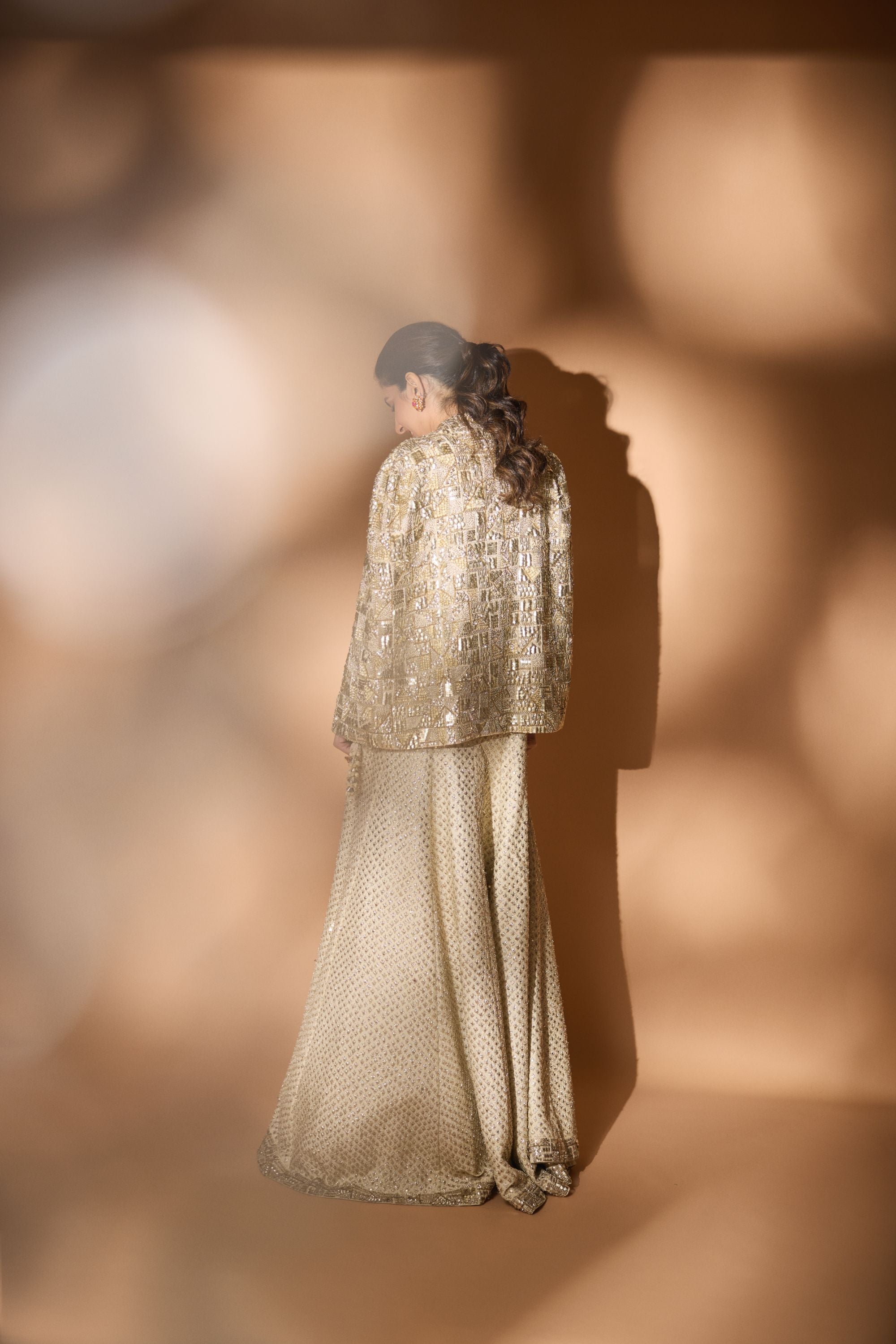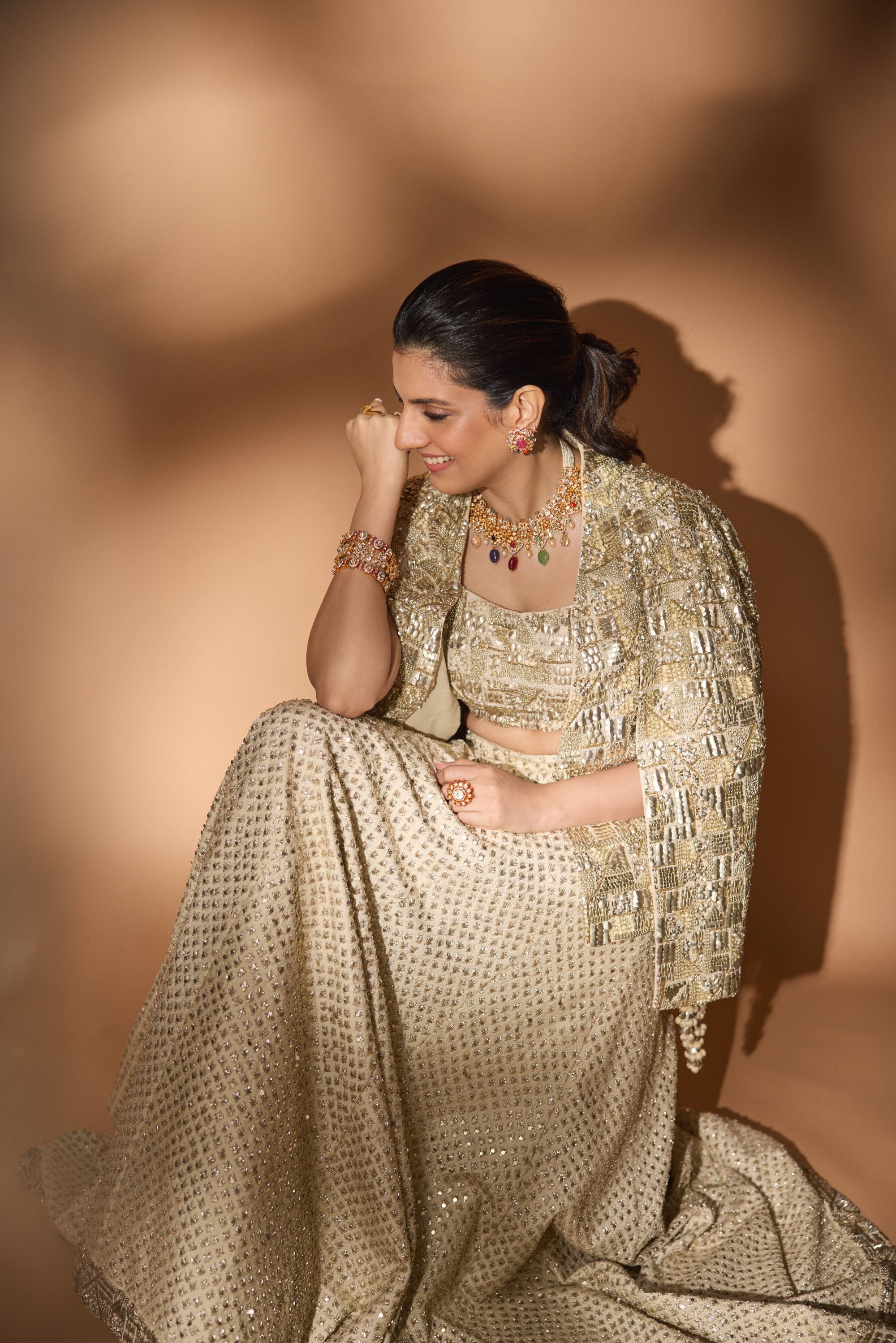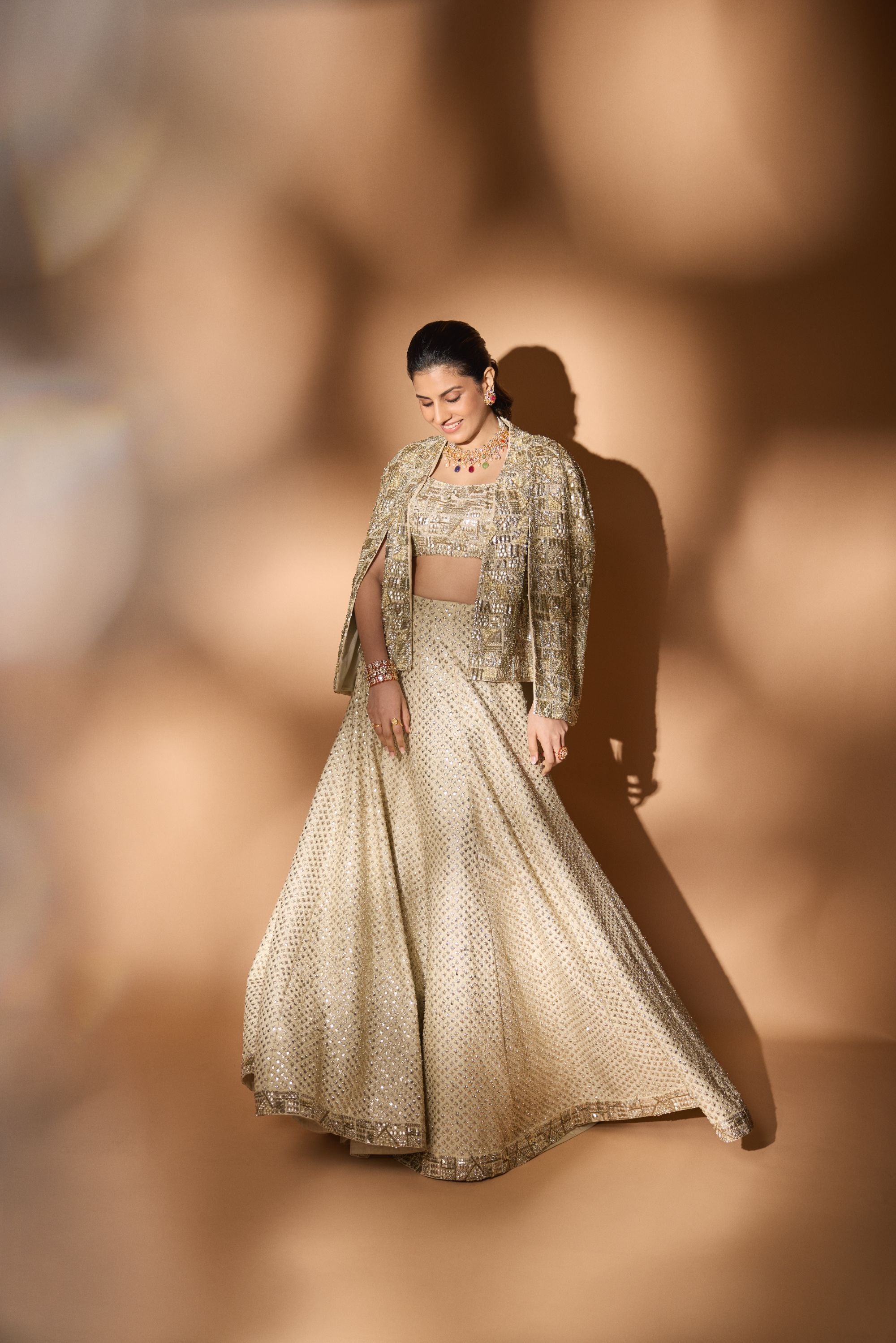 Featuring an ivory metallic noor jacket paired with an embellished bustier and highlighted lehenga