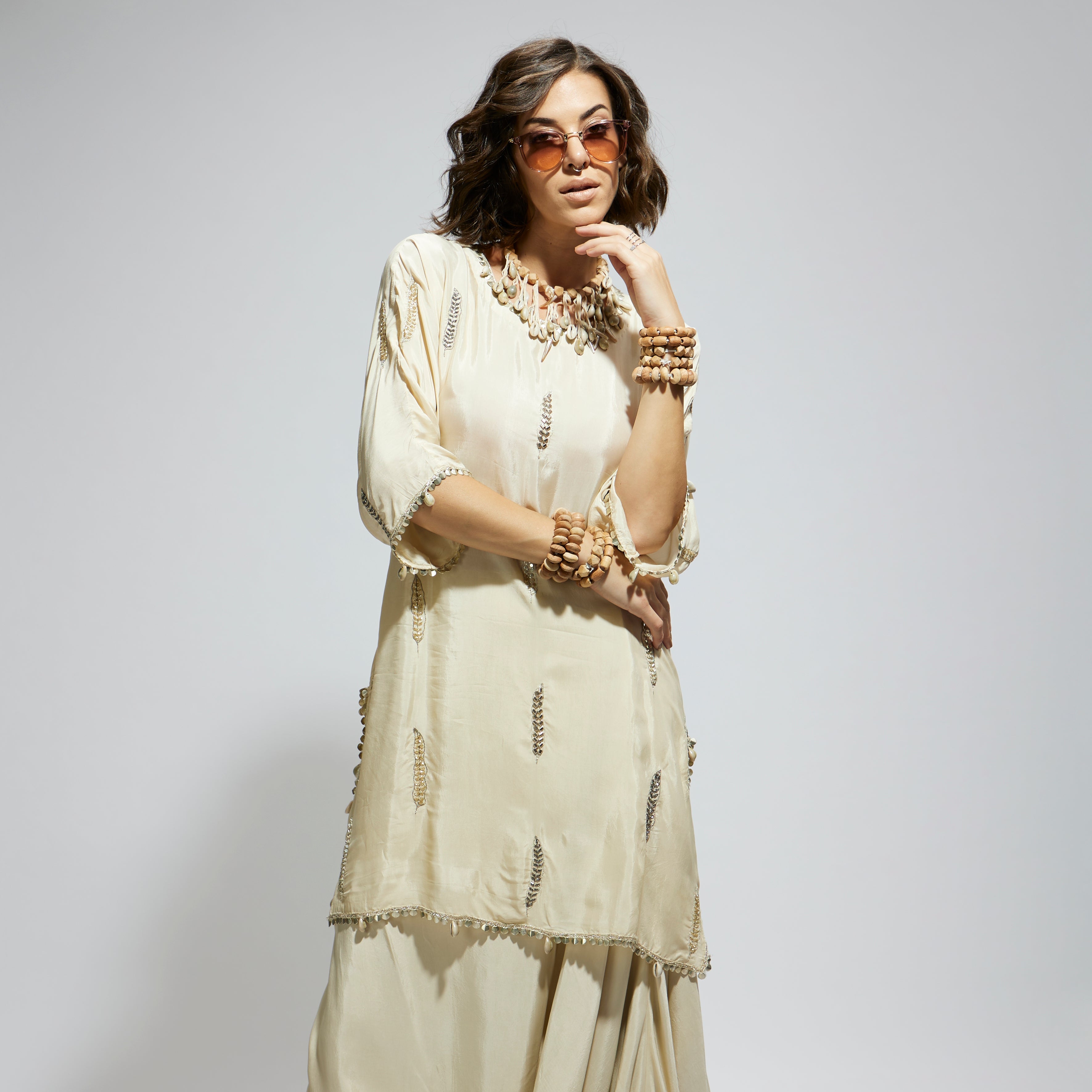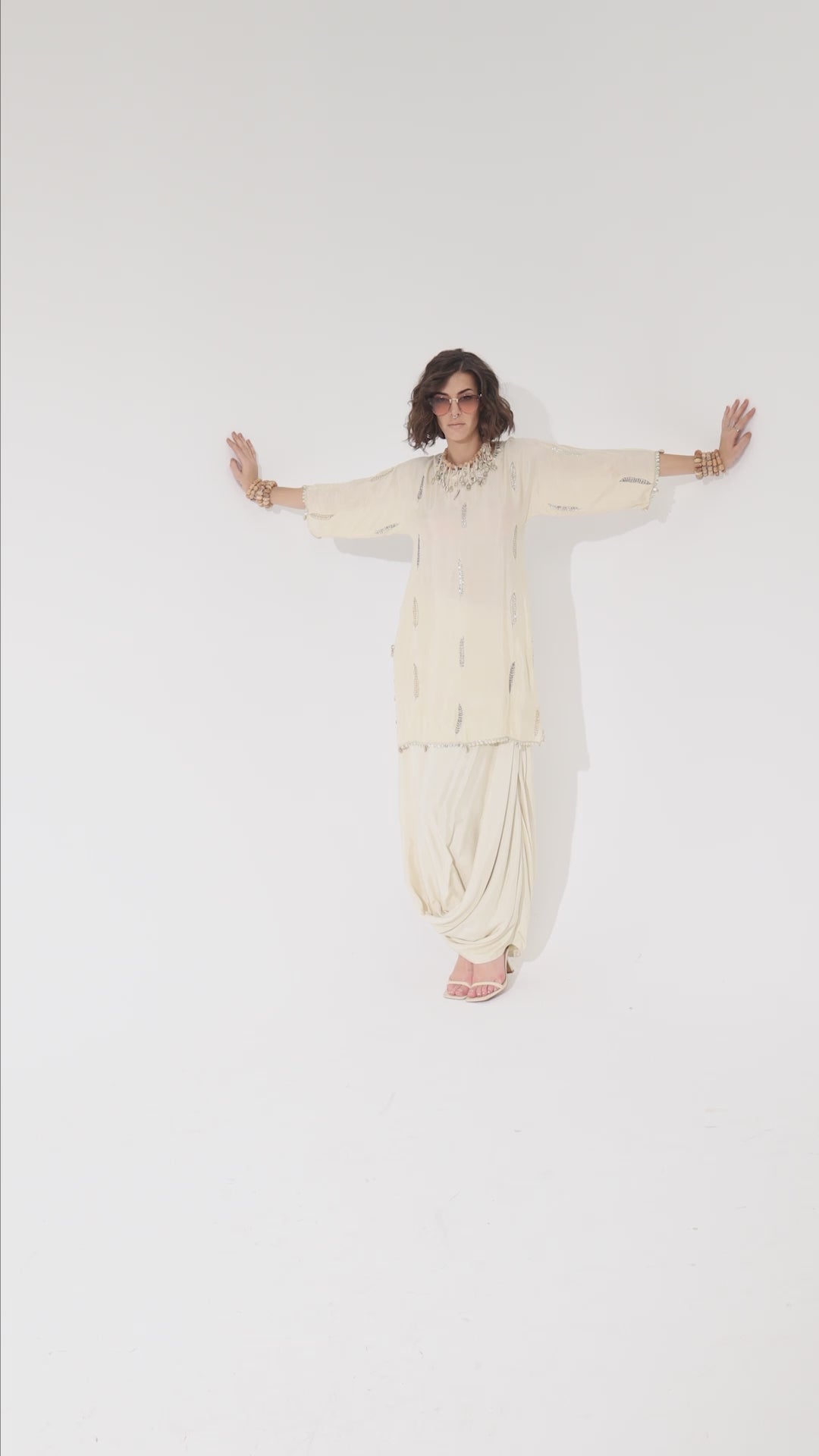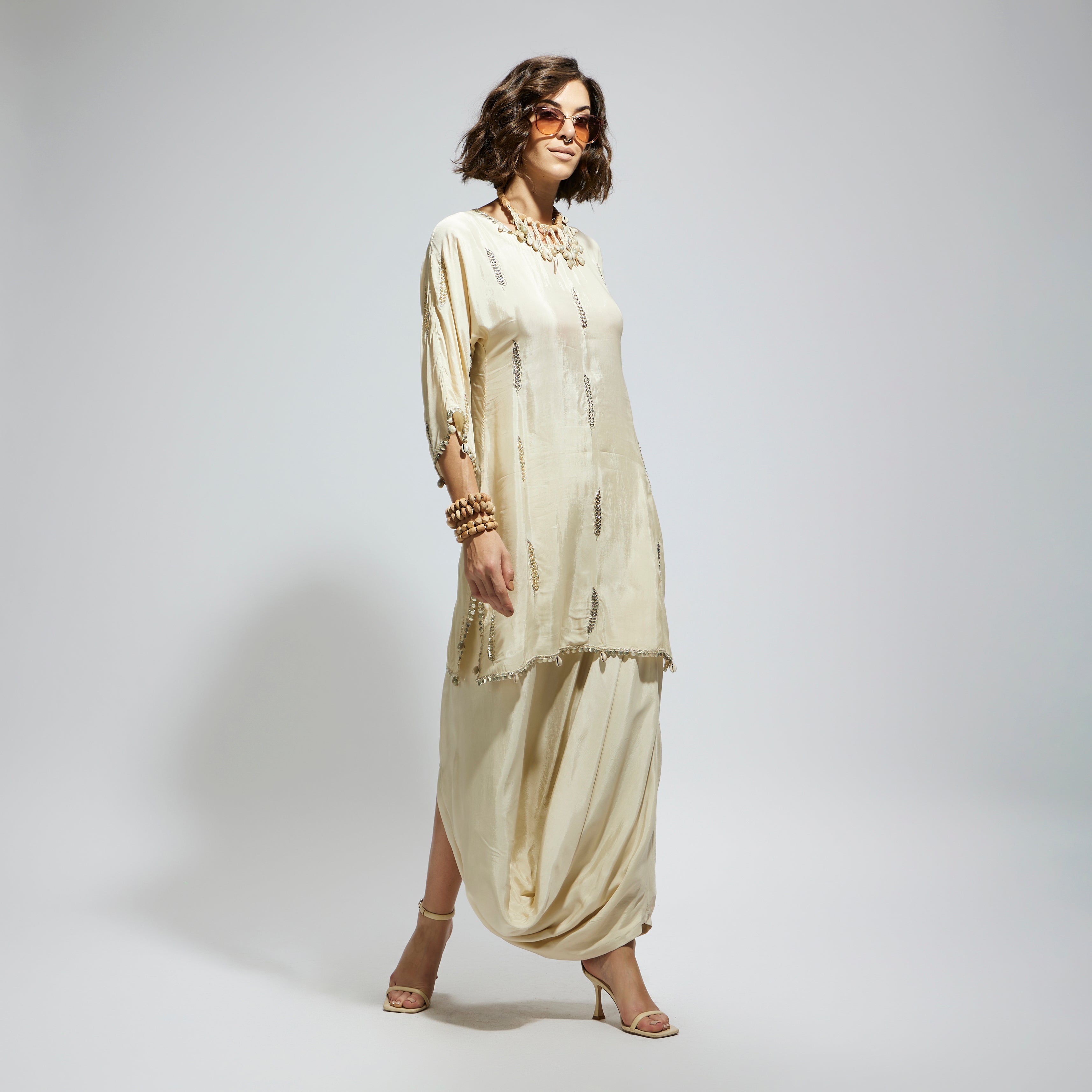 IVORY EMBELLISHED TUNIC WITH DRAPE SKIRT