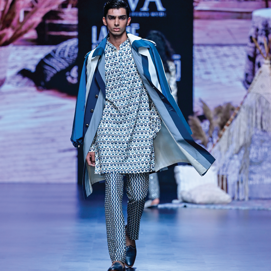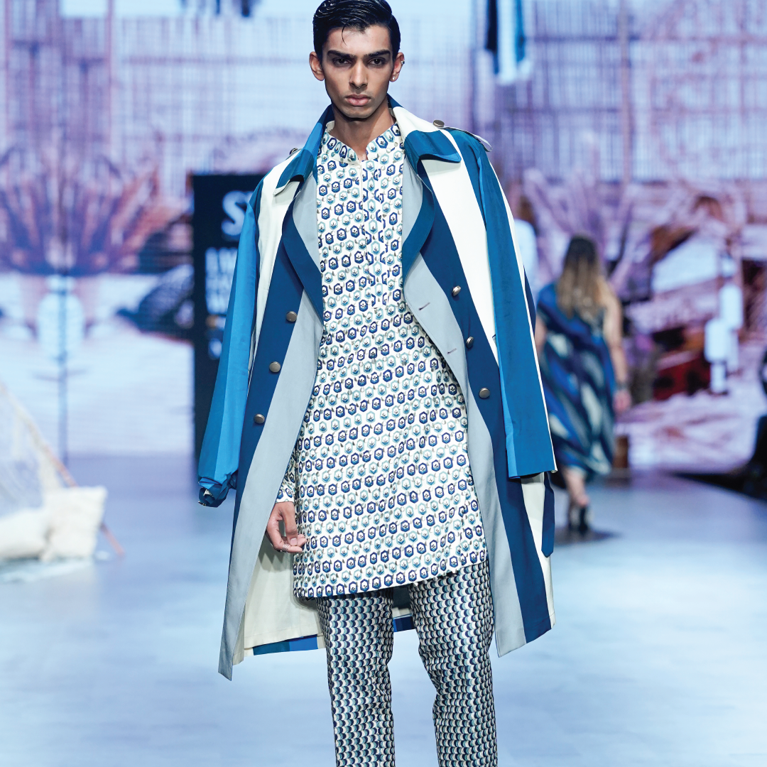 Featuring an ivory hexagon embellished kurta paired with blue scallop pants and blue stripe trench coat