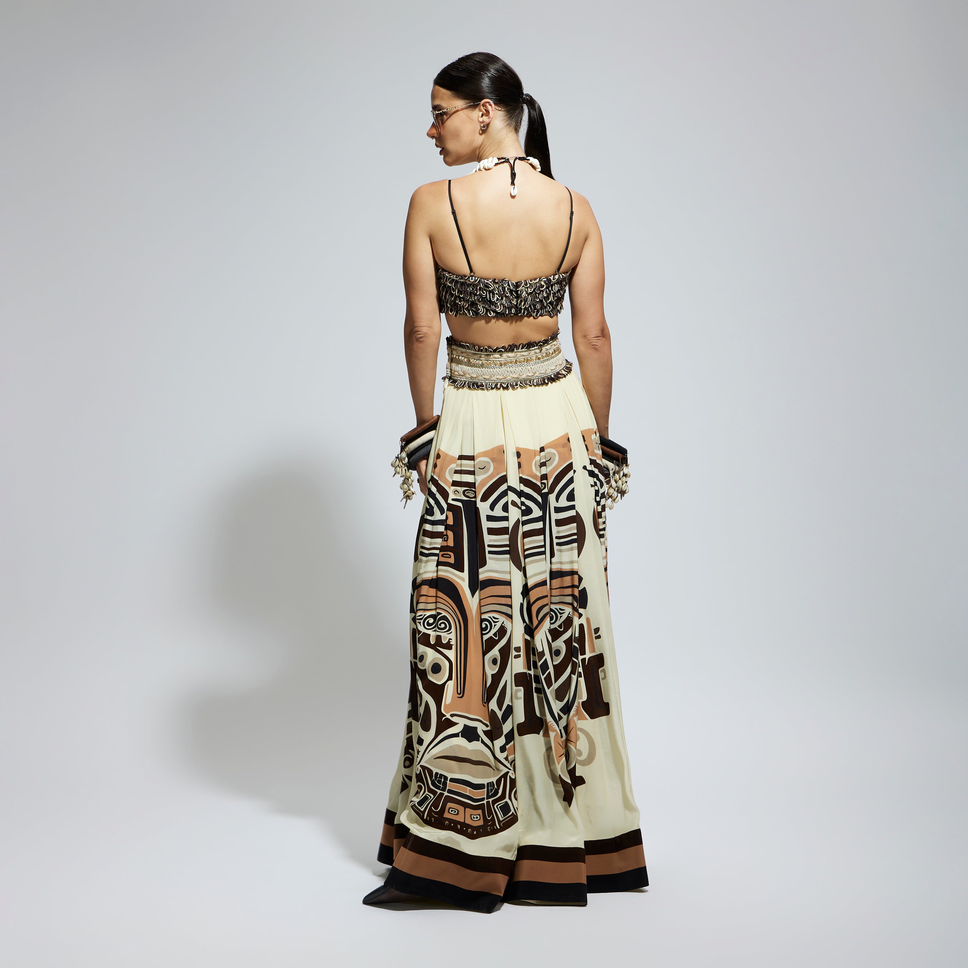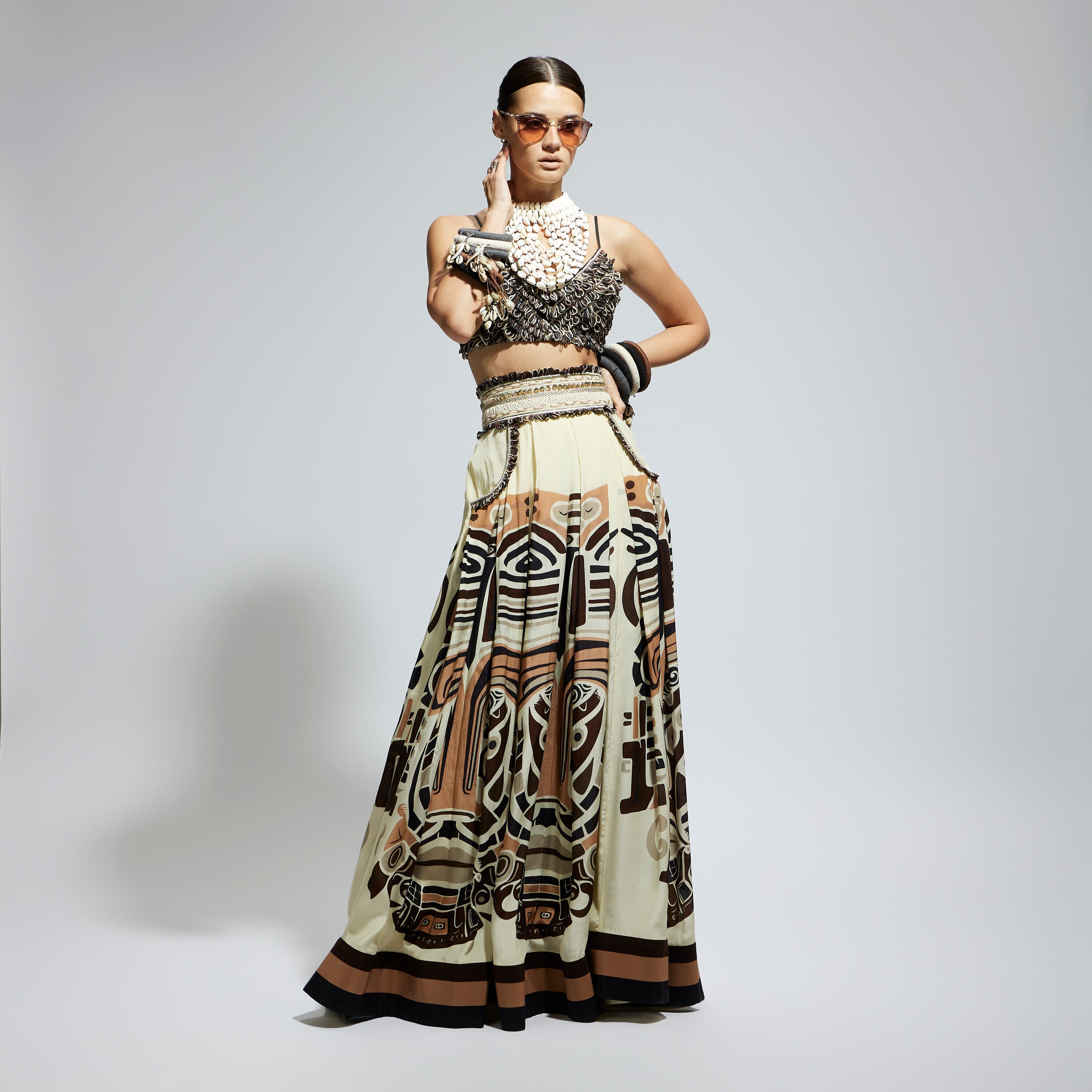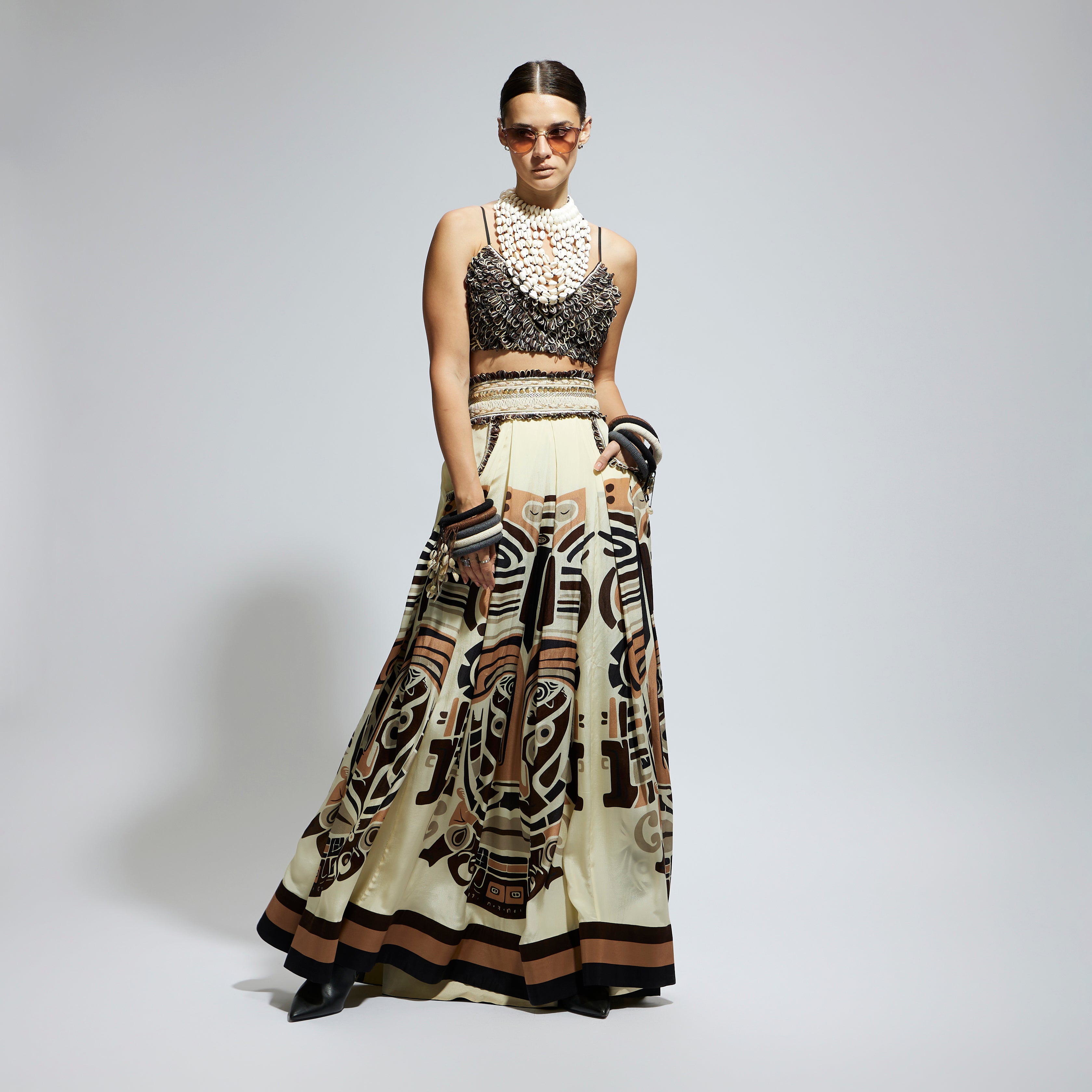 IVORY MASK PRINTED BOX PLEATED SKIRT WITH POCKETS TEAMED WITH A TEXTURED BUSTIER