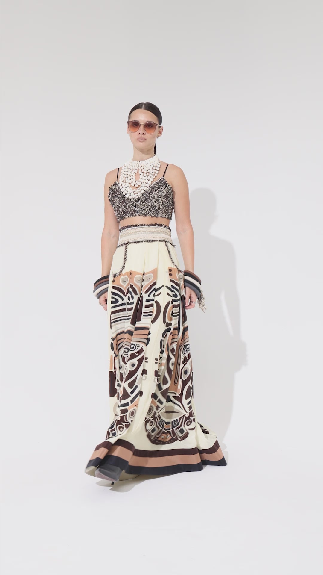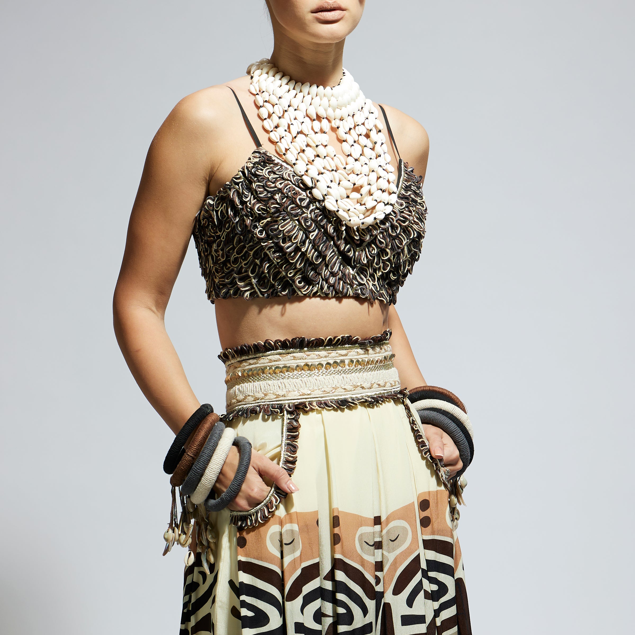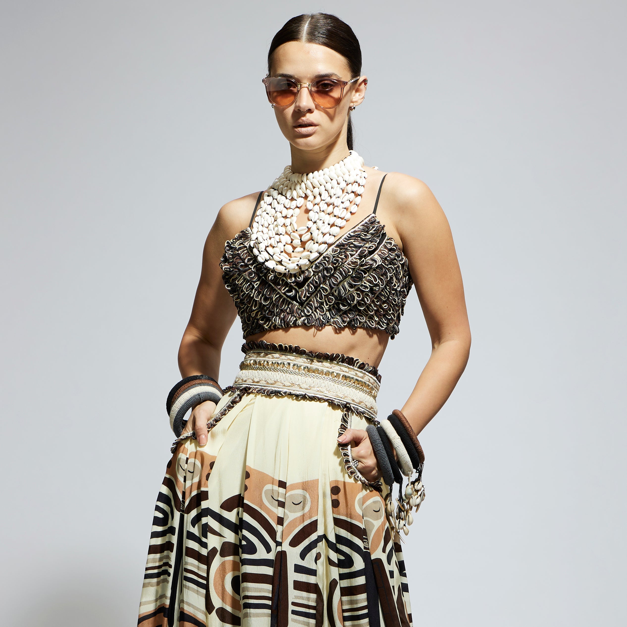 IVORY MASK PRINTED BOX PLEATED SKIRT WITH POCKETS TEAMED WITH A TEXTURED BUSTIER