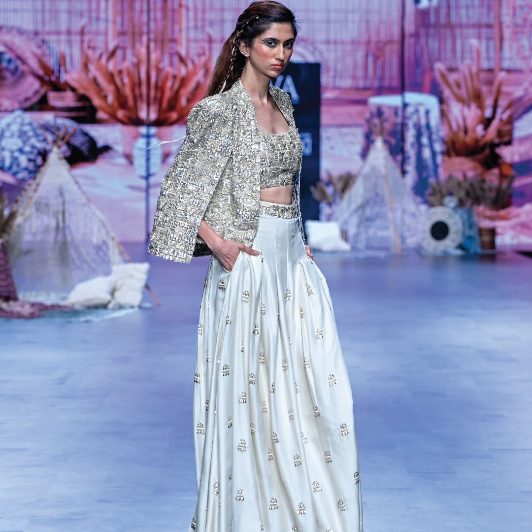 FEATURING AN IVORY METALLIC EMBELLISHED NOOR JACKET PAIRED WITH EMBELLISHED BUSTIER AND PLEATED PANTS