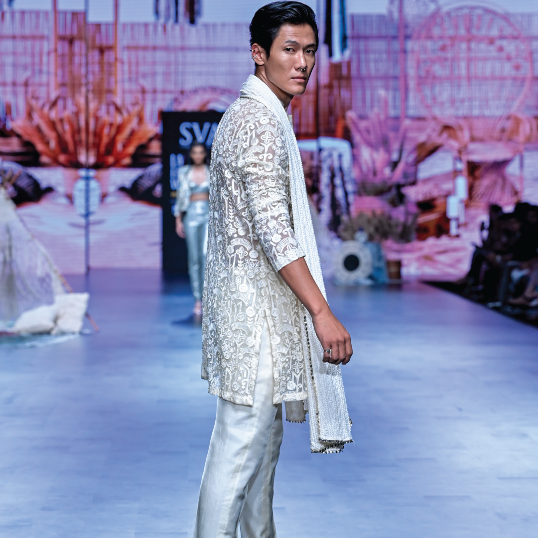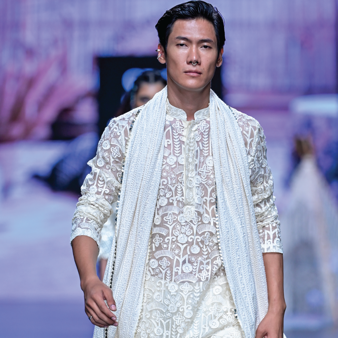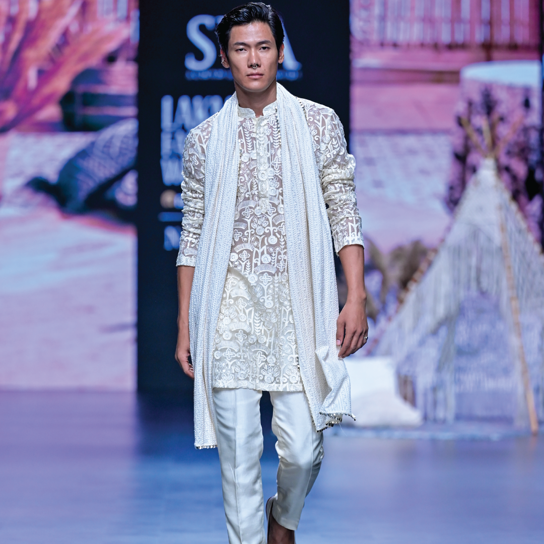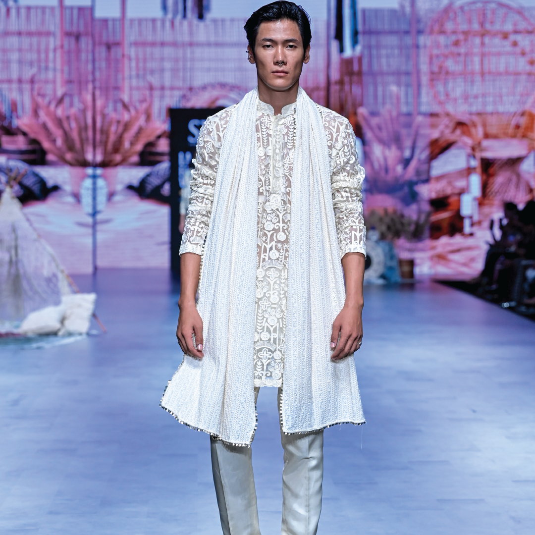 Featuring an ivory organza threadwork kurta paired with pants and lucknowi dupatta