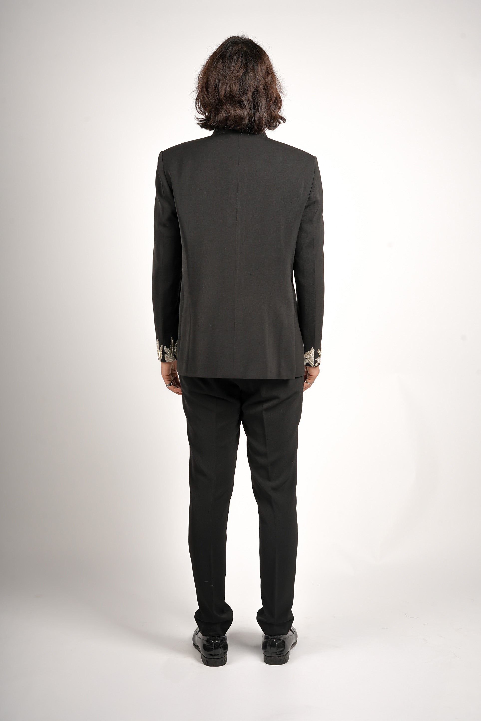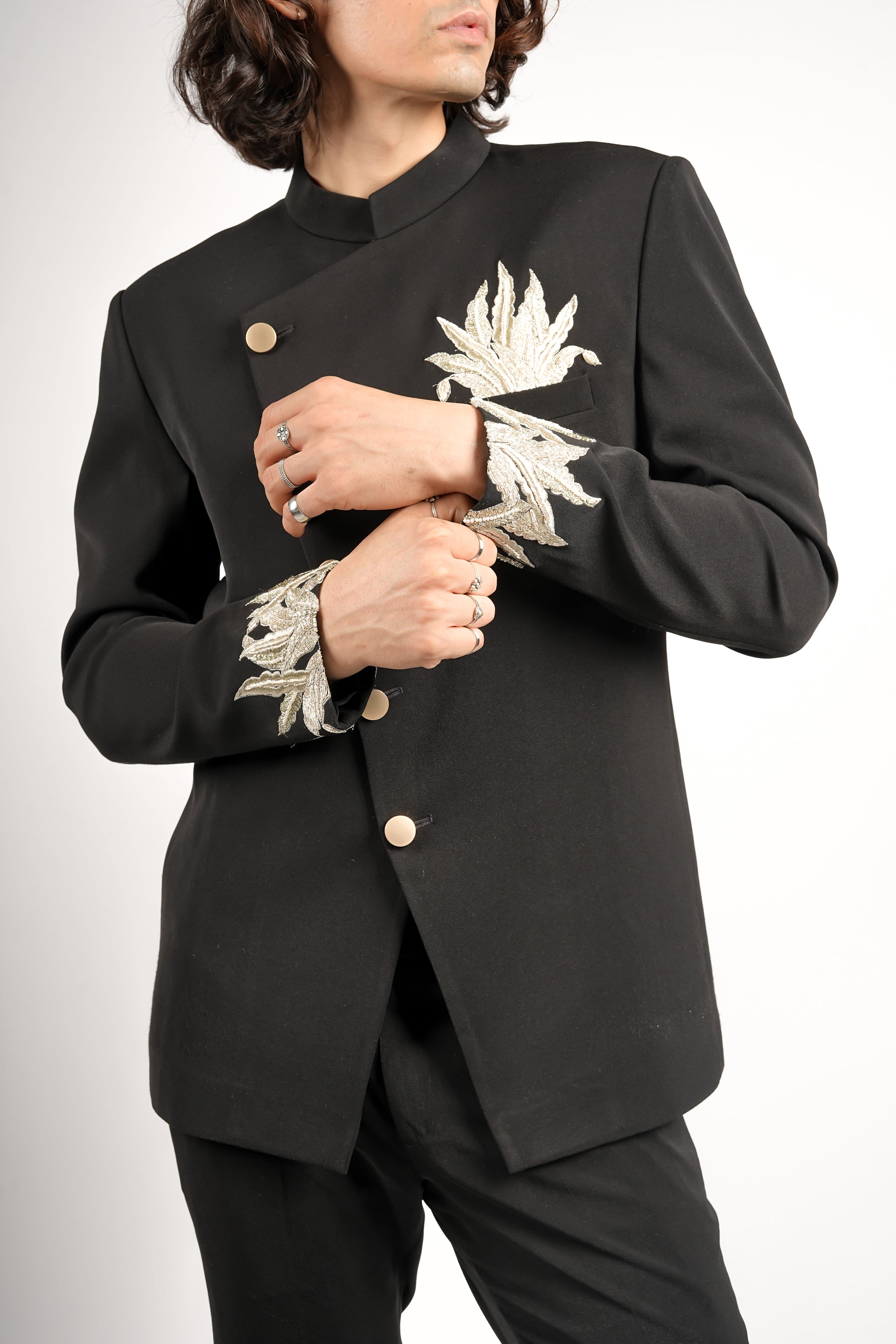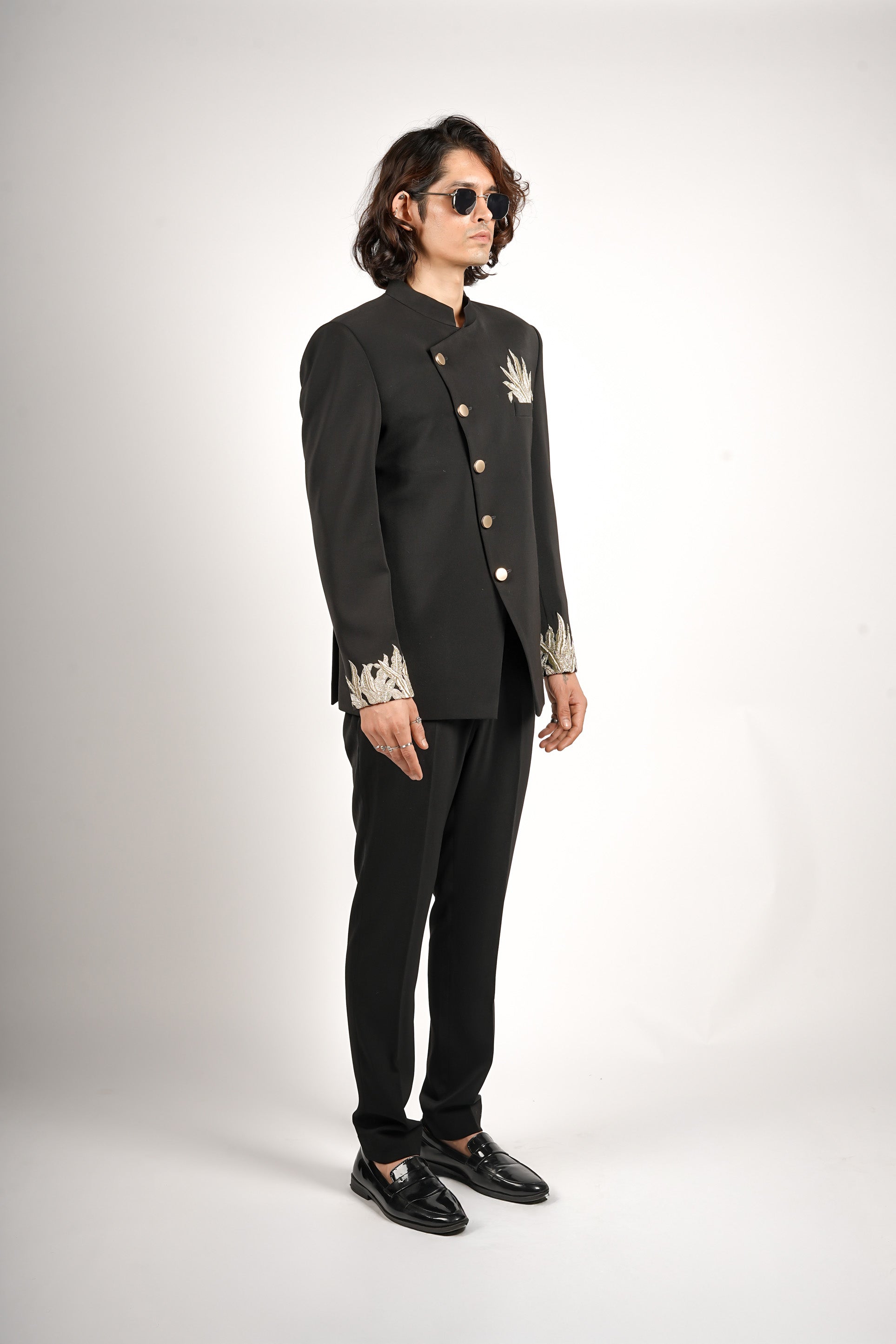 This is a powerful, contemporary black Bandhgala jacket with a dramatic angular button placket. It is distinguished by bold, golden and silver palm leaf embroidery detailing the chest and cuffs. Paired with sleek black tailored trousers, this ensemble creates an edgy, high-contrast, and highly formal look.