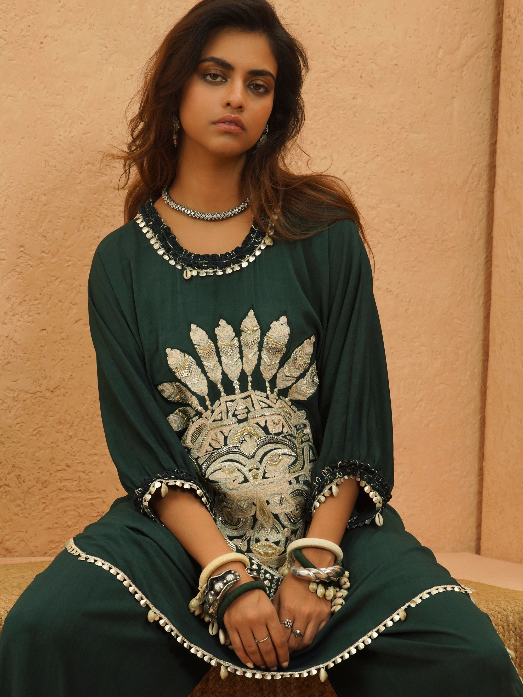 This co-ord set features an oversized tunic with a striking tribal-inspired embroidered mask, paired with relaxed wide-leg pants for effortless elegance. The deep emerald hue is accented with intricate detailing along the neckline, sleeves, and hem, finished with delicate tassel embellishments. The fluid silhouette and lightweight fabric make it a perfect blend of comfort and statement style, ideal for festive or resort wear.