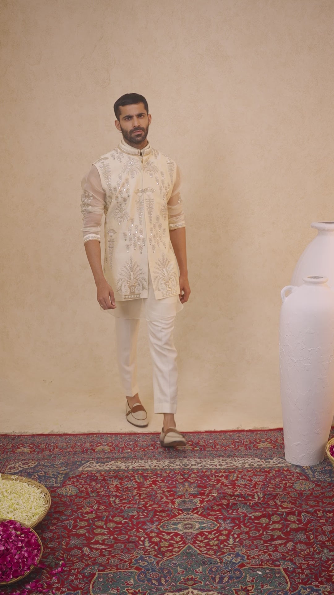 Featuring a magnolia embellished bundi paired with ivory organza kurta and pant.