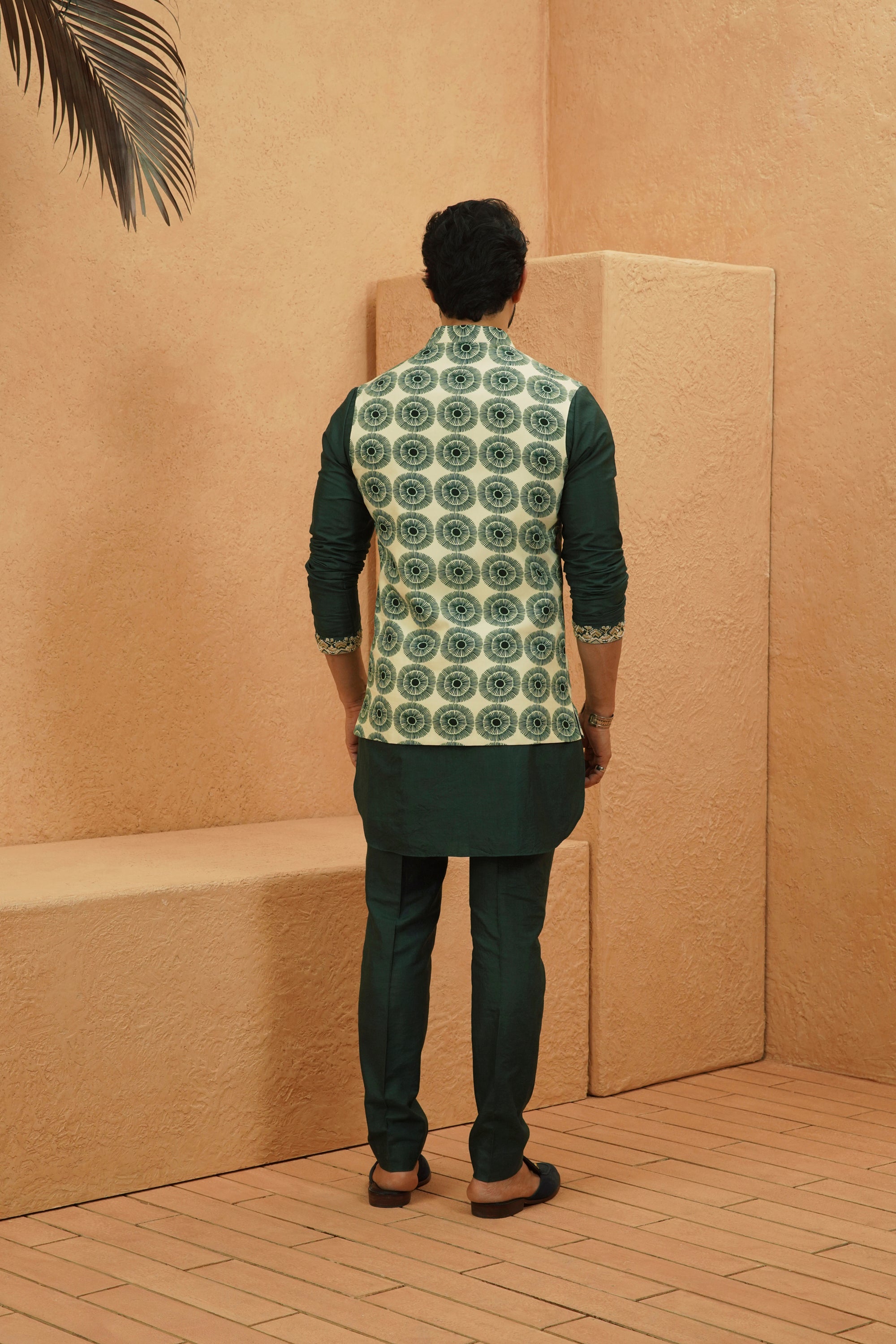 This ensemble with an ivory bundi adorned intricate protea motifs in green. The bold print make it a standout look, perfect for festive and celebratory occasions. Can be paired with a deep green kurta.