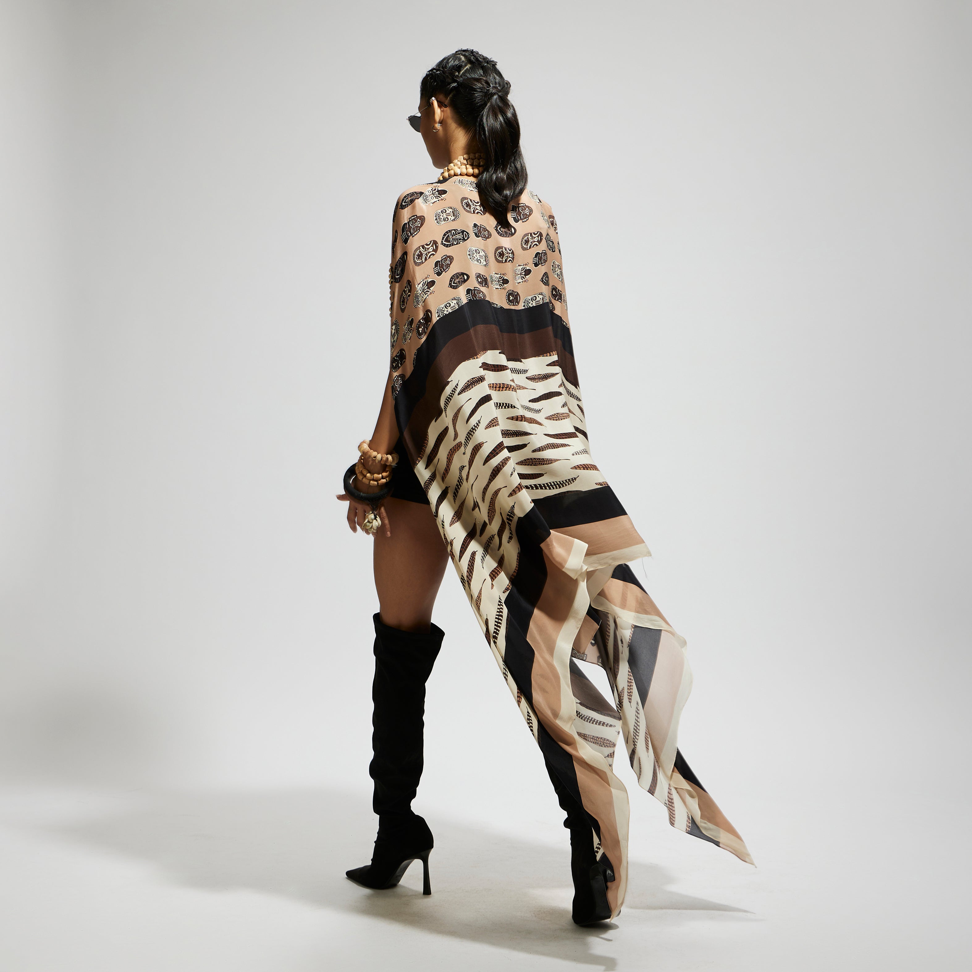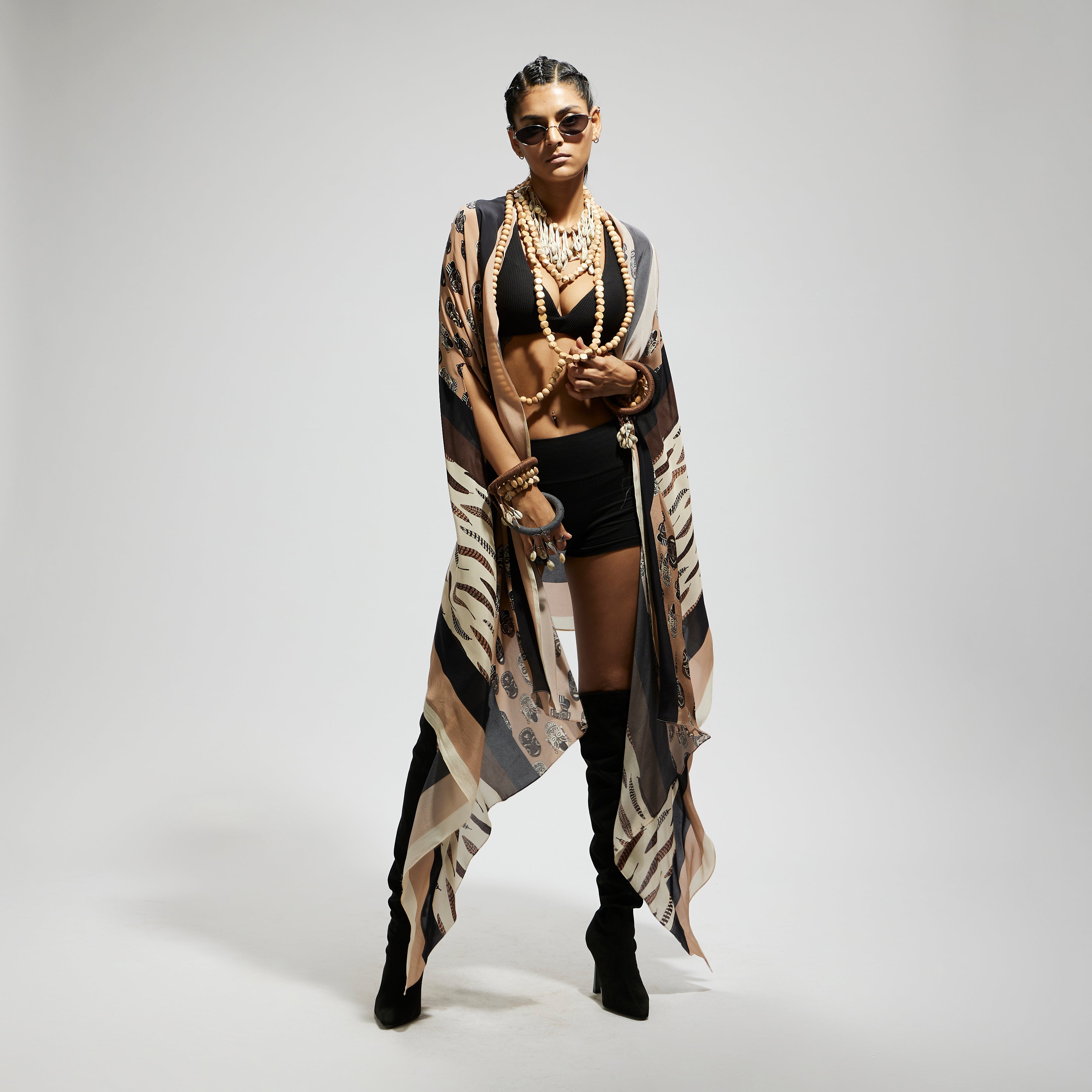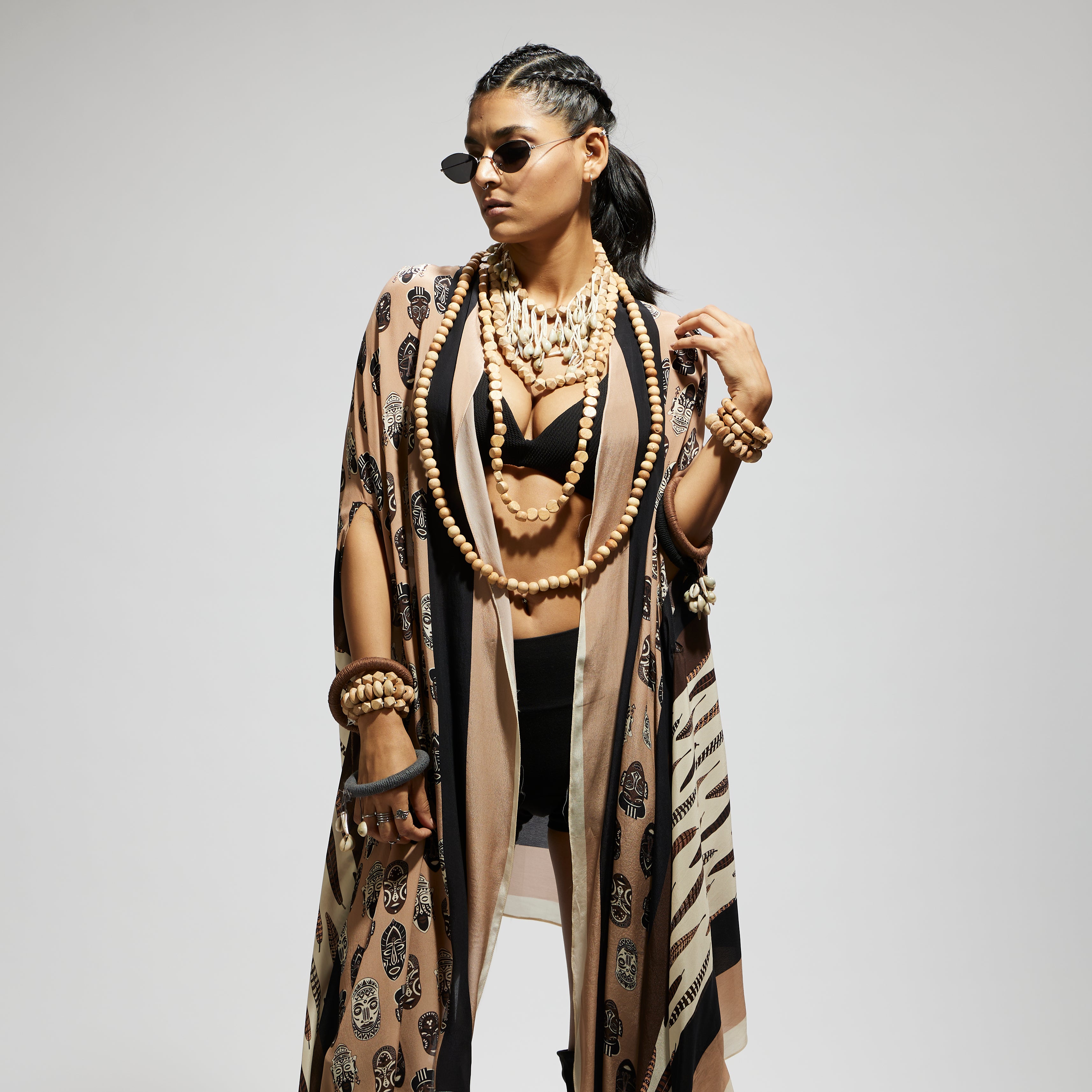 Featuring a mask and feather cape, fabric Crepe, Component 1
