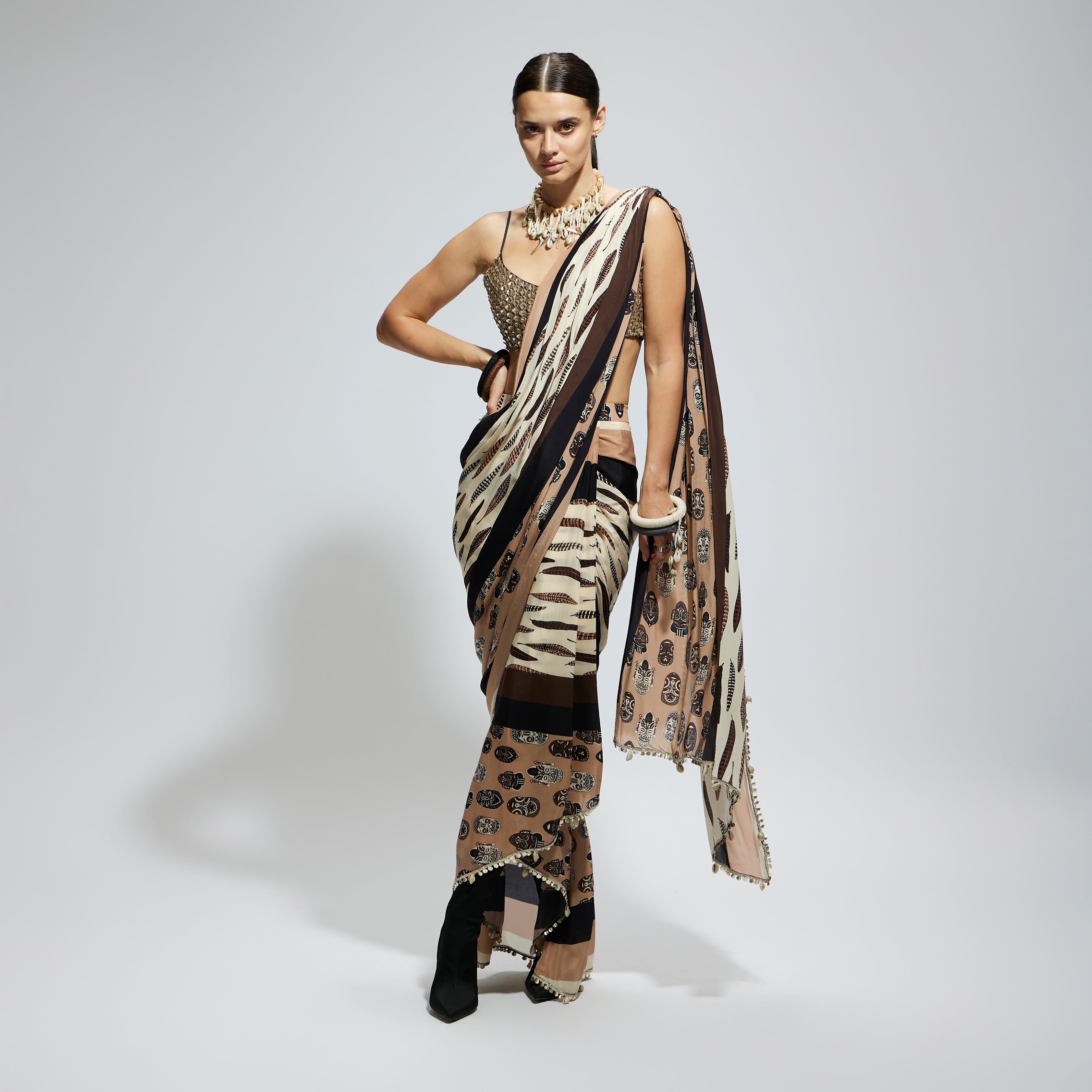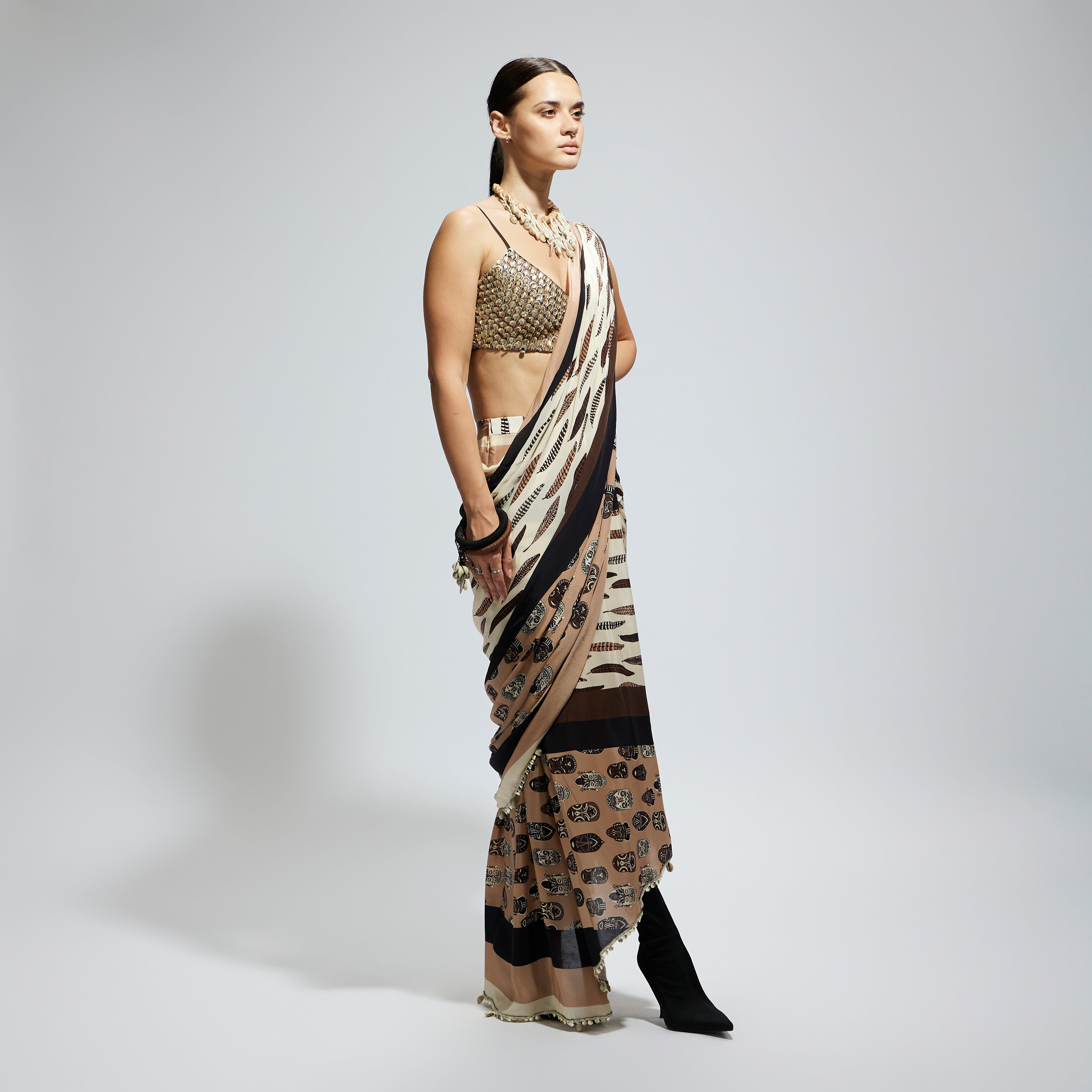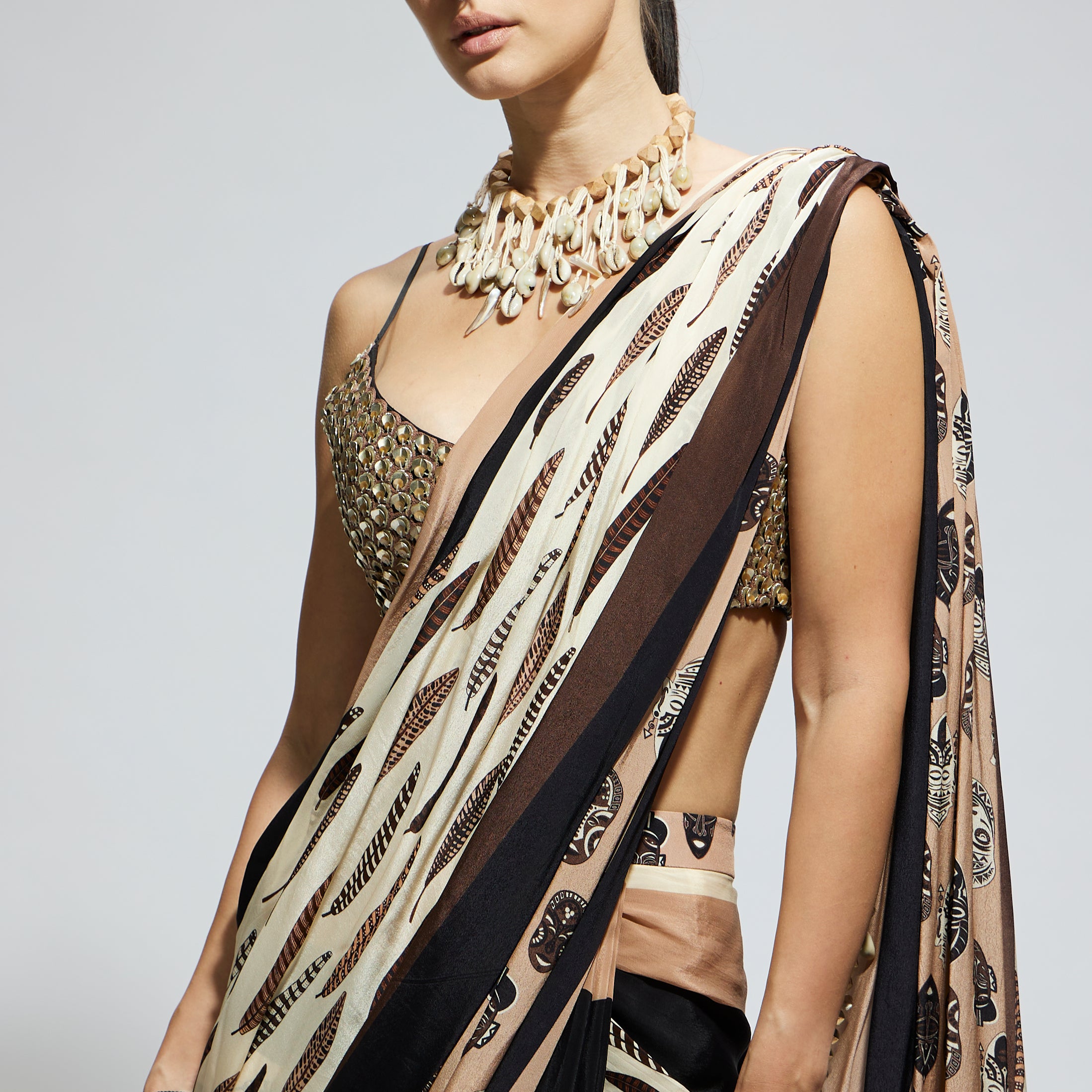 MASK AND FEATHER PRINT CASCADE SAREE PAIRED WITH METALLIC SCALLOP BUSTIER