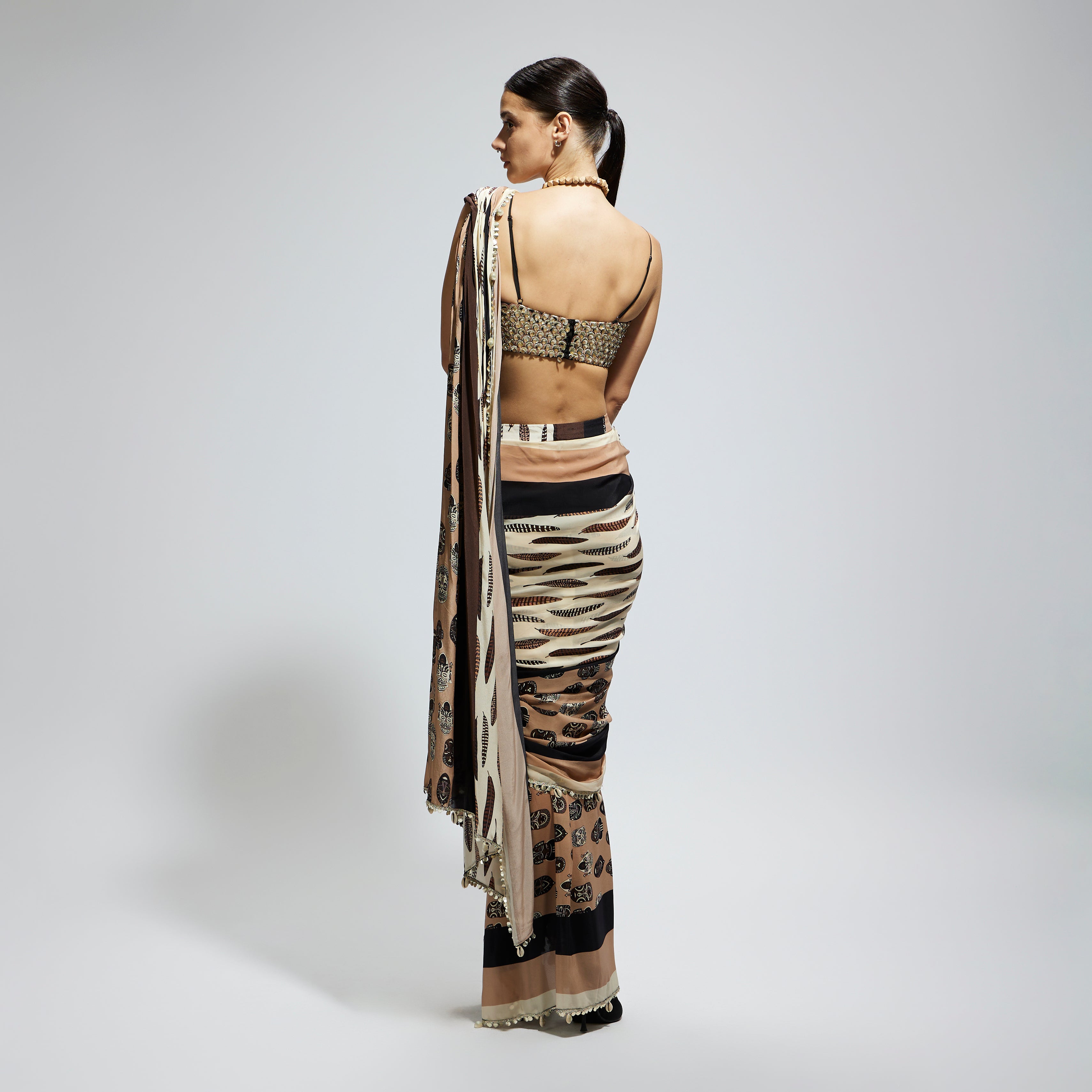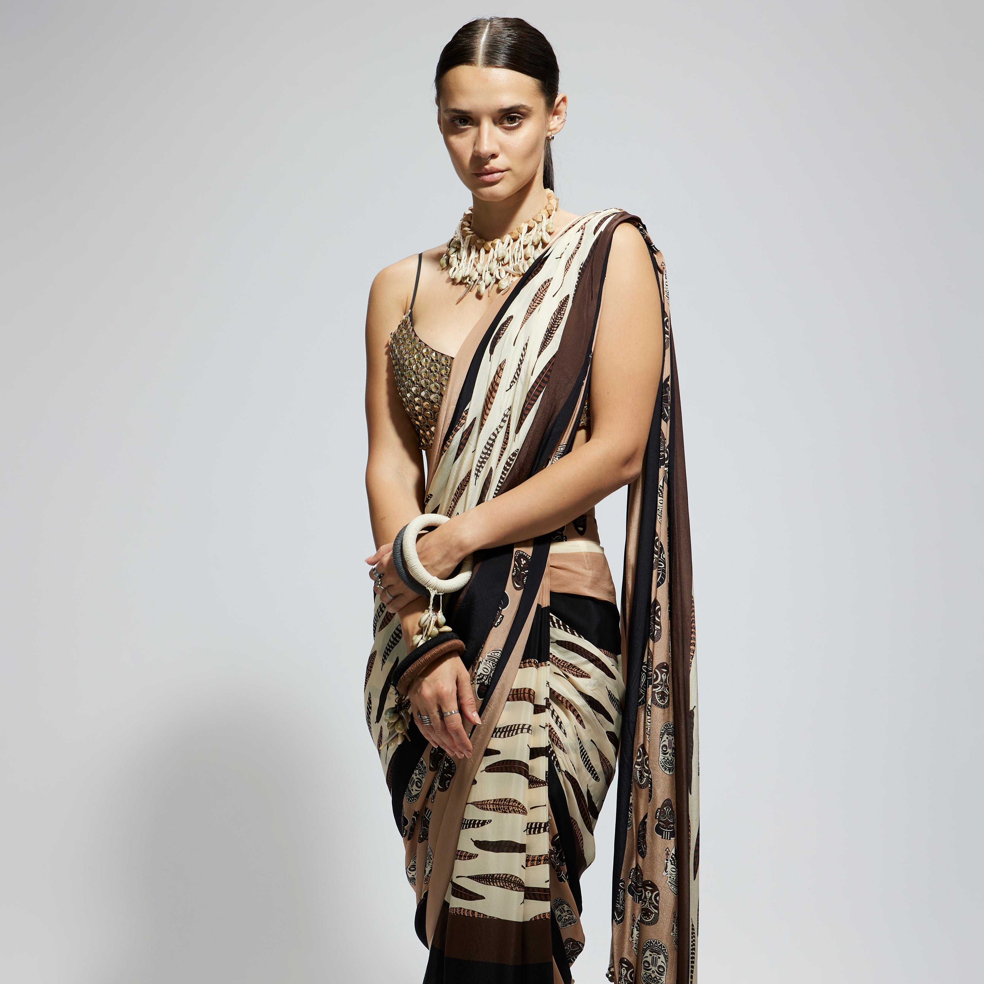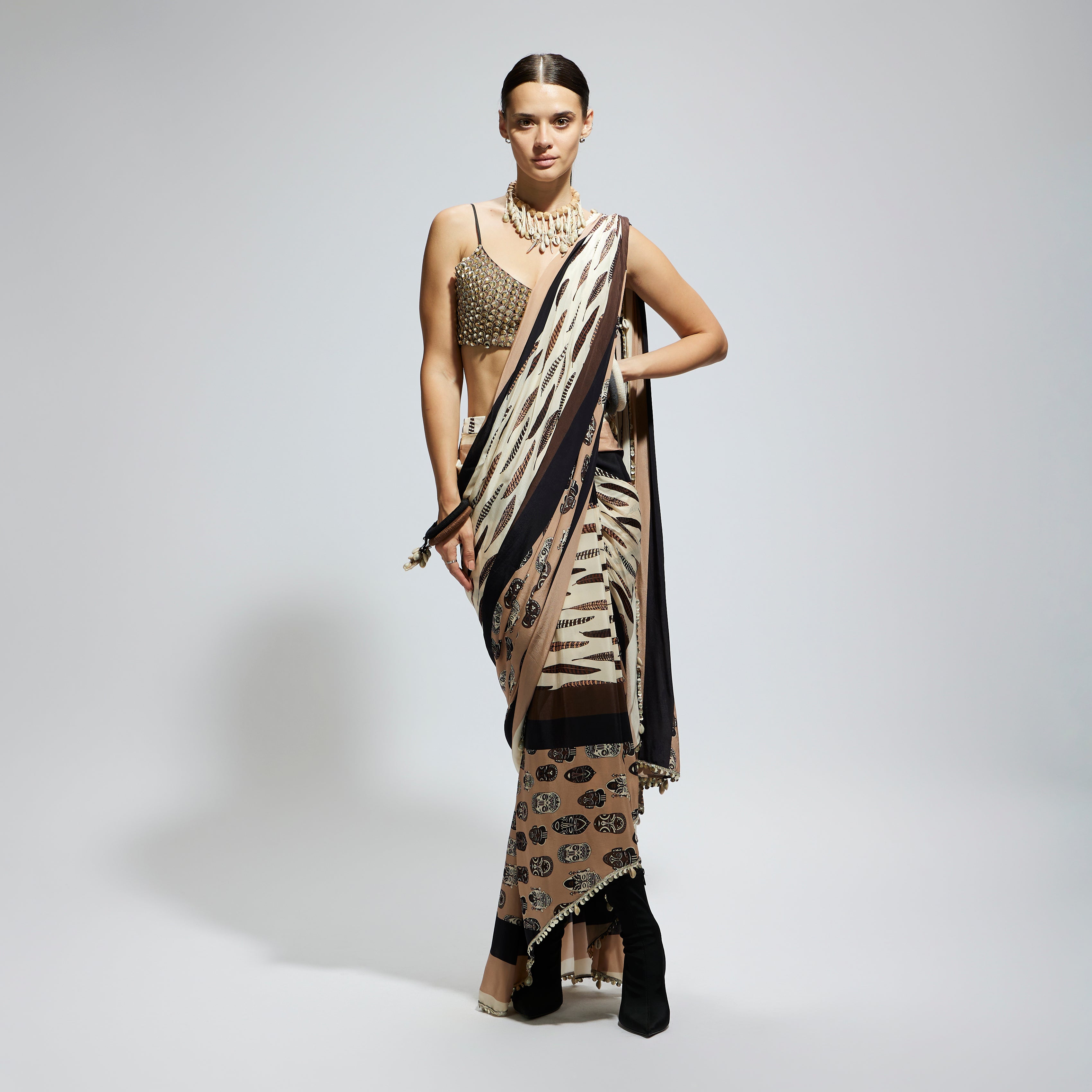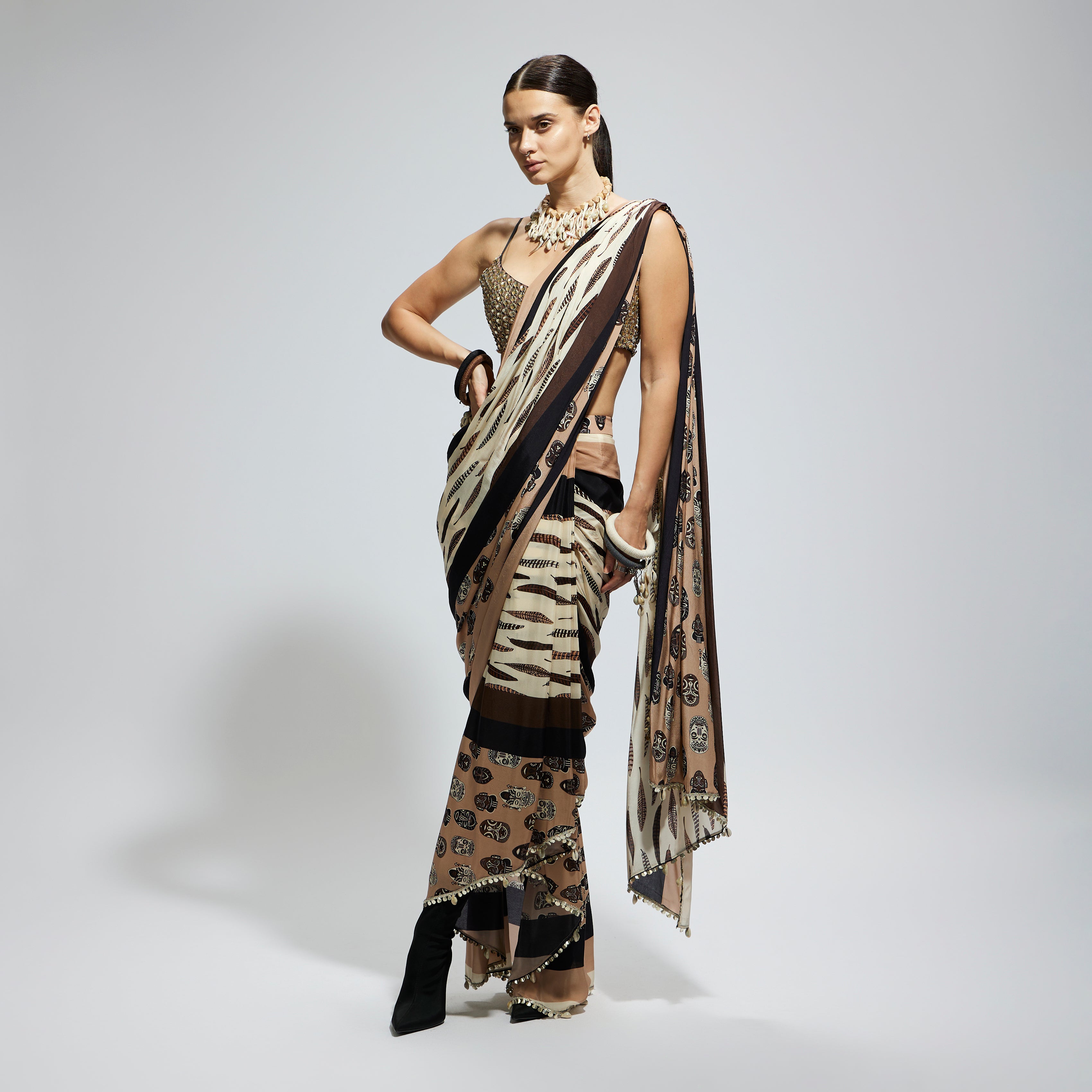 MASK AND FEATHER PRINT CASCADE SAREE PAIRED WITH METALLIC SCALLOP BUSTIER