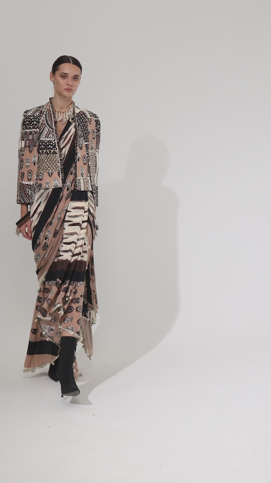 Featuring a mask and feather print cascade saree paired with metallic scallop bustier, fabric crepe, and habutai, Component 2.