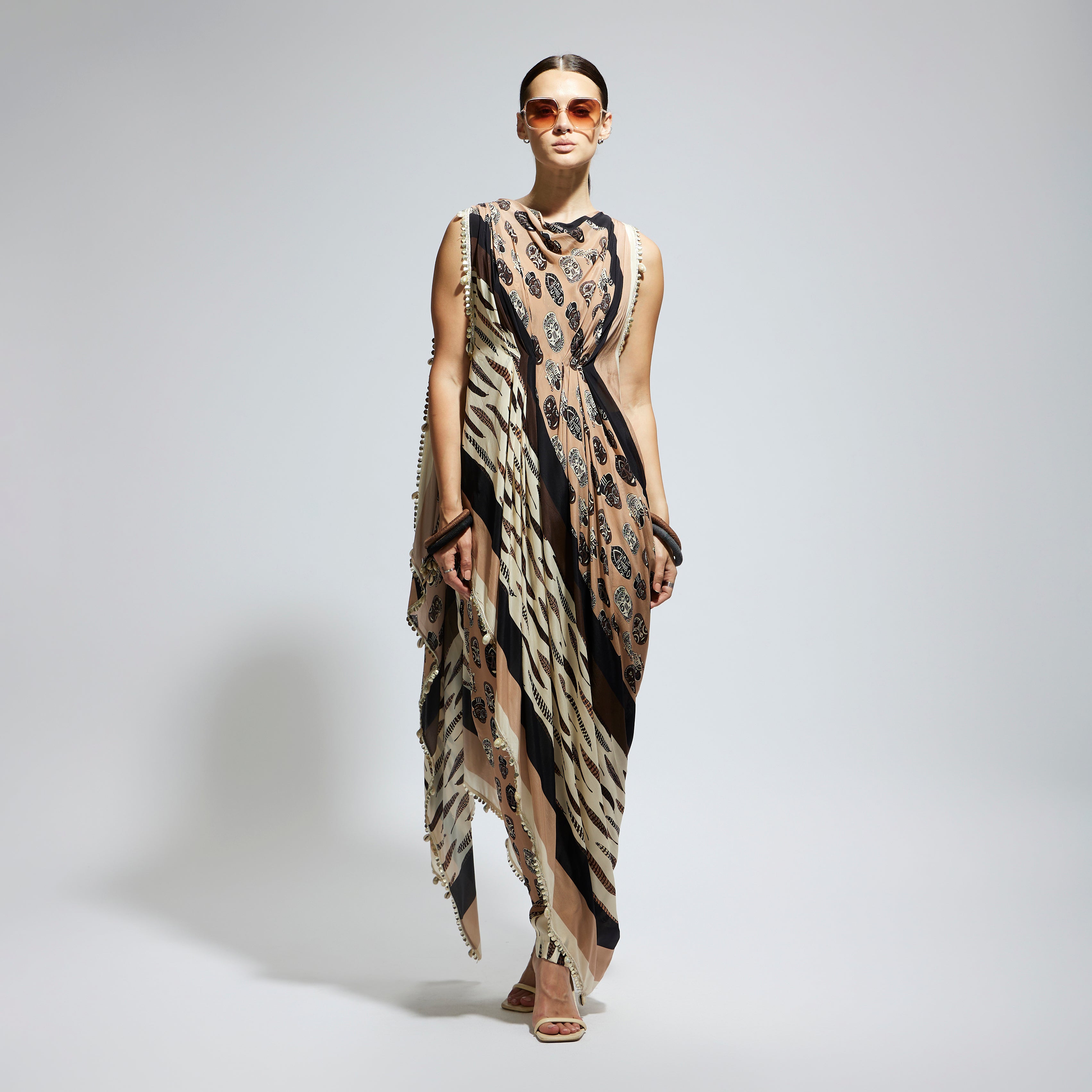 The mask and feather print crop top with attached drape and Kodi tassel border with pant, Fabric Crepe, Component 2.