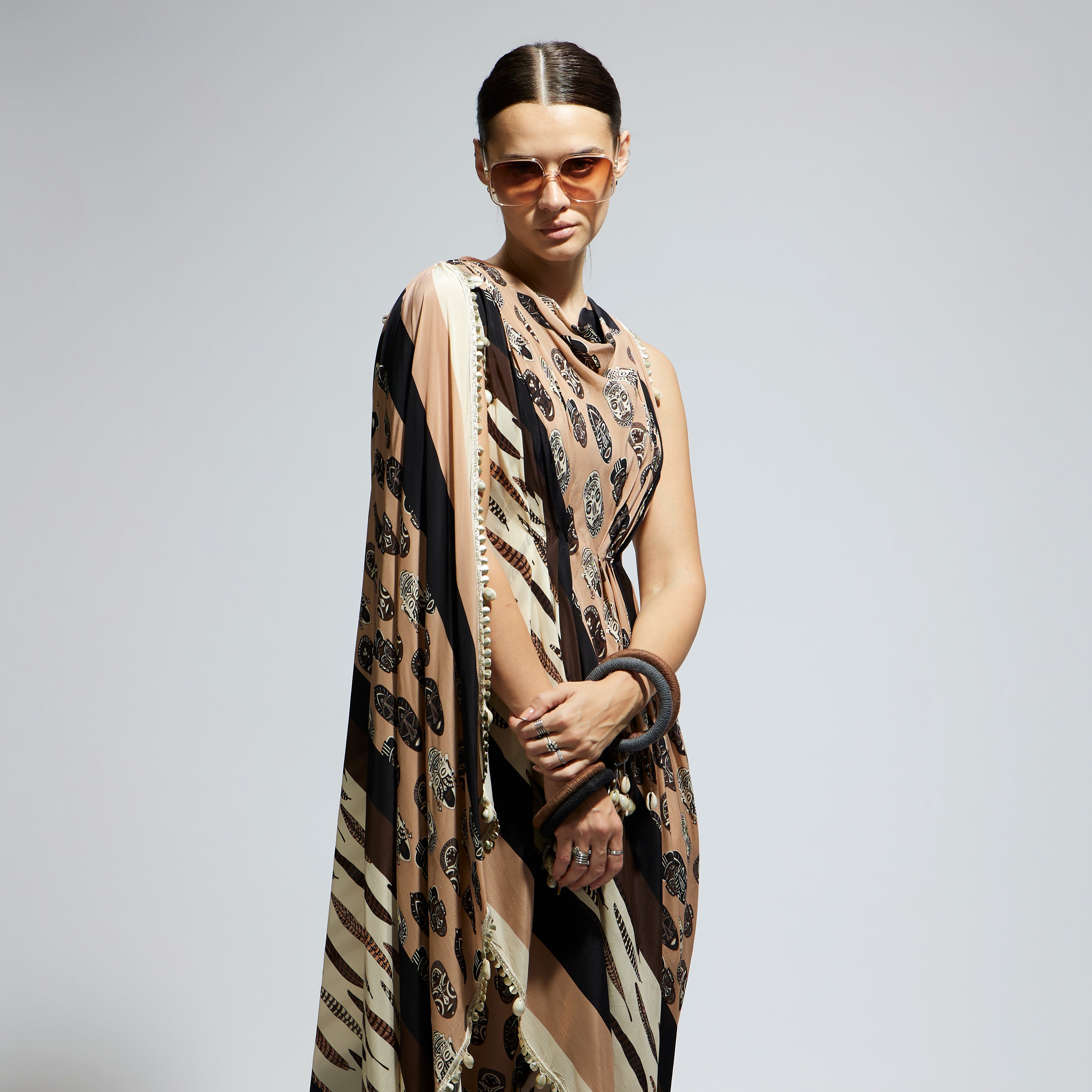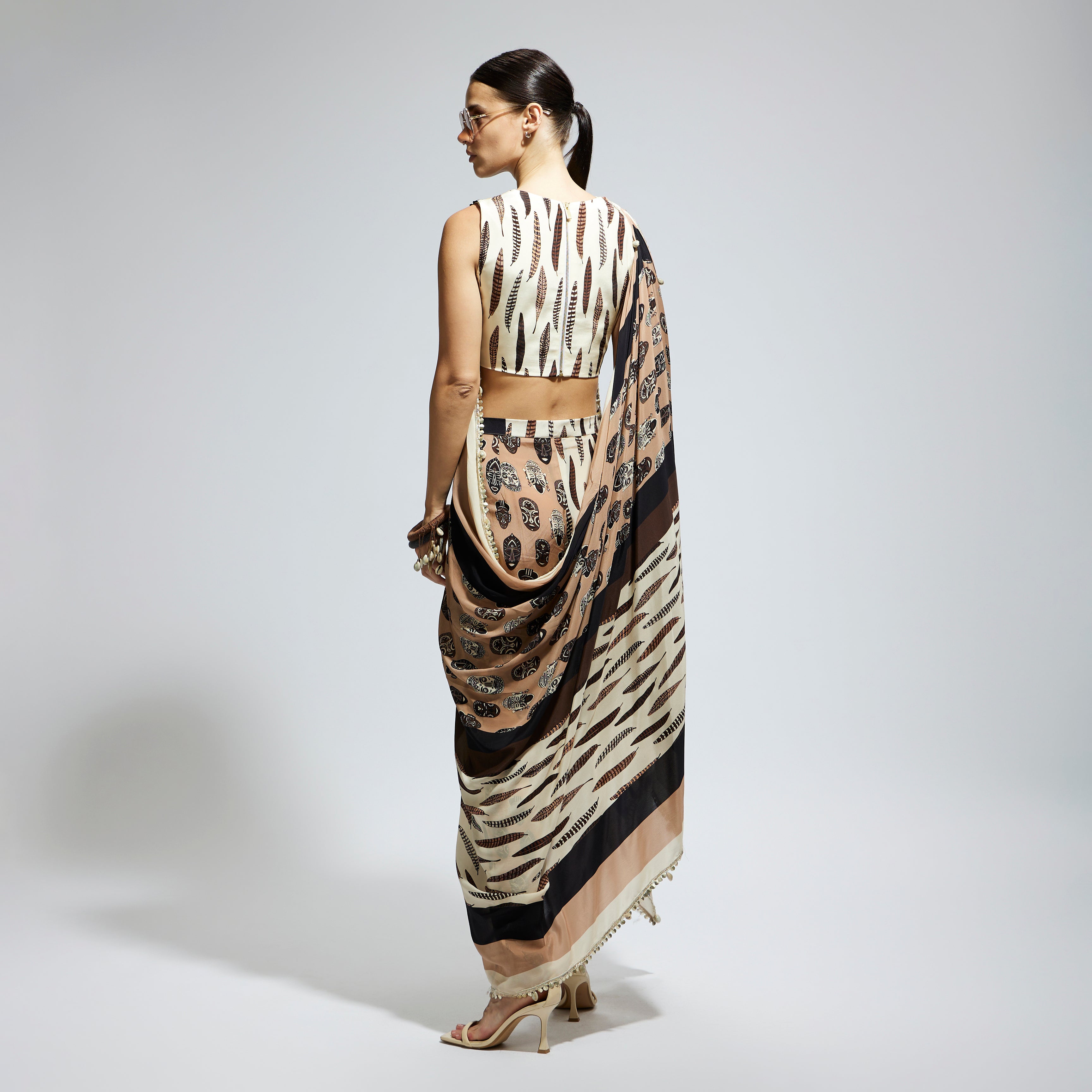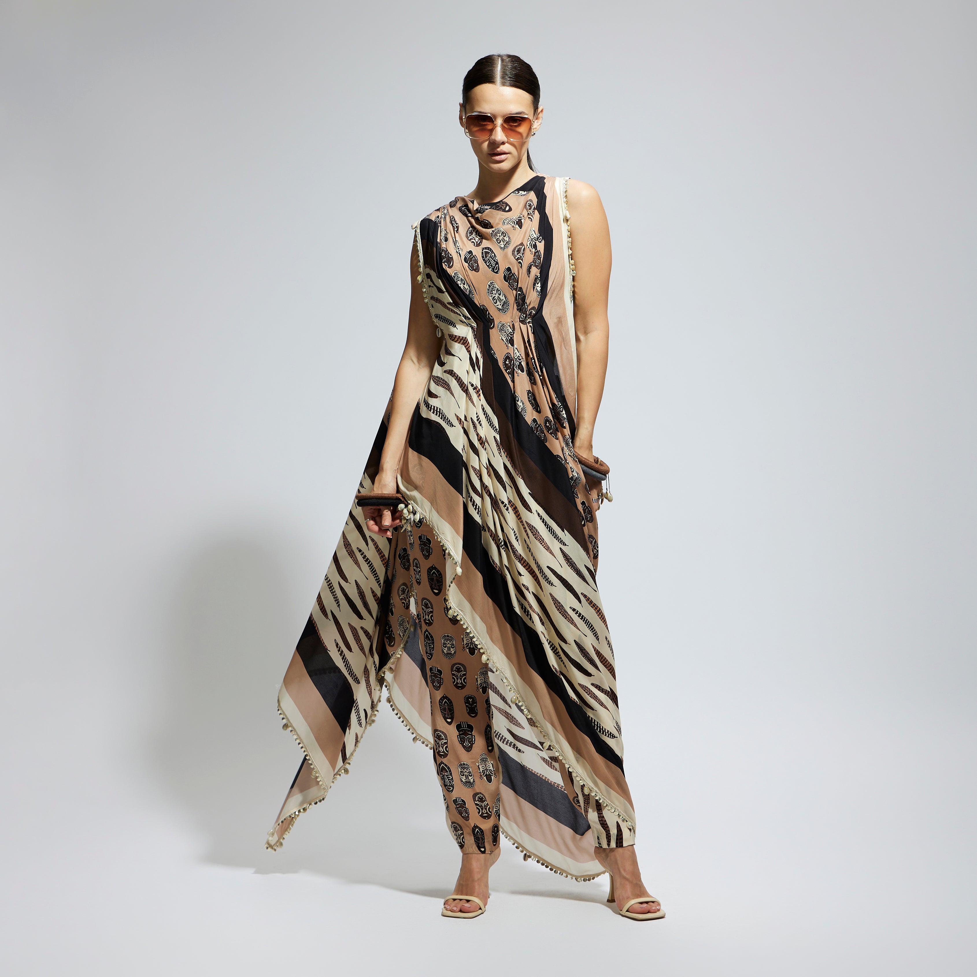 MASK AND FEATHER PRINT CROP TOP WITH ATTACHED DRAPE WITH PANTS