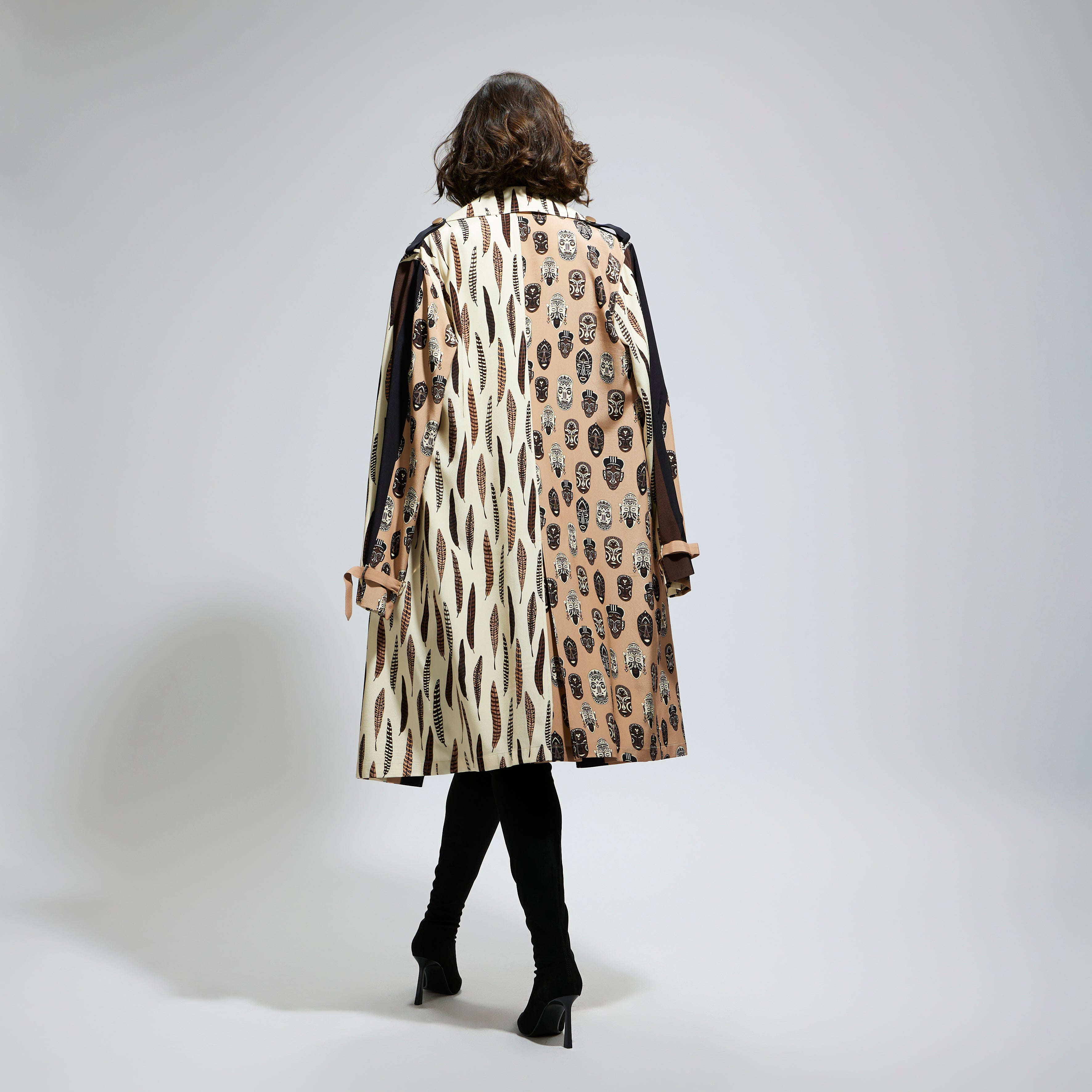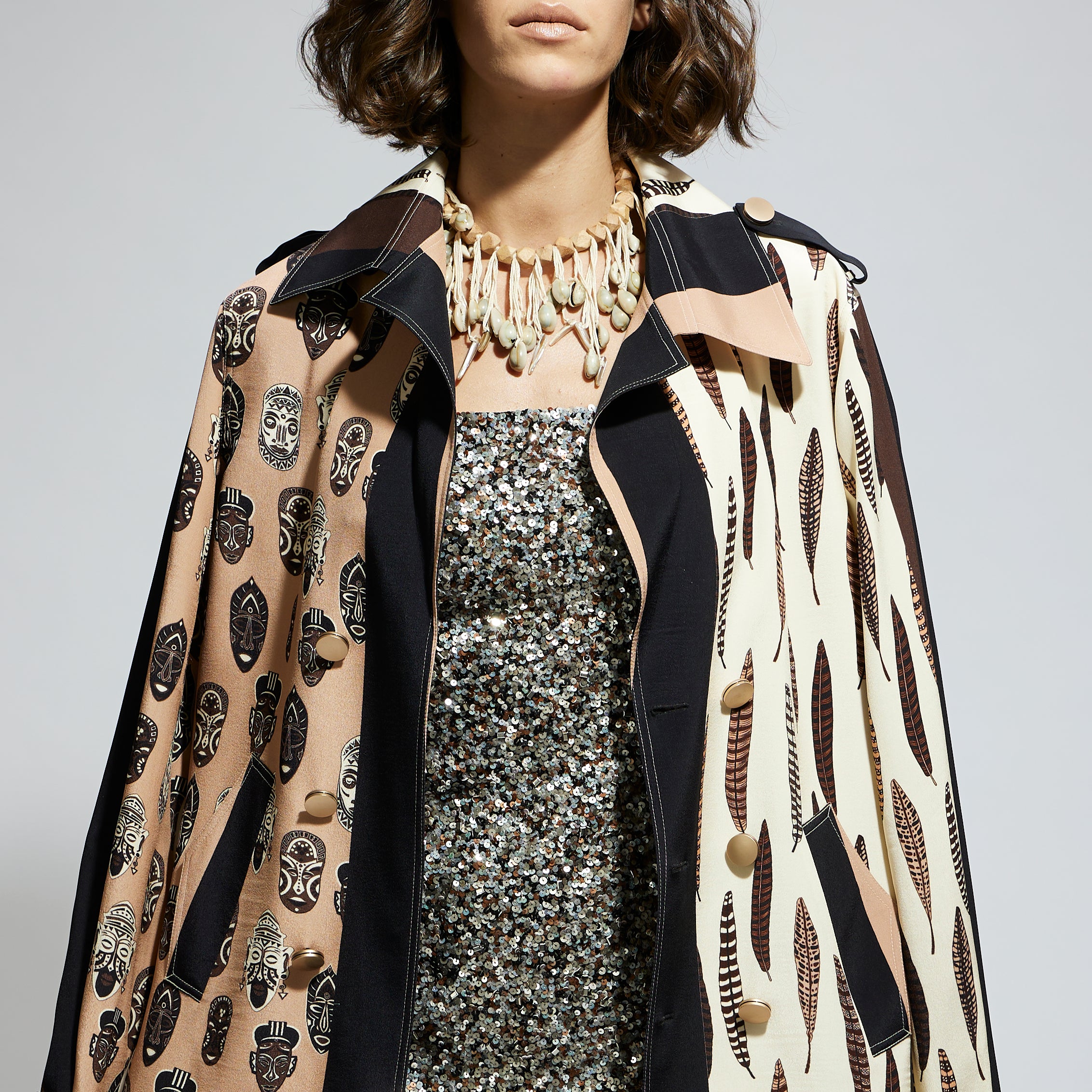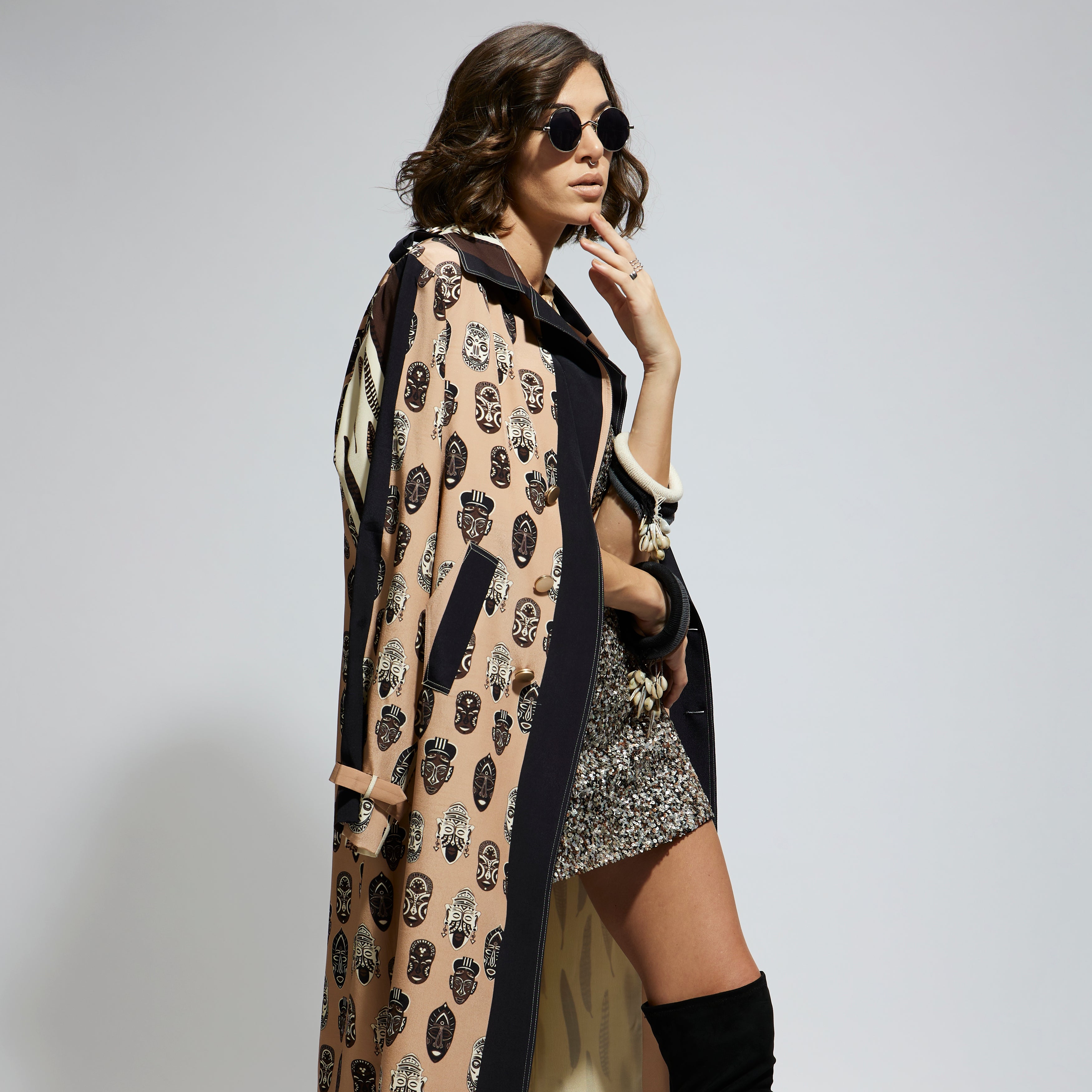 Featuring a mask and feather print trench coat, fabric Crepe, and Component 1.