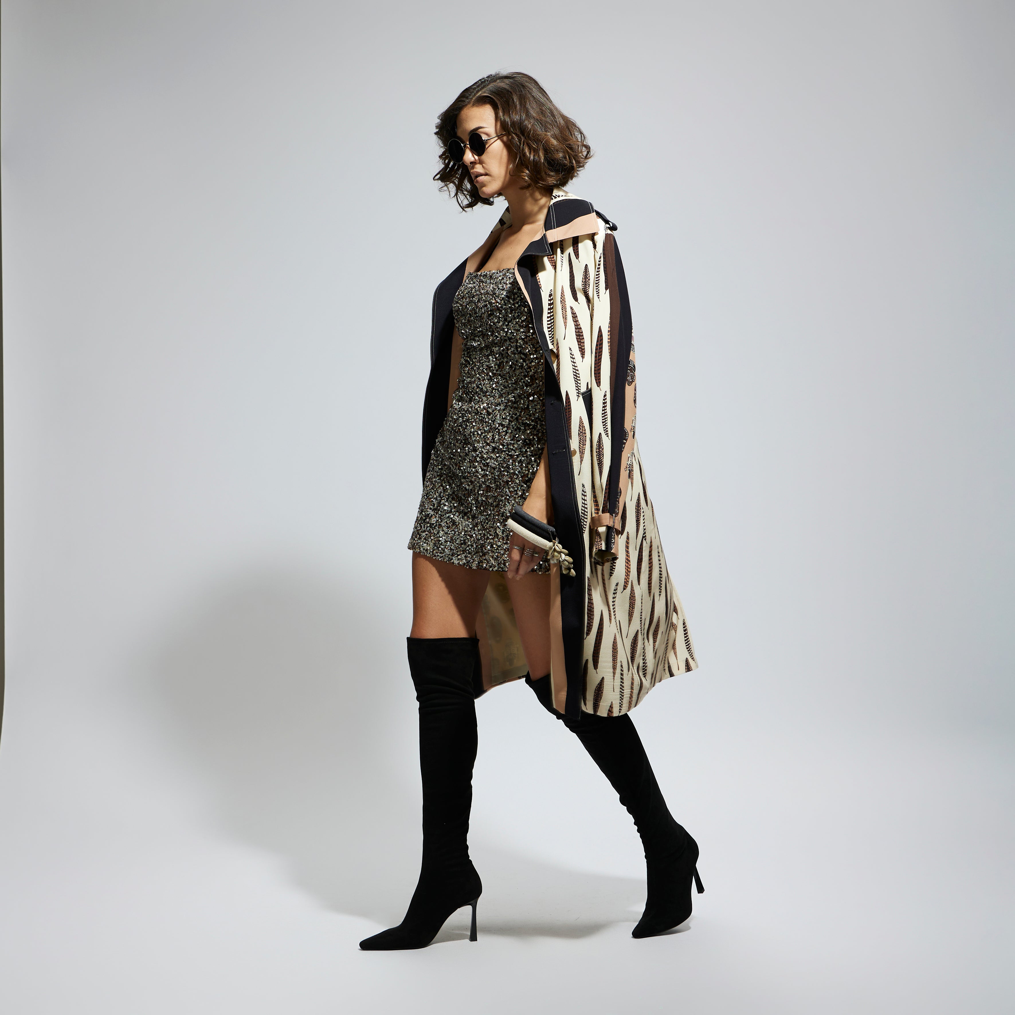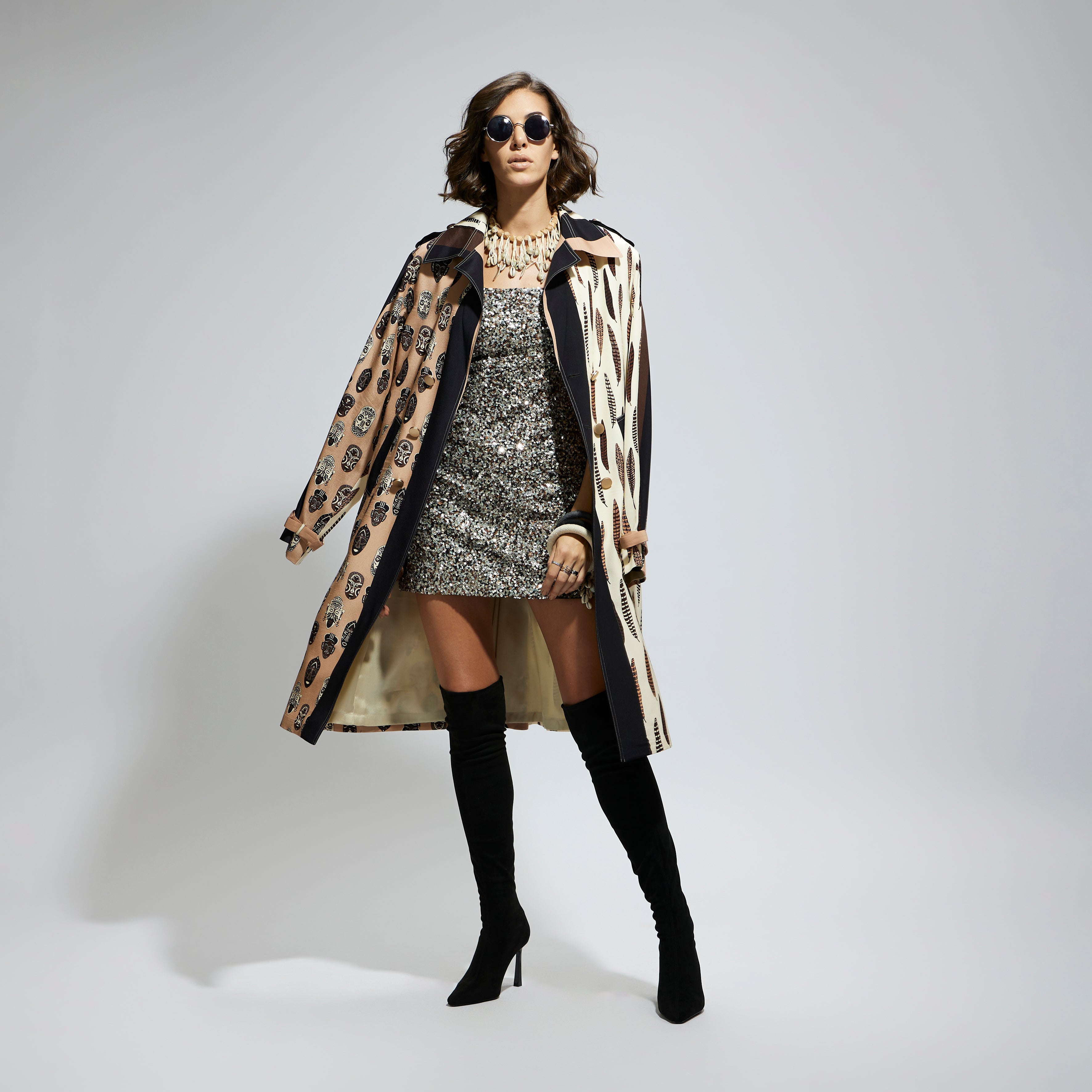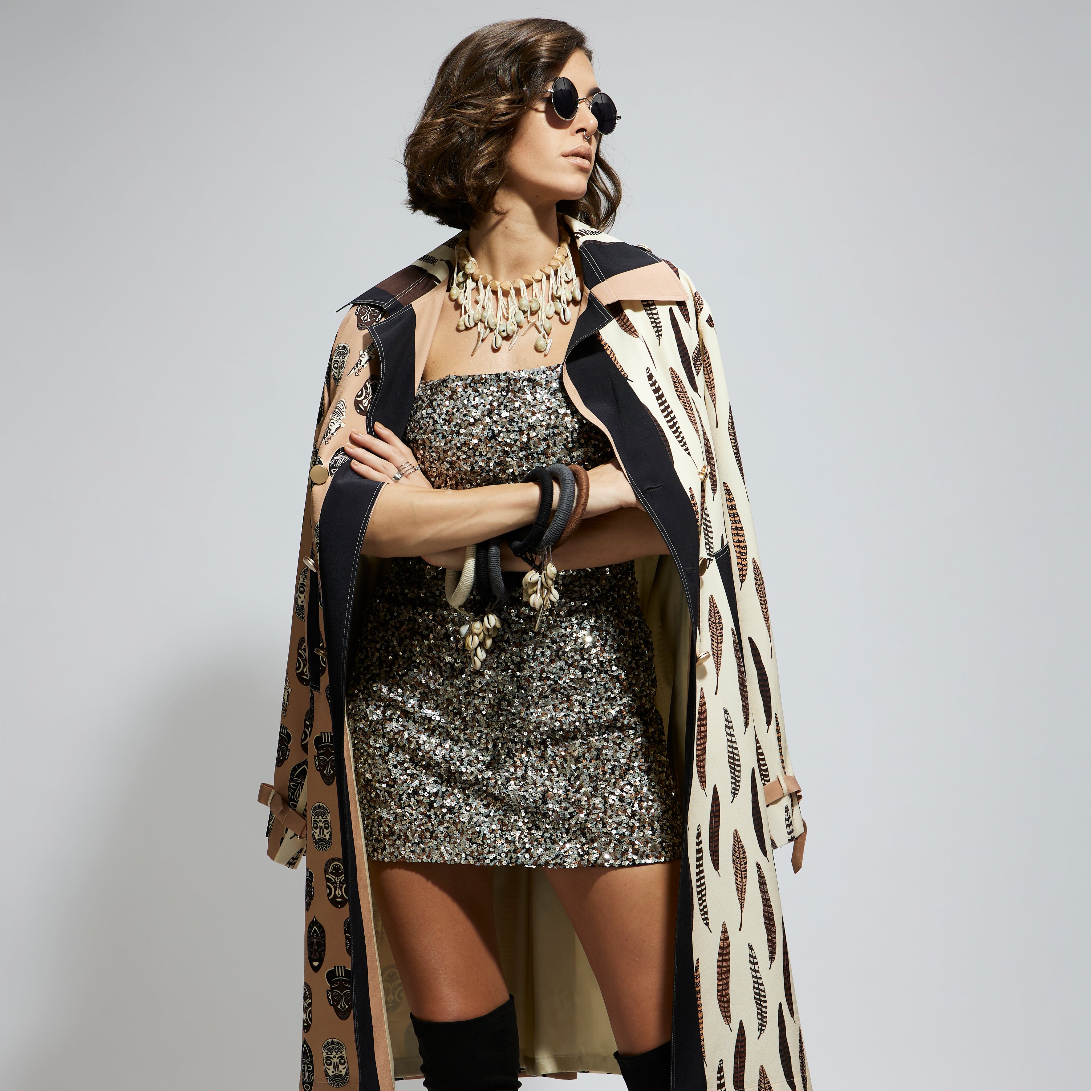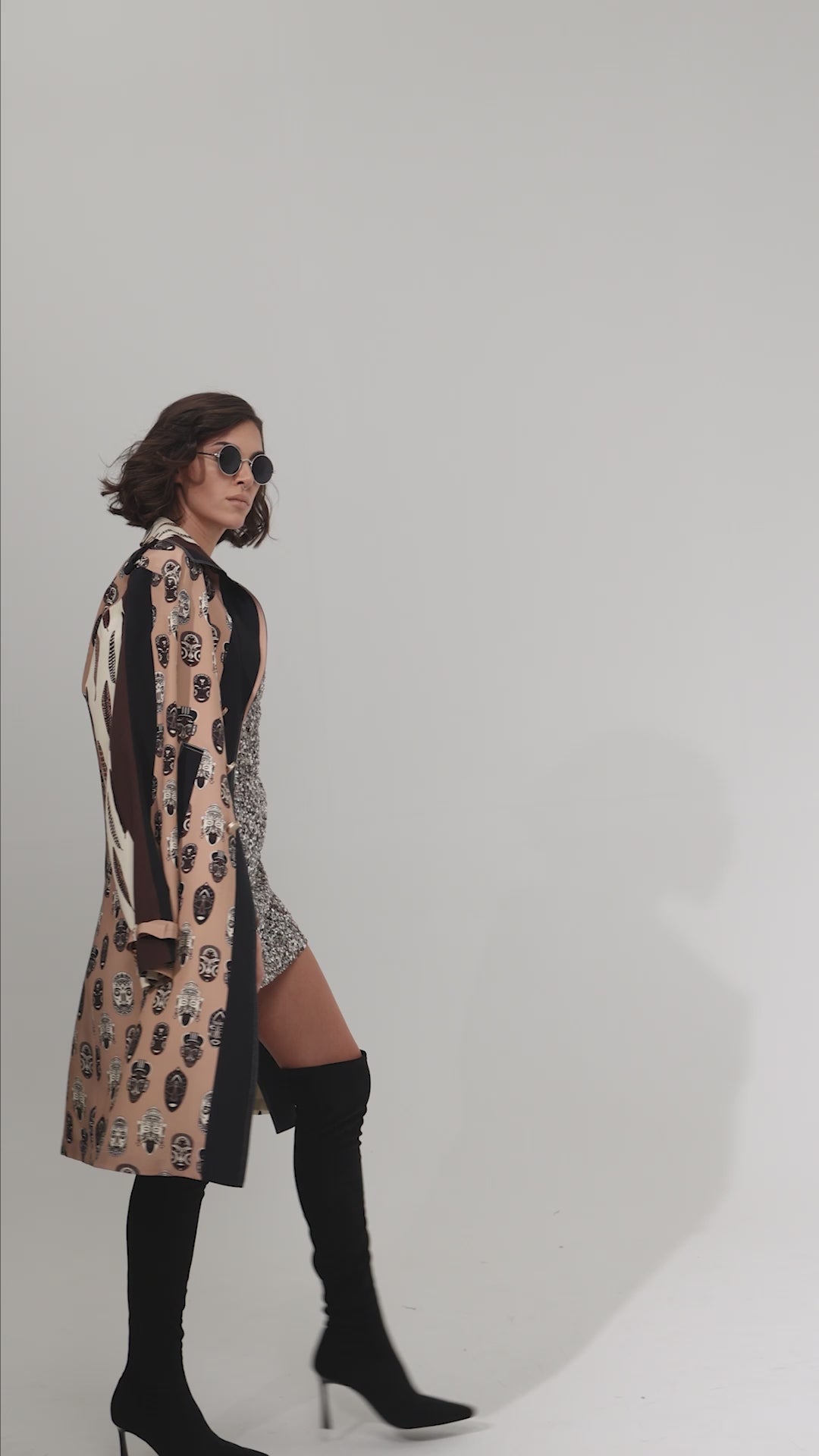 Featuring a mask and feather print trench coat, fabric Crepe, and Component 1.