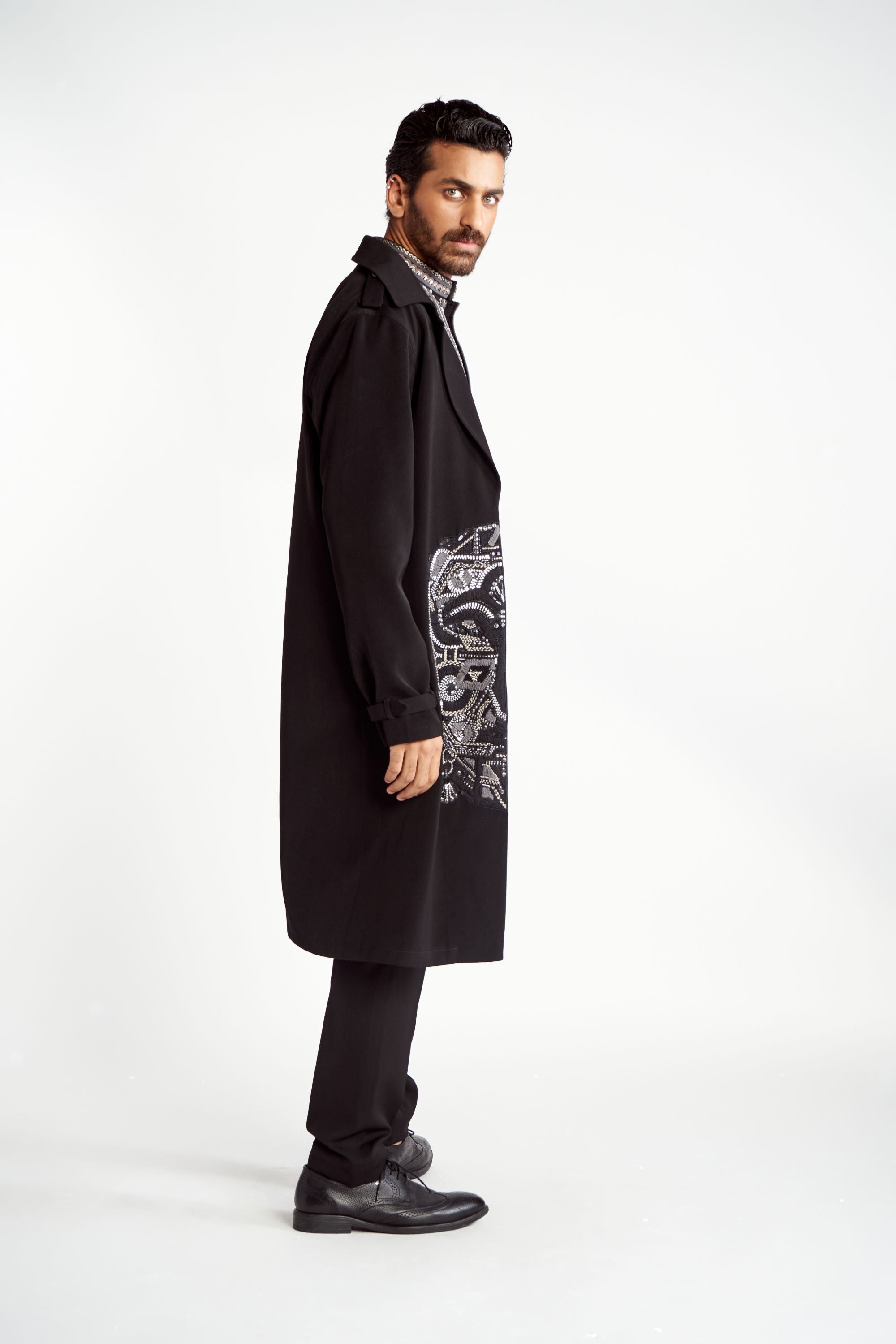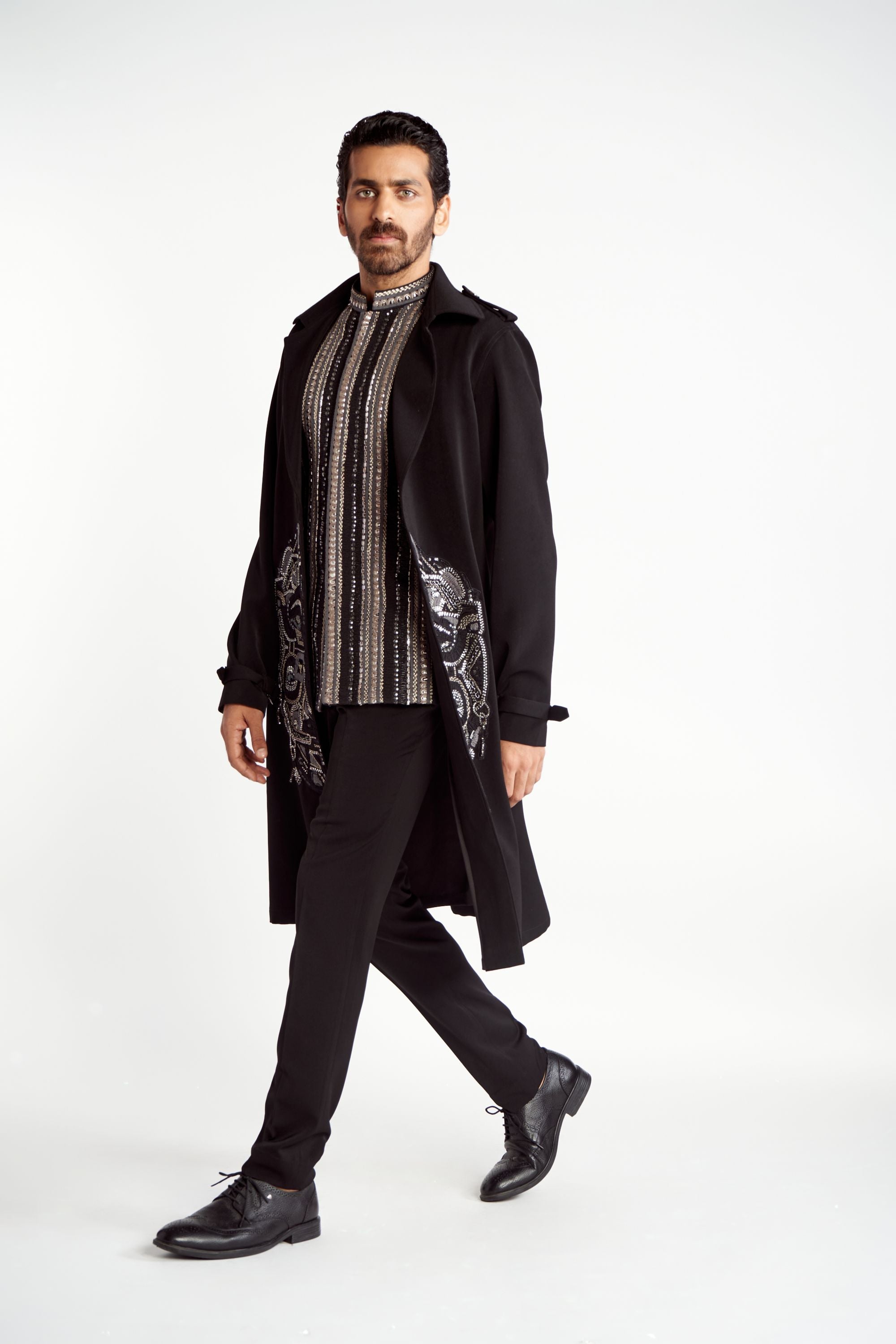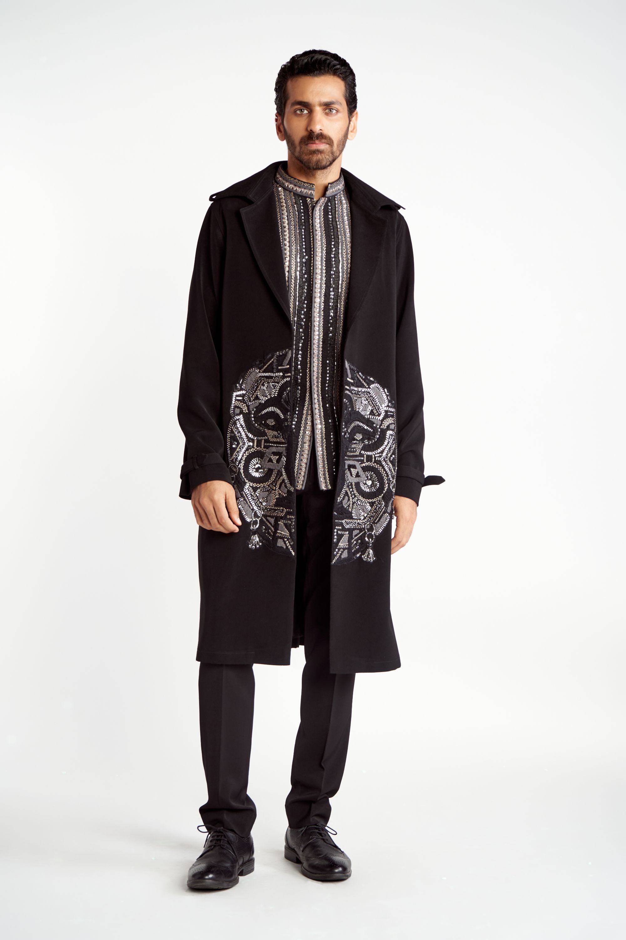 This ensemble features a Trench Coat, designed to make a bold fashion statement. The trench coat showcases the brand's iconic mask motif, intricately embroidered.