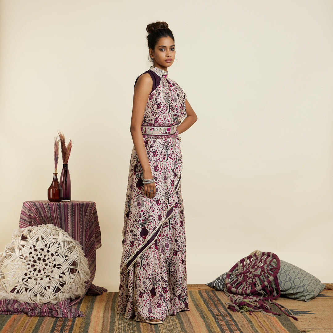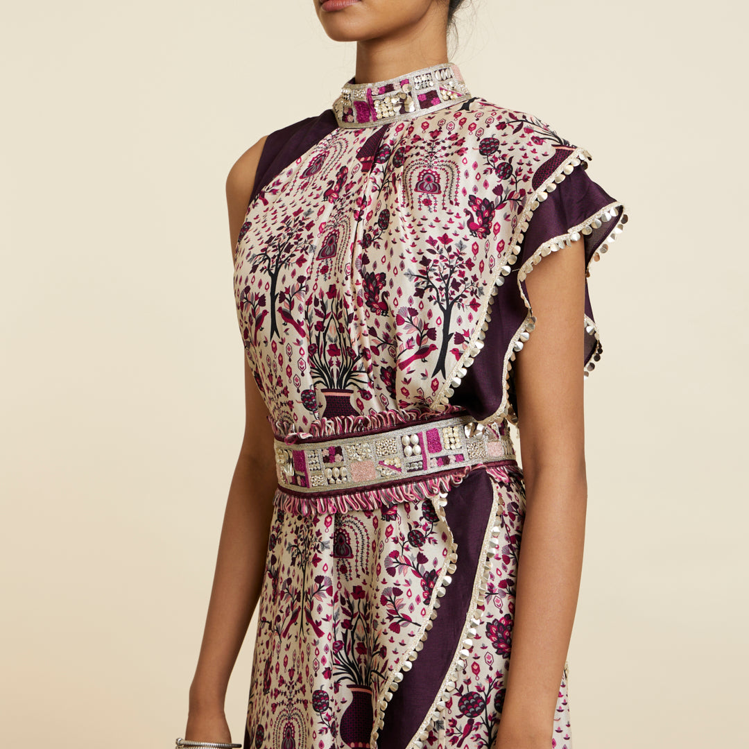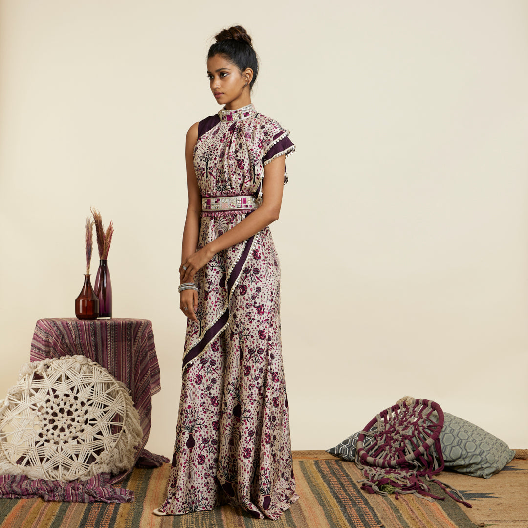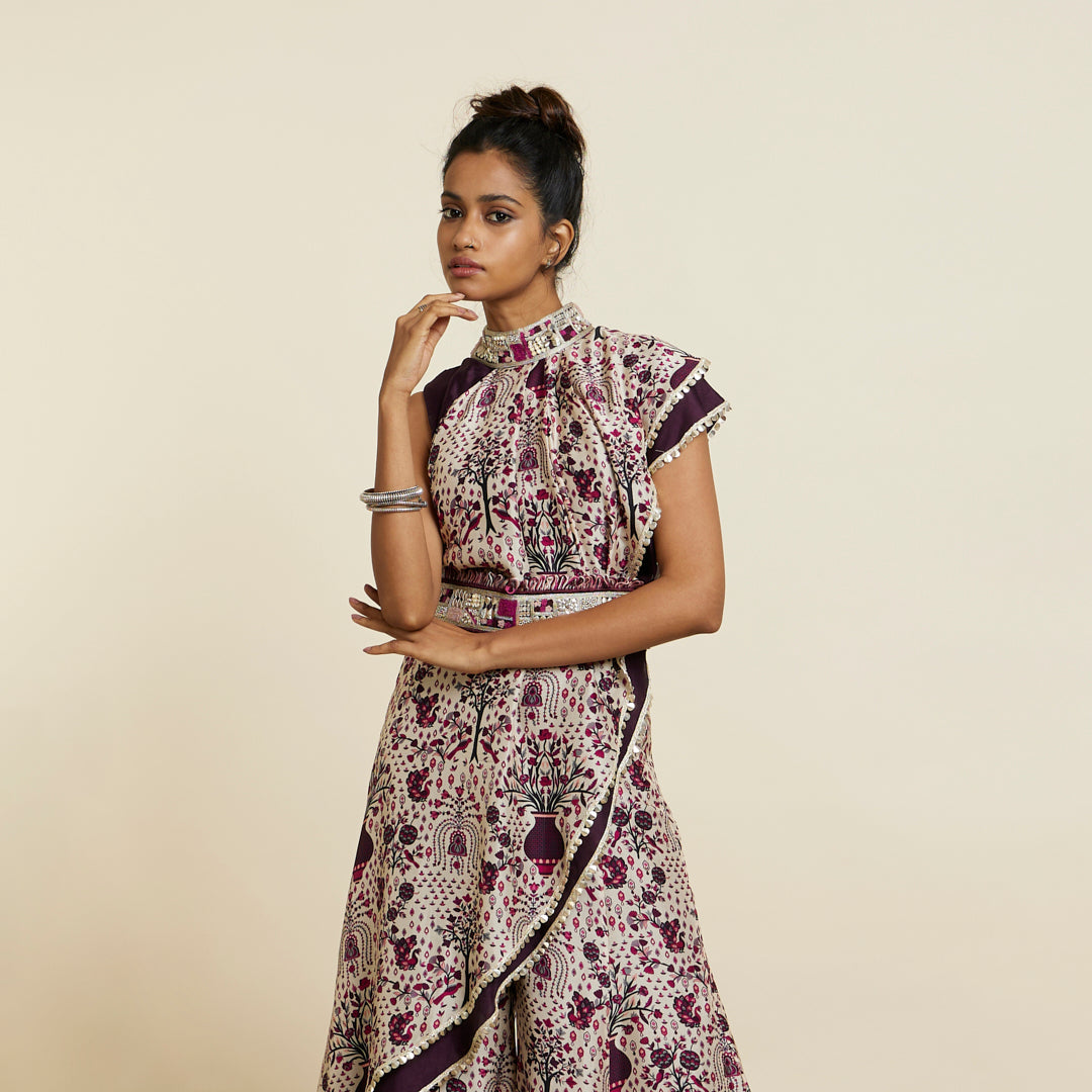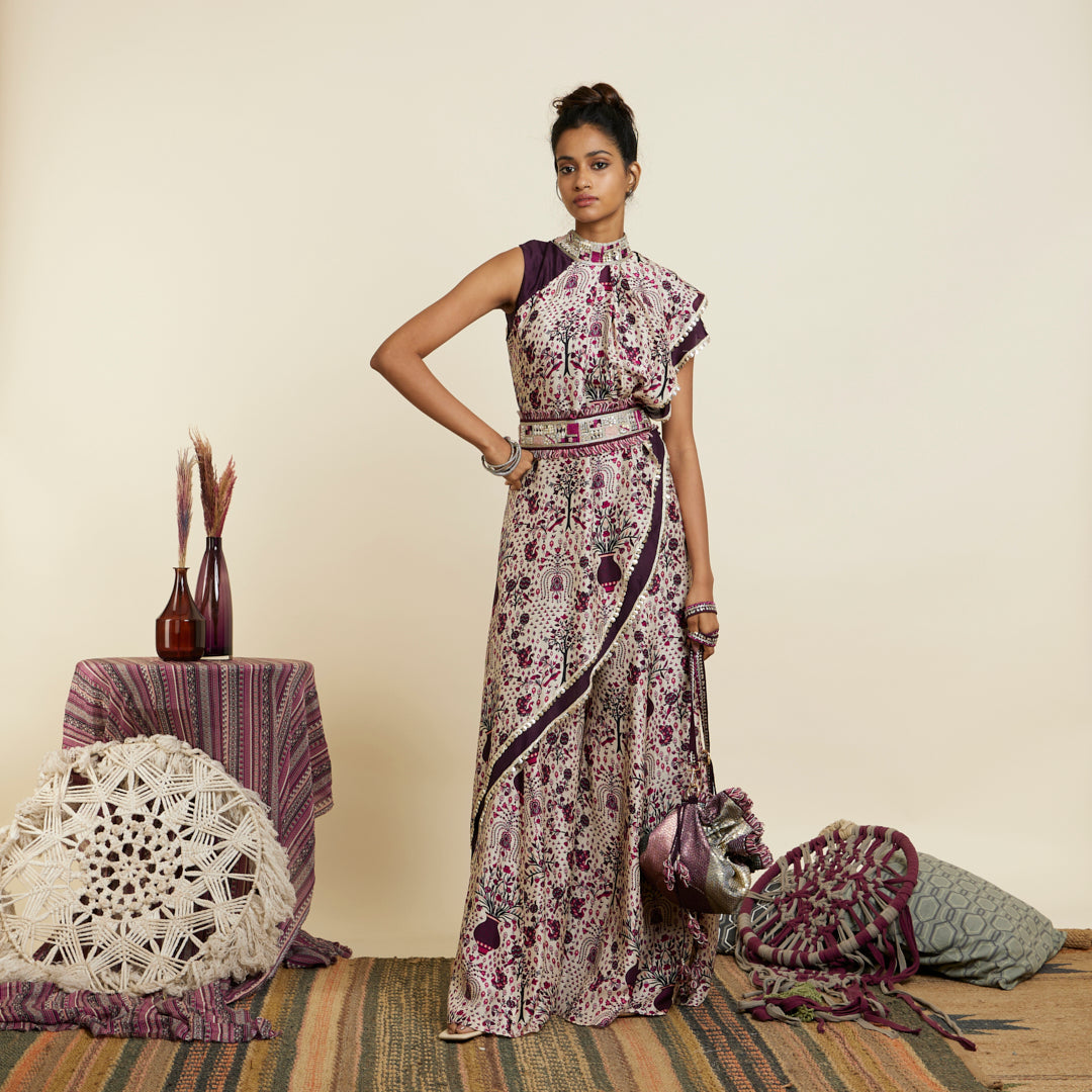 SAFAR MERLOT JAAL CROP TOP ATTACHED DRAPE WITH SHARARA PANTS