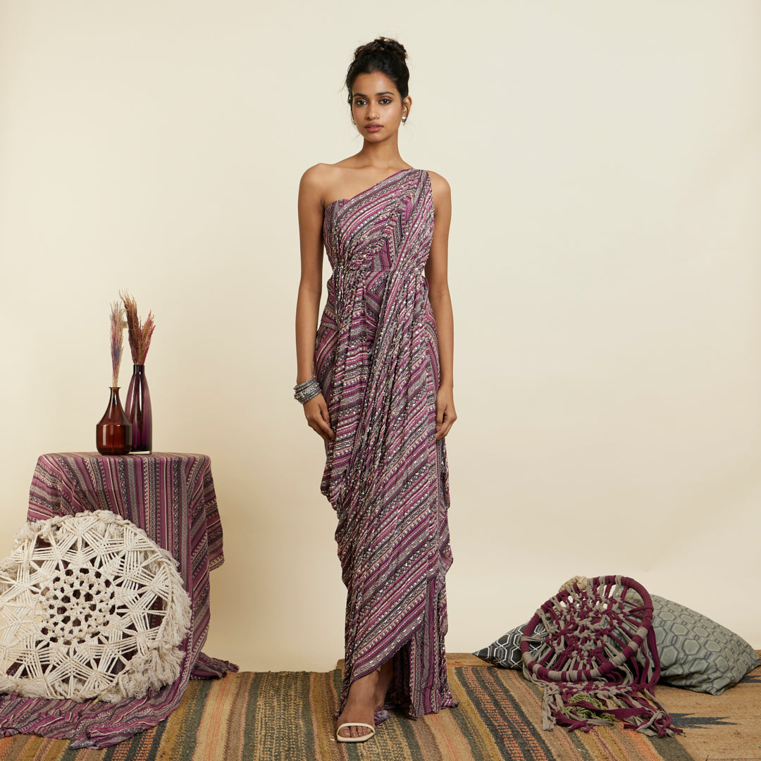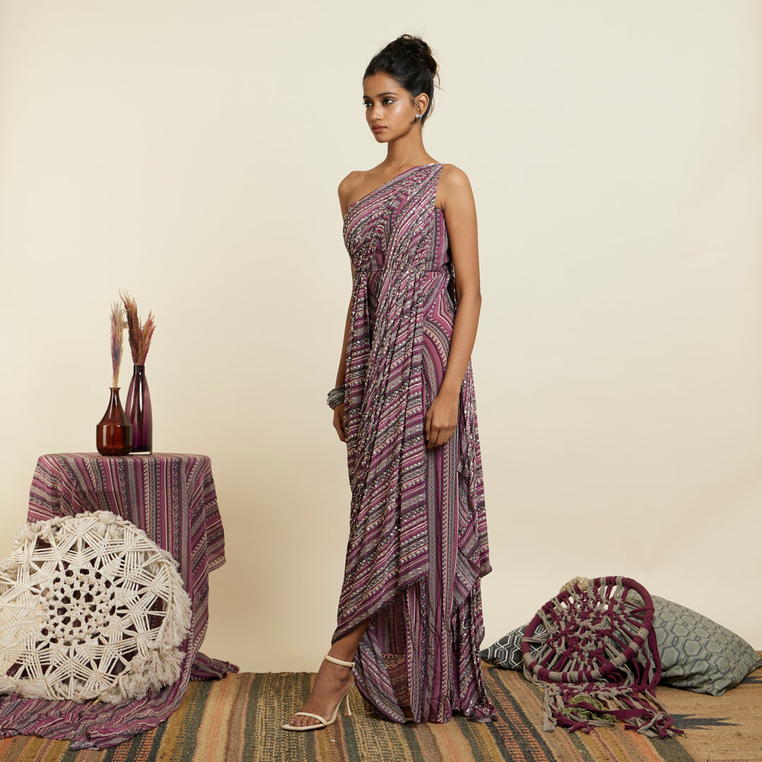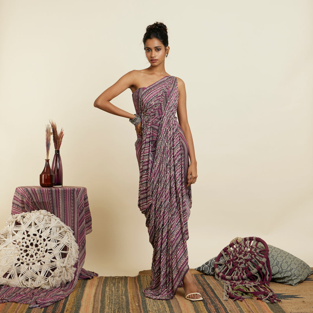 MERLOT BOHO STRIPE PRINT EMBELLISHED SAREE GOWN