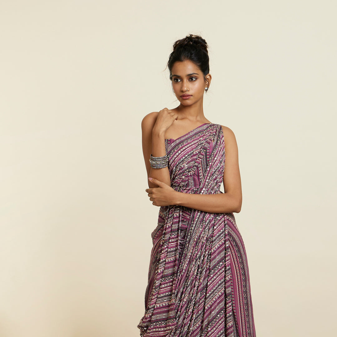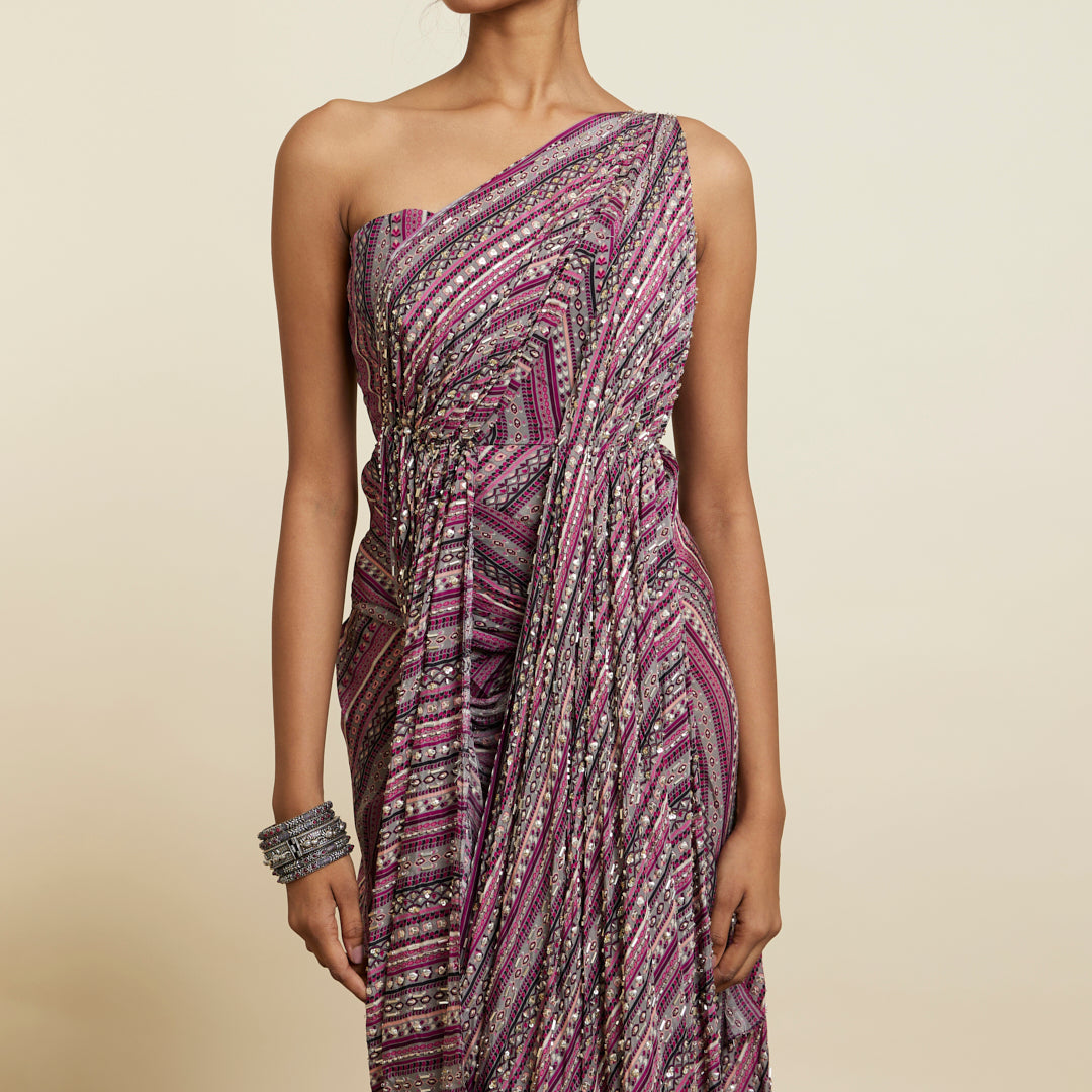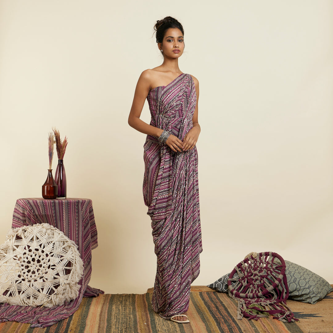 MERLOT BOHO STRIPE PRINT EMBELLISHED SAREE GOWN