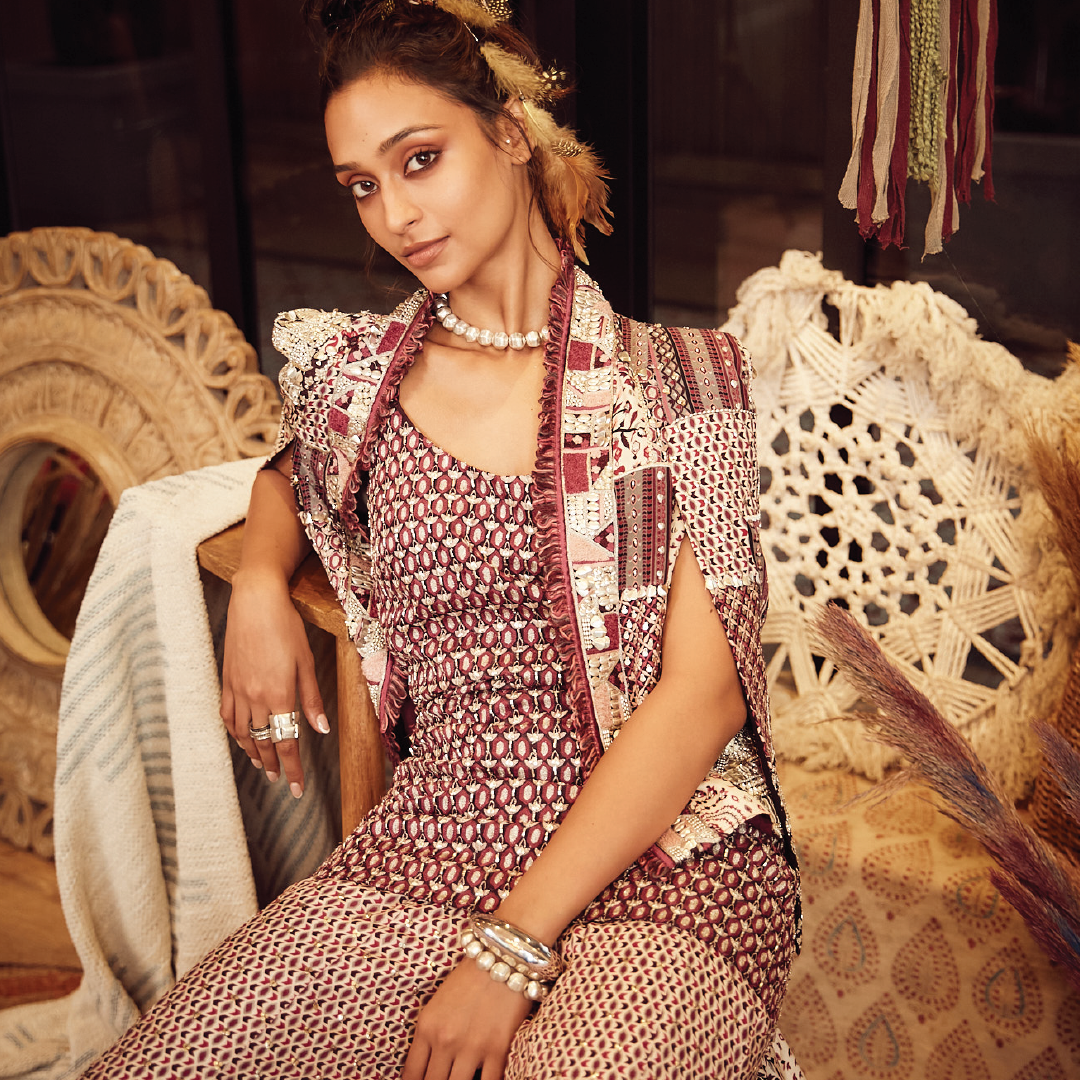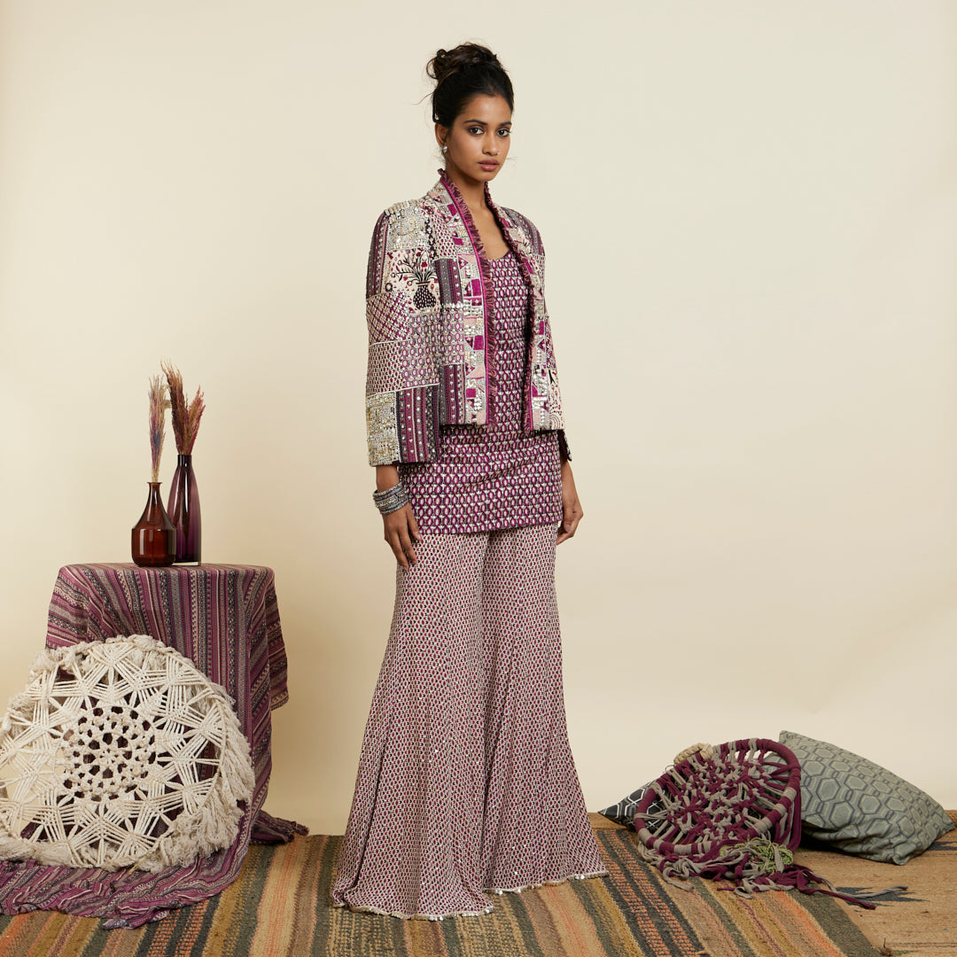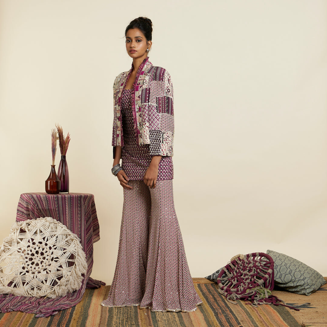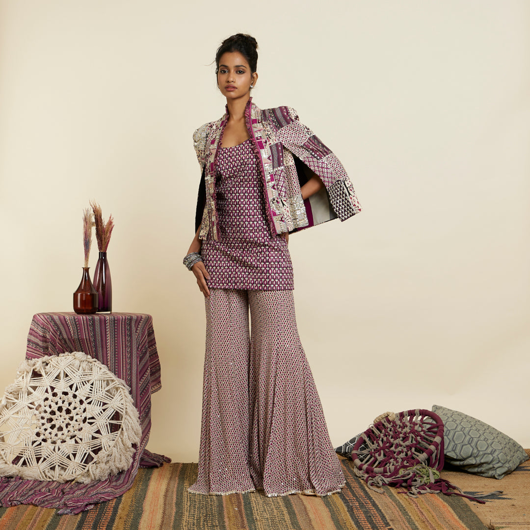 Featuring a merlot embellished camisole paired with metal accented sharara pants and an embellished patchwork noor jacket