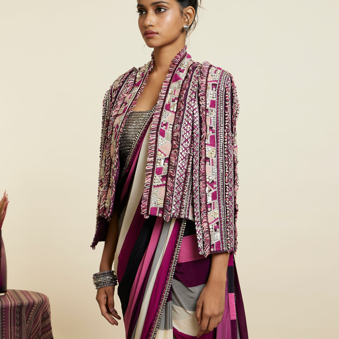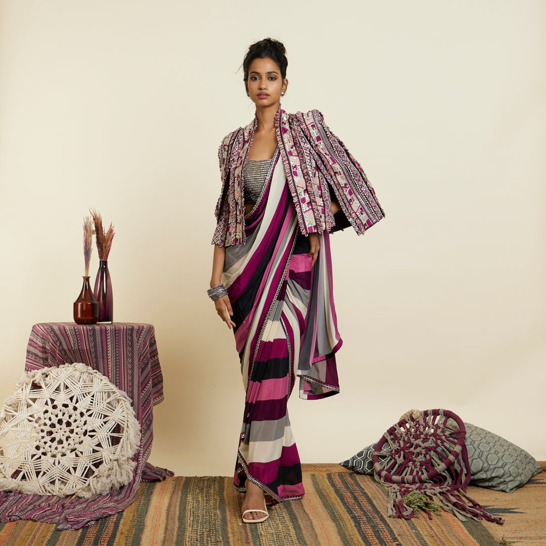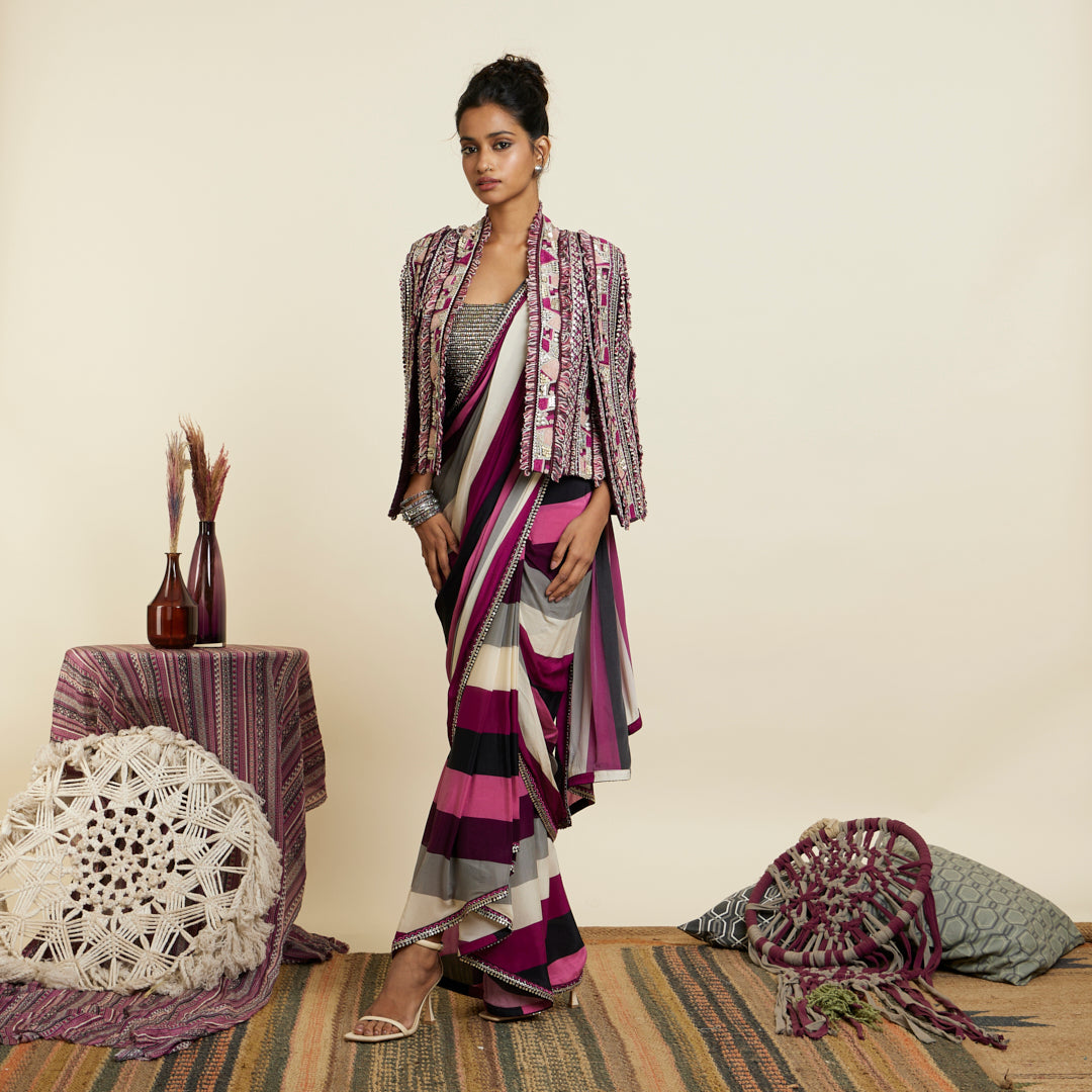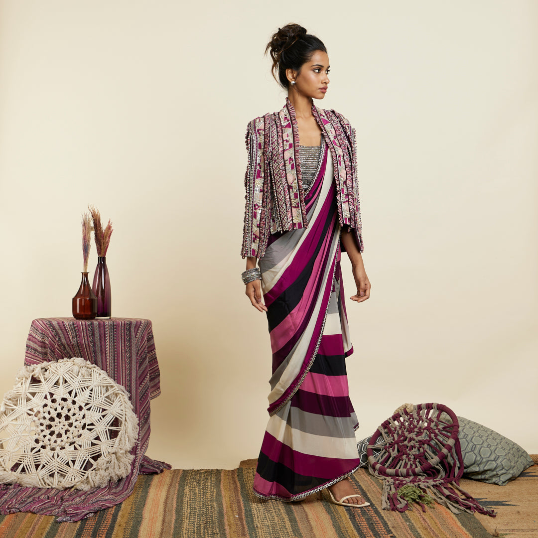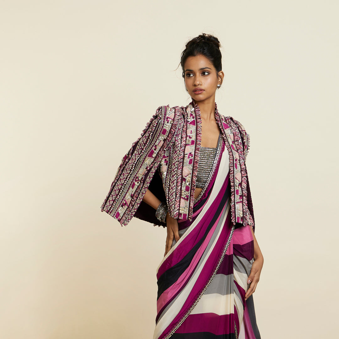 Featuring a merlot stripe print cascade saree paired with an embellished bustier and abstract noor jacket