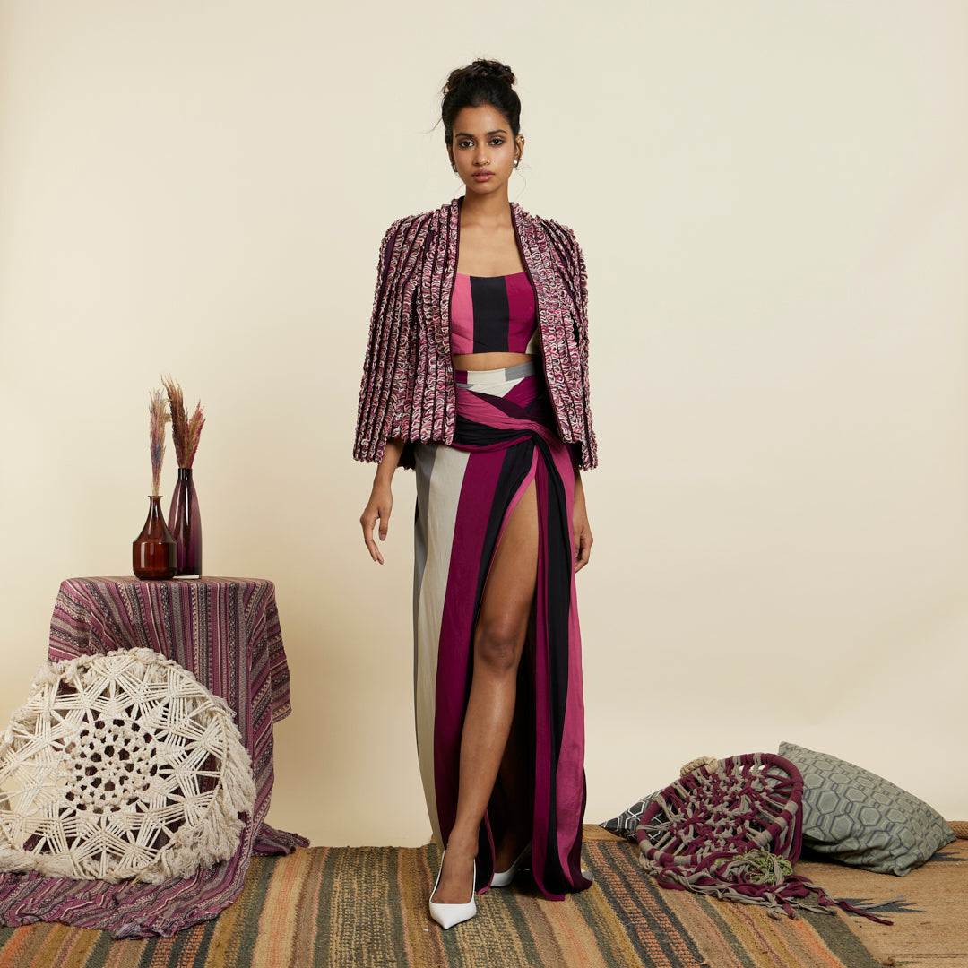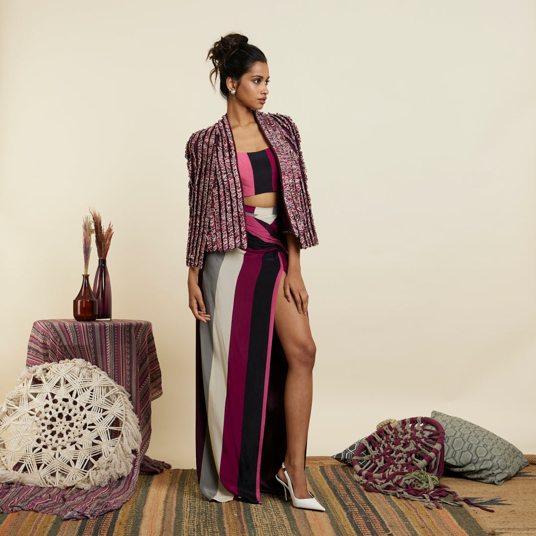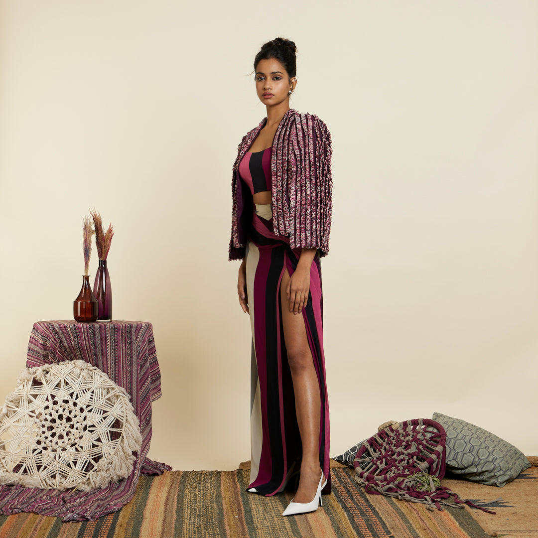 Featuring a merlot textured noor jacket paired with merlot stripe print bustier and side slit skirt