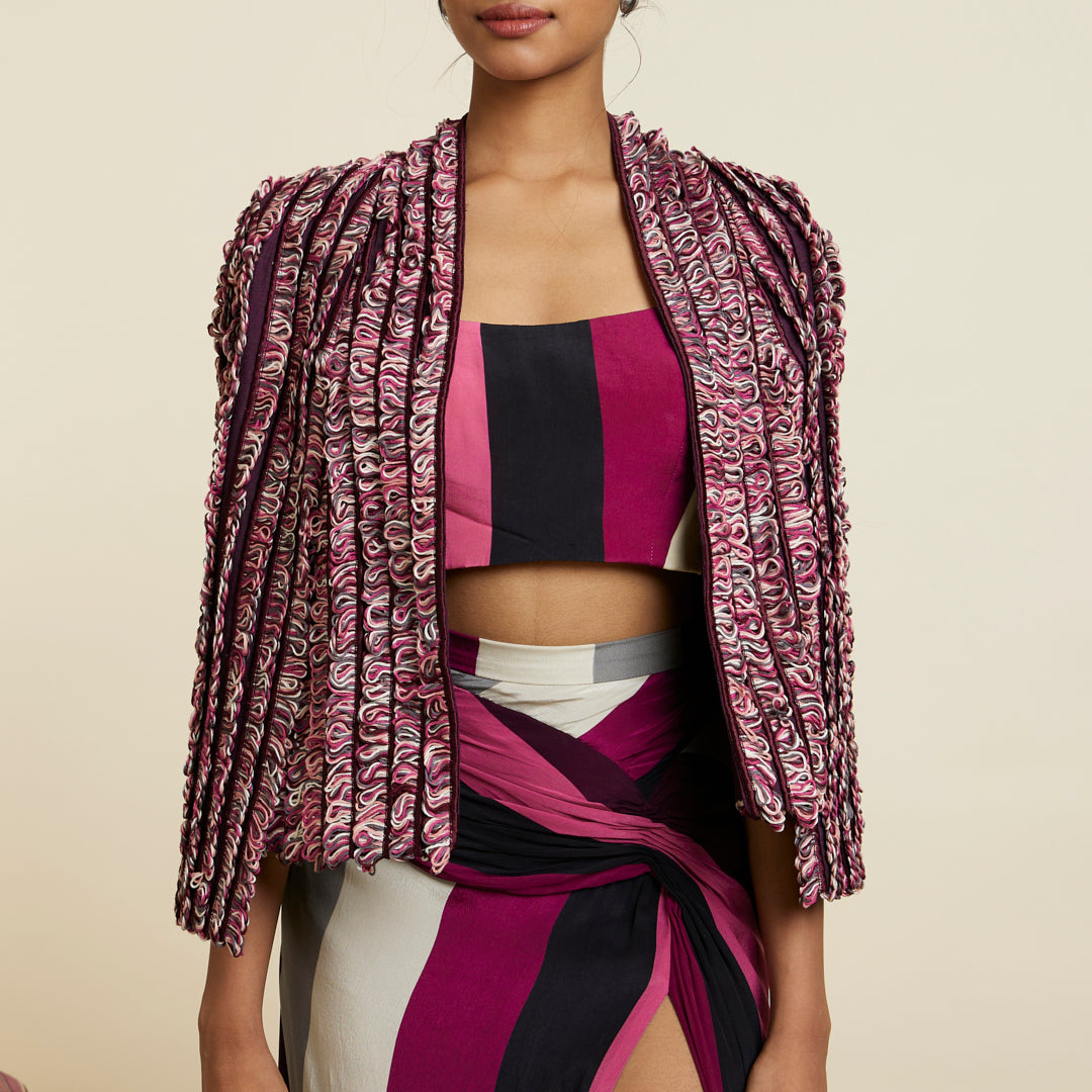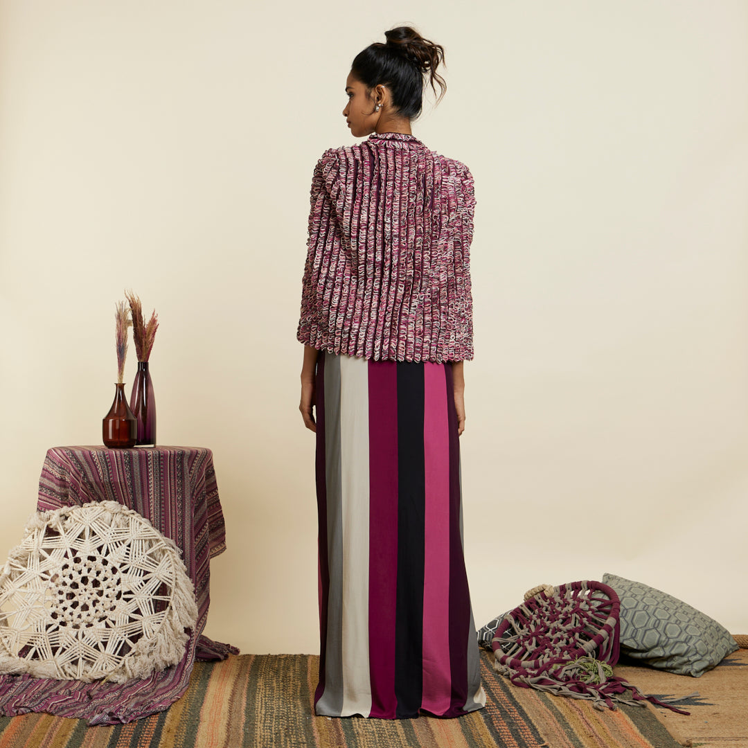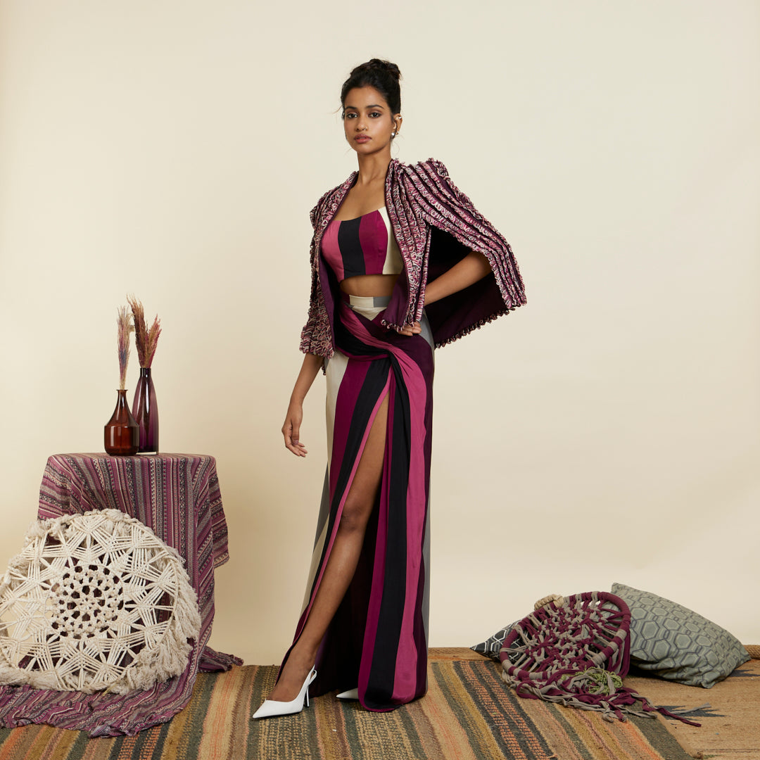 Featuring a merlot textured noor jacket paired with merlot stripe print bustier and side slit skirt