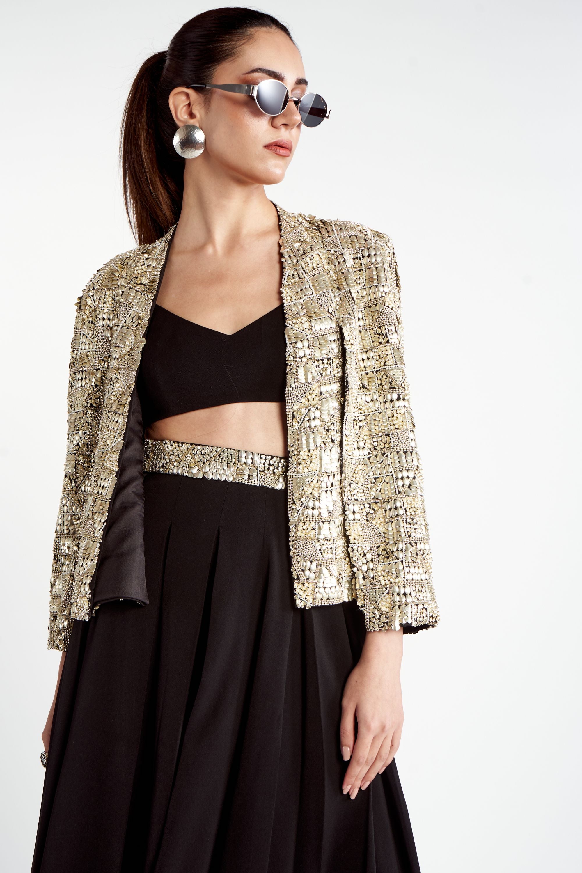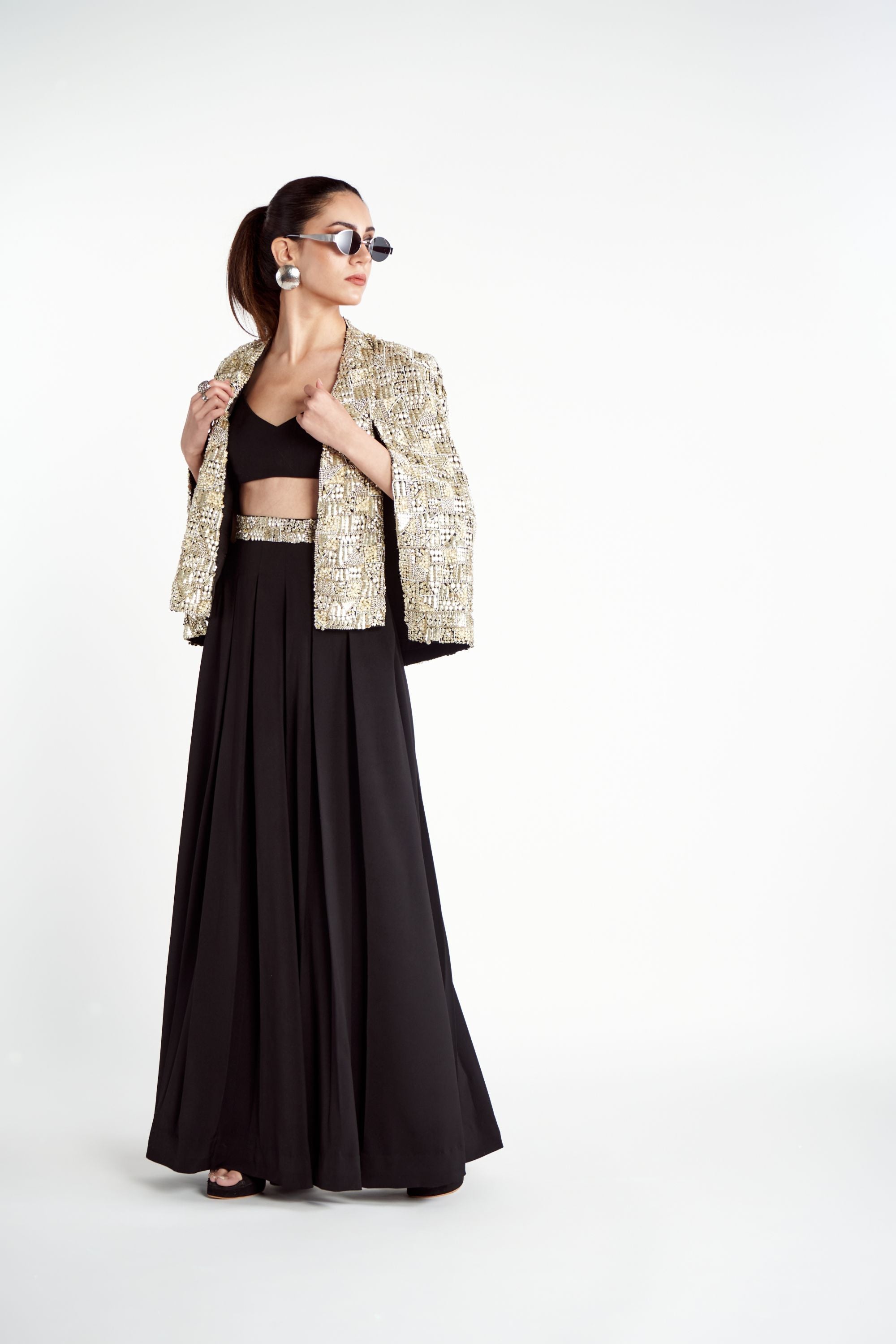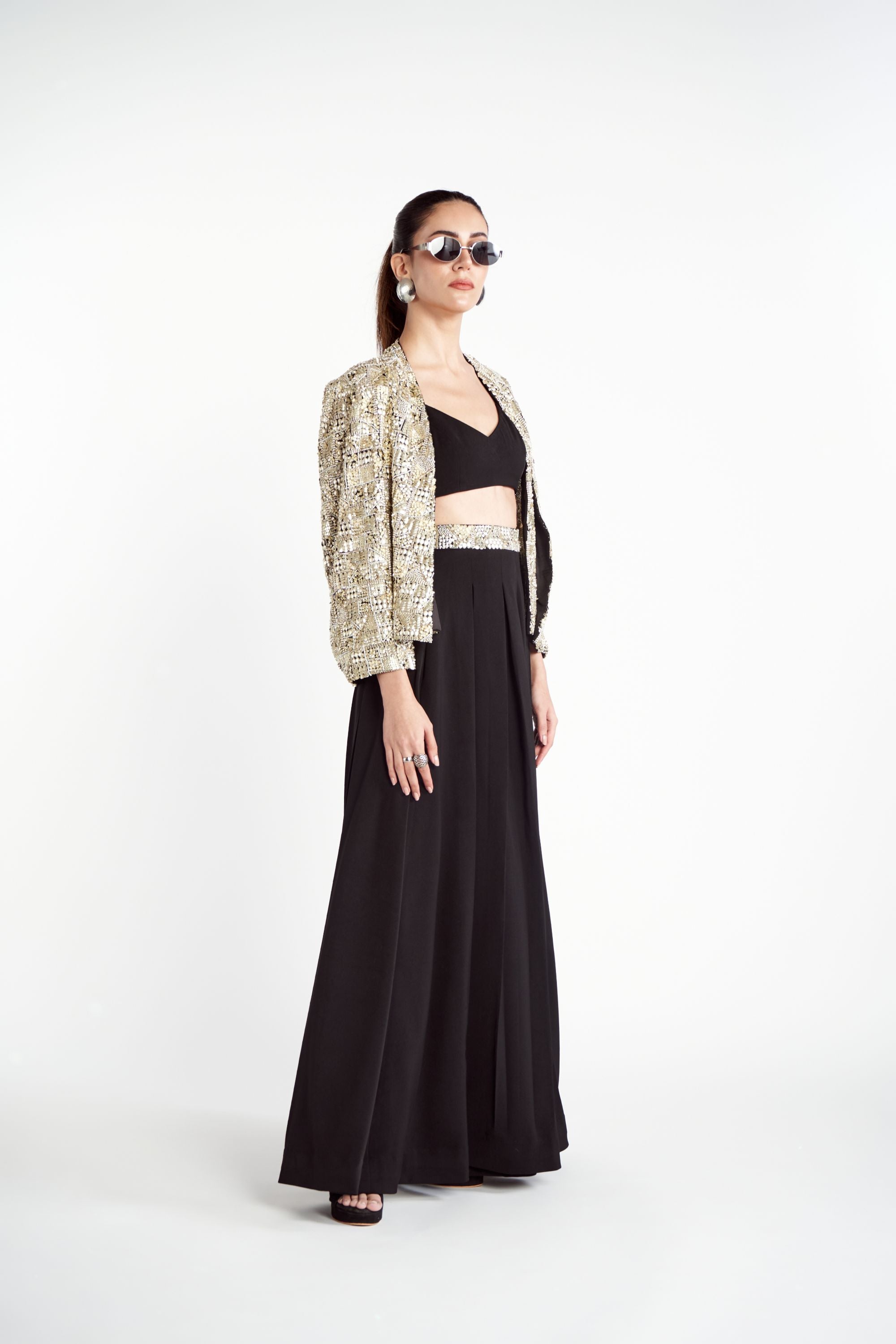 Make a powerful style statement with the Metallic Noor Jacket Set, a signature piece from the brand that exudes bold elegance. The jacket is a true work of art, fully adorned with intricate metallic embroidery and embellishments that catch the light beautifully. It is paired with a chic solid bralette and matching pants, featuring a waist belt that also boasts stunning metallic embroidery for a cohesive and striking look.