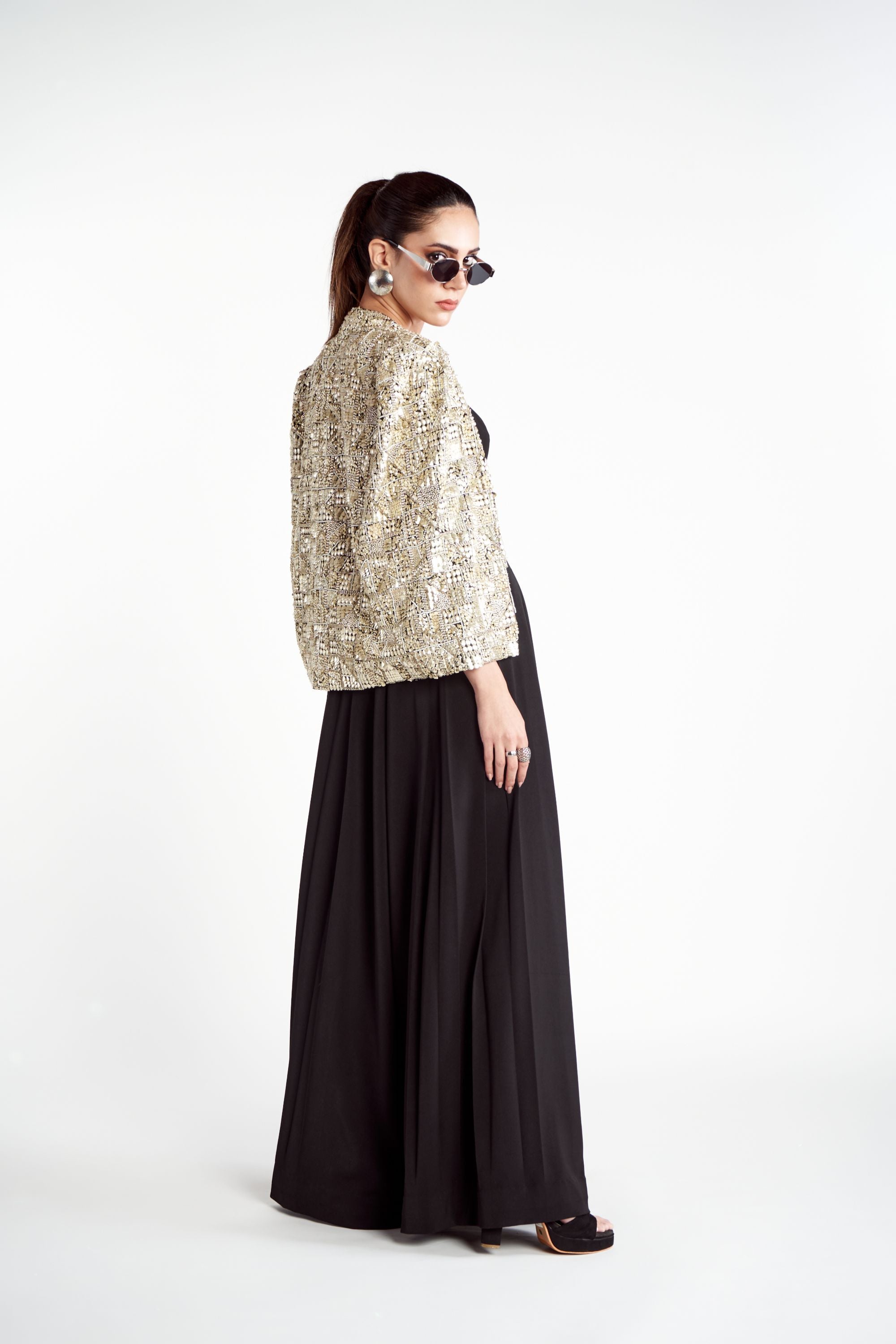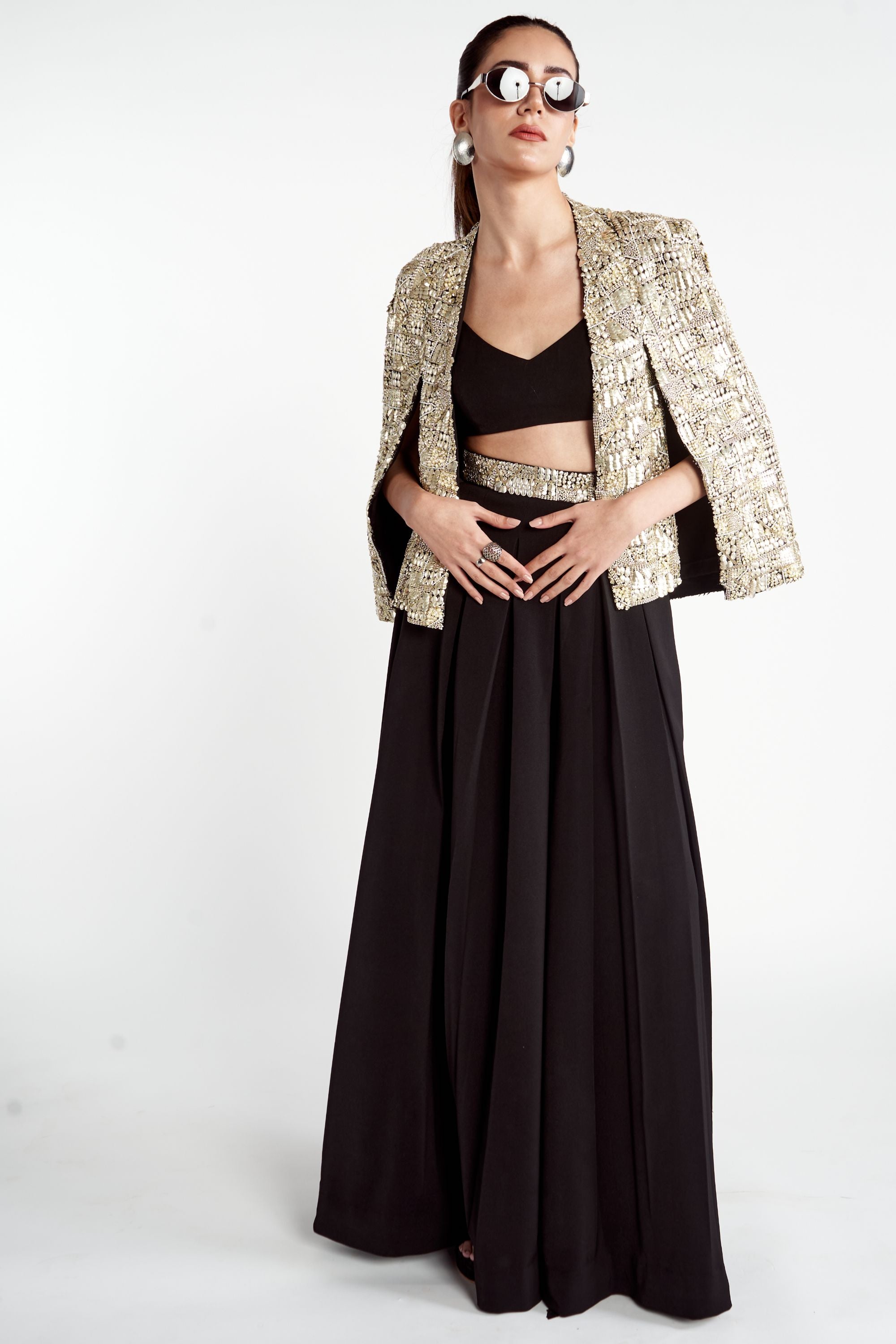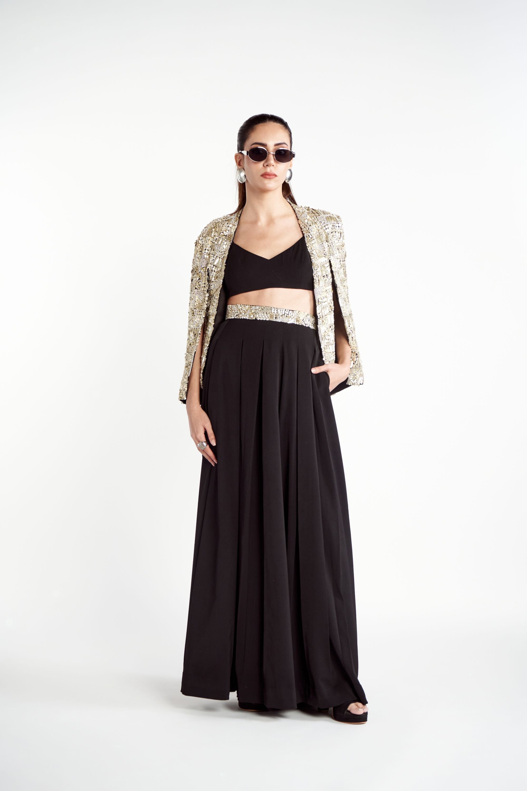 Make a powerful style statement with the Metallic Noor Jacket Set, a signature piece from the brand that exudes bold elegance. The jacket is a true work of art, fully adorned with intricate metallic embroidery and embellishments that catch the light beautifully. It is paired with a chic solid bralette and matching pants, featuring a waist belt that also boasts stunning metallic embroidery for a cohesive and striking look.