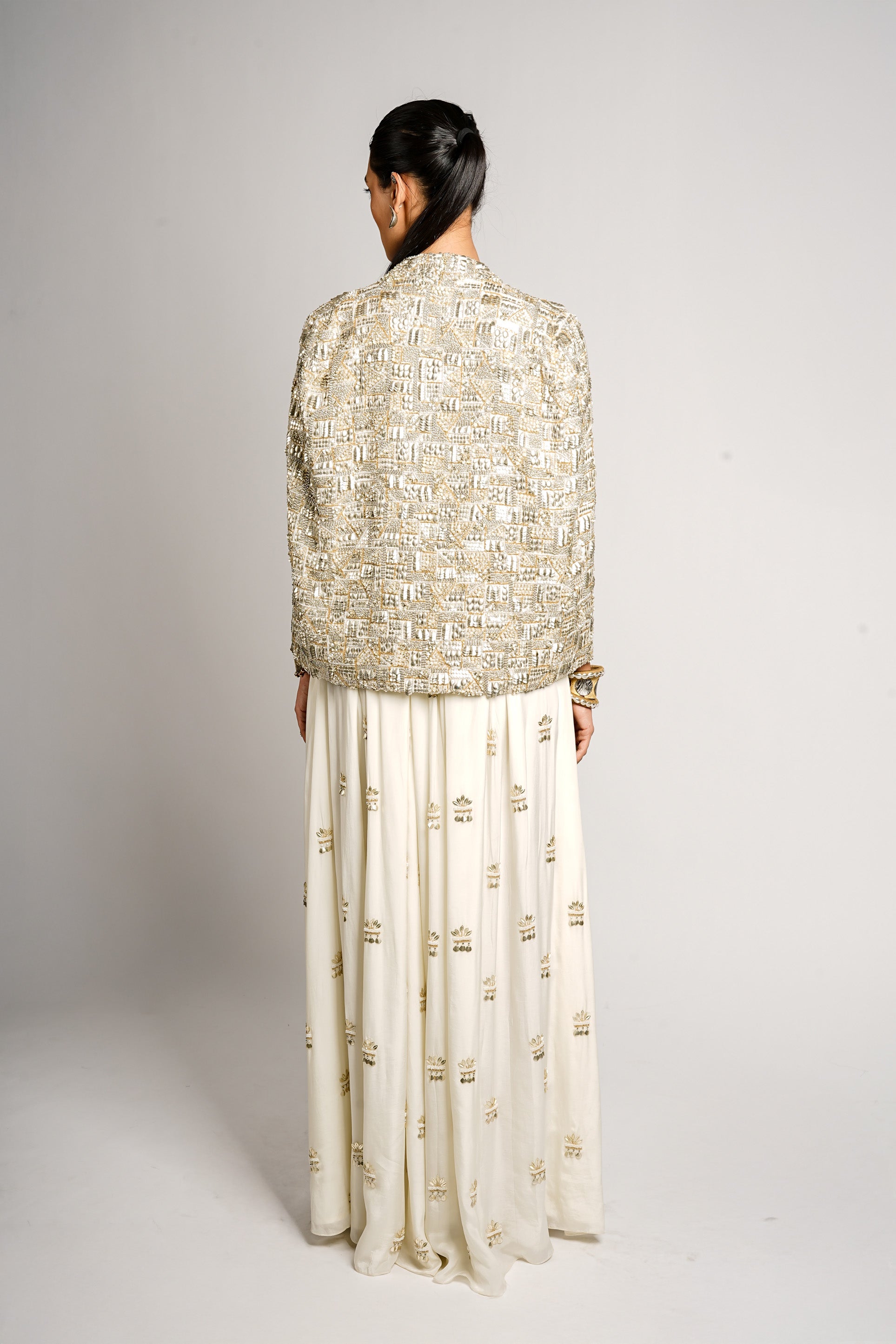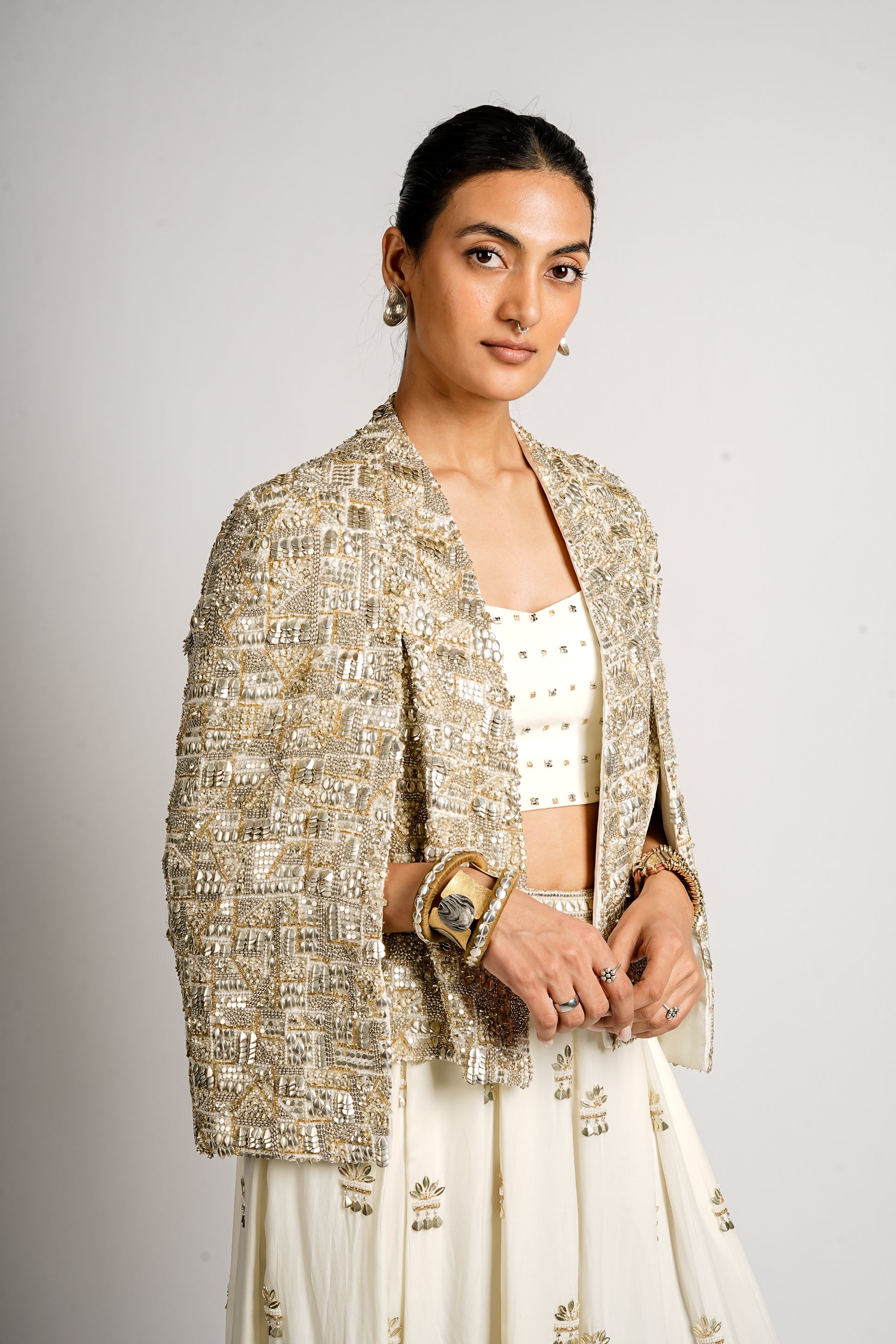 MIRAYA EMBELLISHED CAPE JACKET WITH BUSTIER AND FLARED PANT
